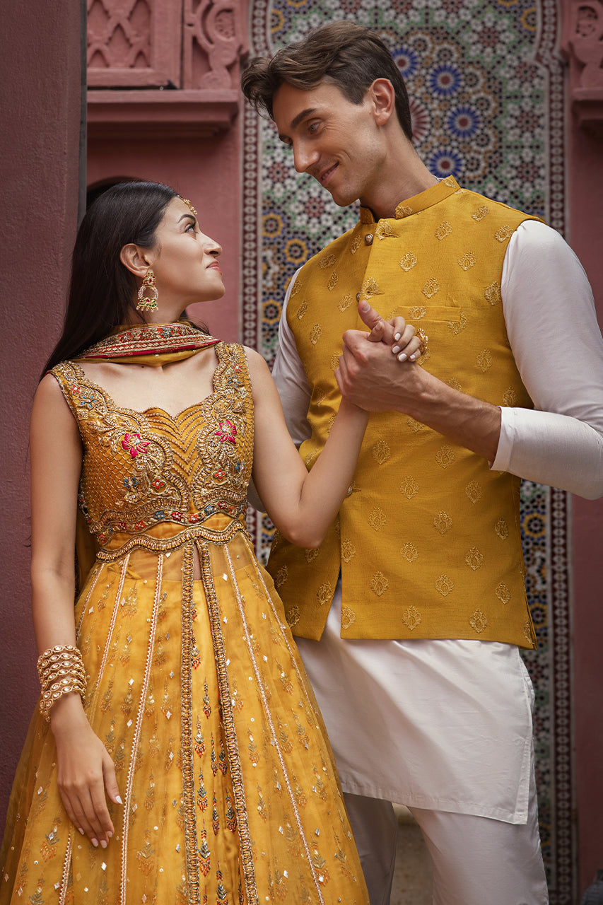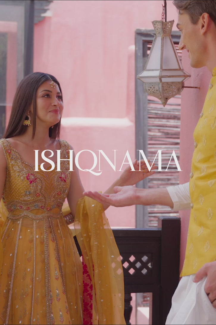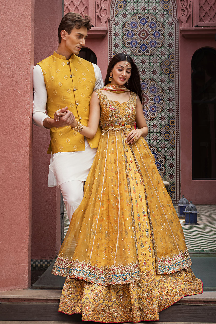 Drenched in the warm hues of tradition and adorned with intricate artistry, Mystic Marigold's mehndi ensemble embodies timeless elegance. The mustard digital print lehenga pairs seamlessly with the pure organza embellished gown, where delicate sequins spin stories of celebration. A hand-embroidered dupatta drapes over this masterpiece, paying homage to craftsmanship.