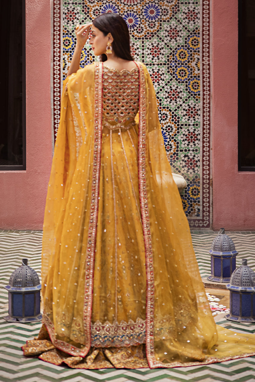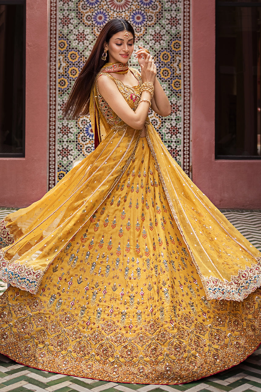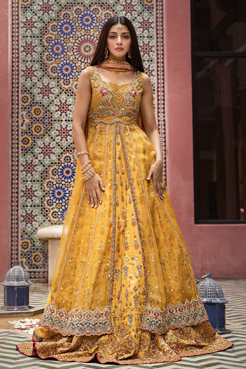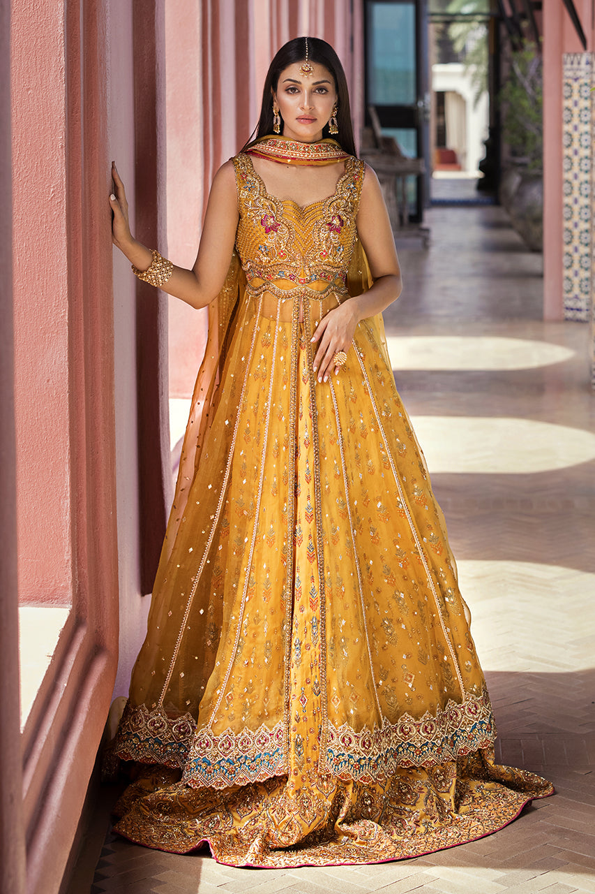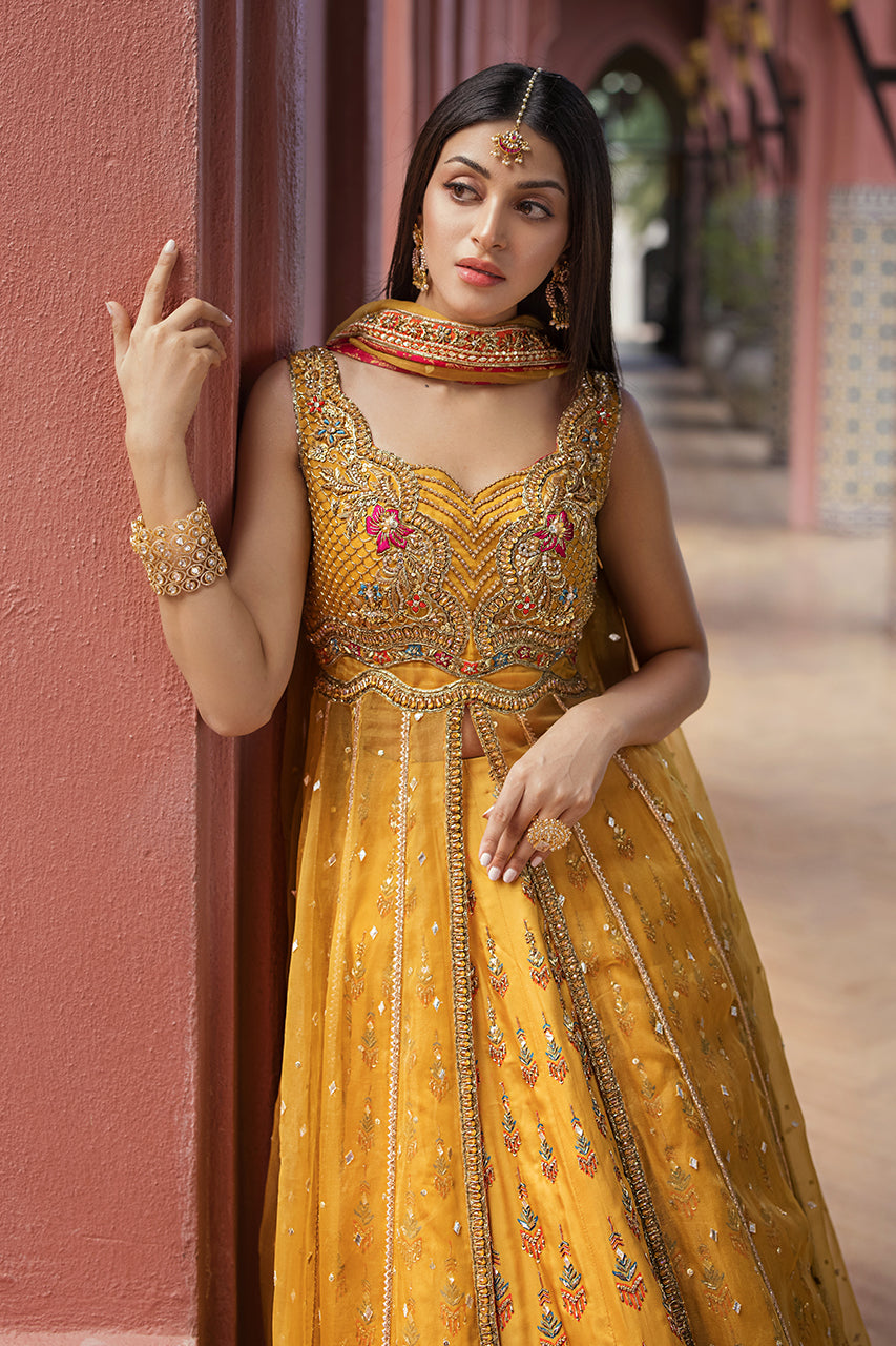 Drenched in the warm hues of tradition and adorned with intricate artistry, Mystic Marigold's mehndi ensemble embodies timeless elegance. The mustard digital print...
