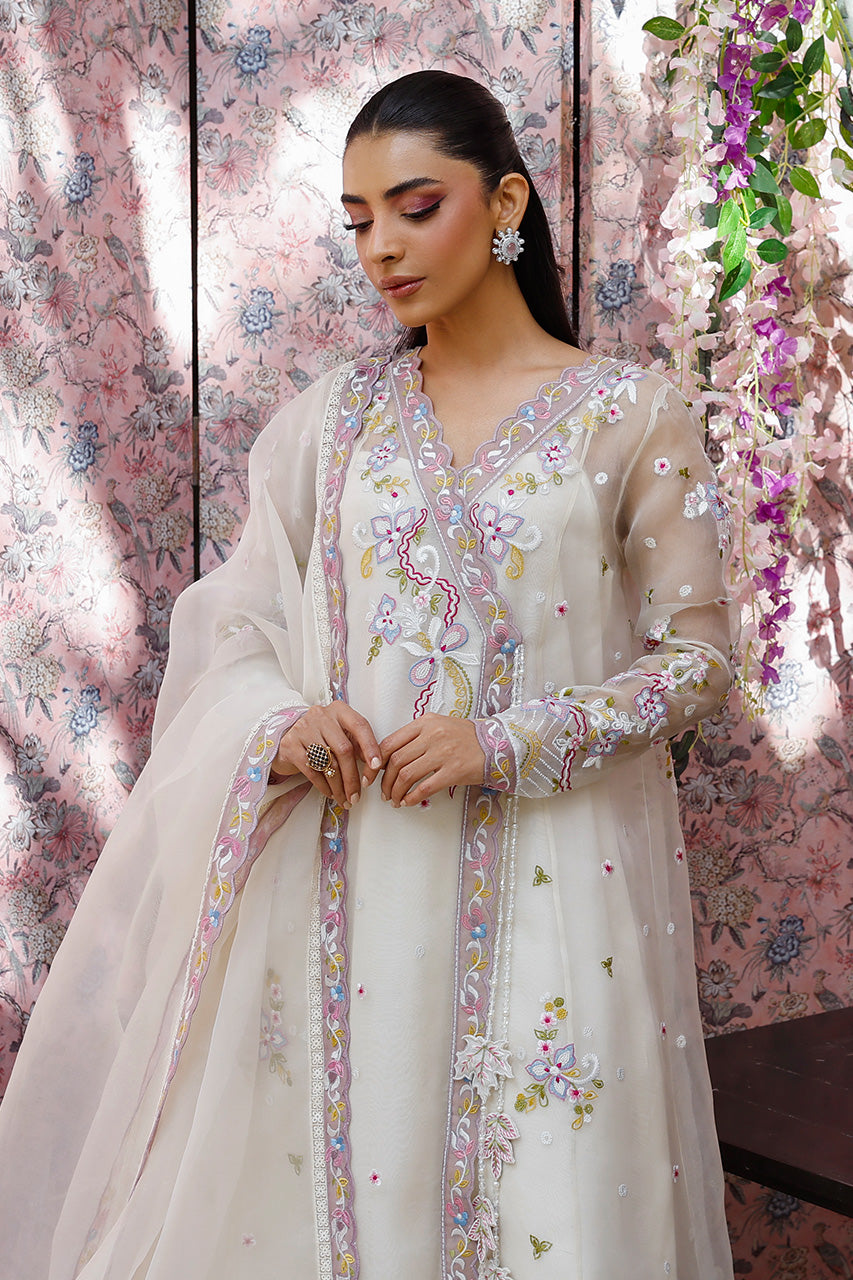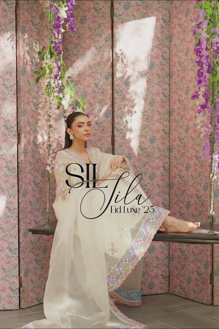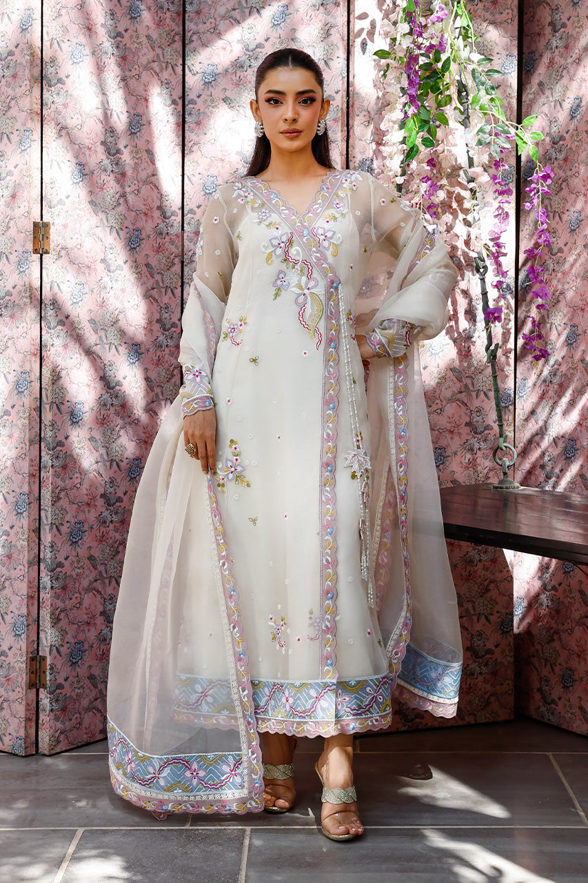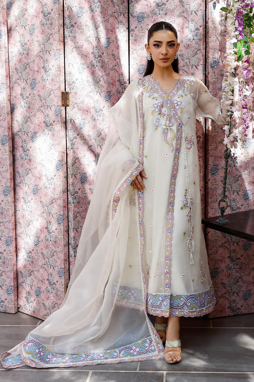 Embrace summer elegance with a charming ensemble featuring a light Pure Organza Angrakha adorned with delicate floral or metallic embroidery and subtle tassels. Paired with comfortable straight khaddi silk pants, this outfit offers breathability ideal for warm weather. Complete the look with an organza dupatta showcasing a softly embroidered border, all in a fresh pastel or ivory color palette. This stylish and comfortable outfit is perfect for summer gatherings and effortlessly exudes grace and sophistication.