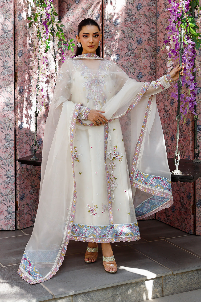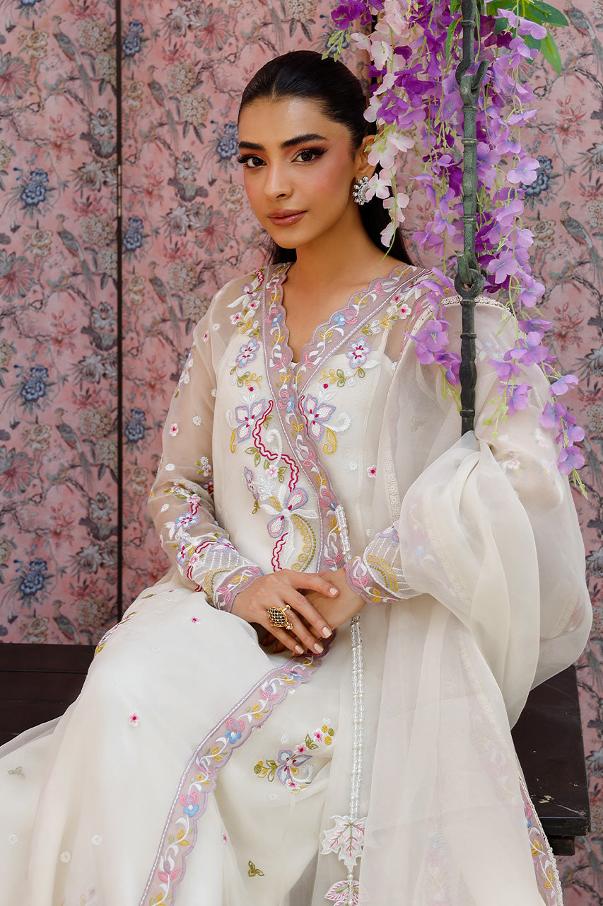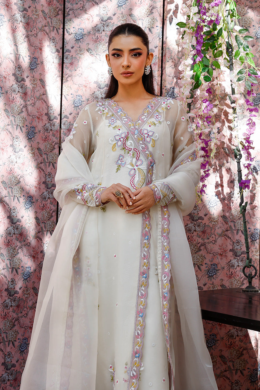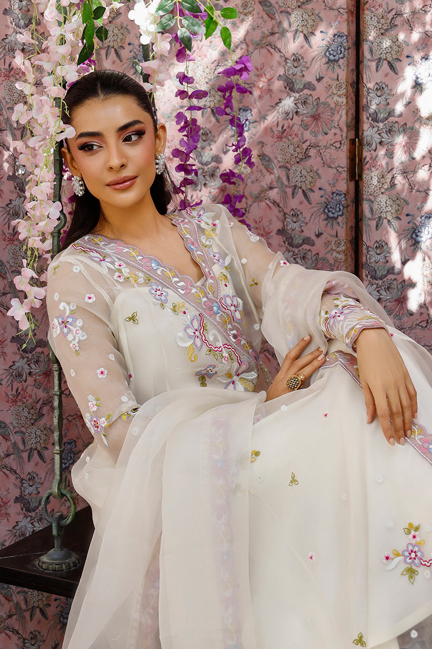 Embrace summer elegance with a charming ensemble featuring a light Pure Organza Angrakha adorned with delicate floral or metallic embroidery and subtle tassels. Paired with comfortable straight khaddi silk pants, this outfit offers breathability ideal for warm weather. Complete the look with an organza dupatta showcasing a softly embroidered border, all in a fresh pastel or ivory color palette. This stylish and comfortable outfit is perfect for summer gatherings and effortlessly exudes grace and sophistication.