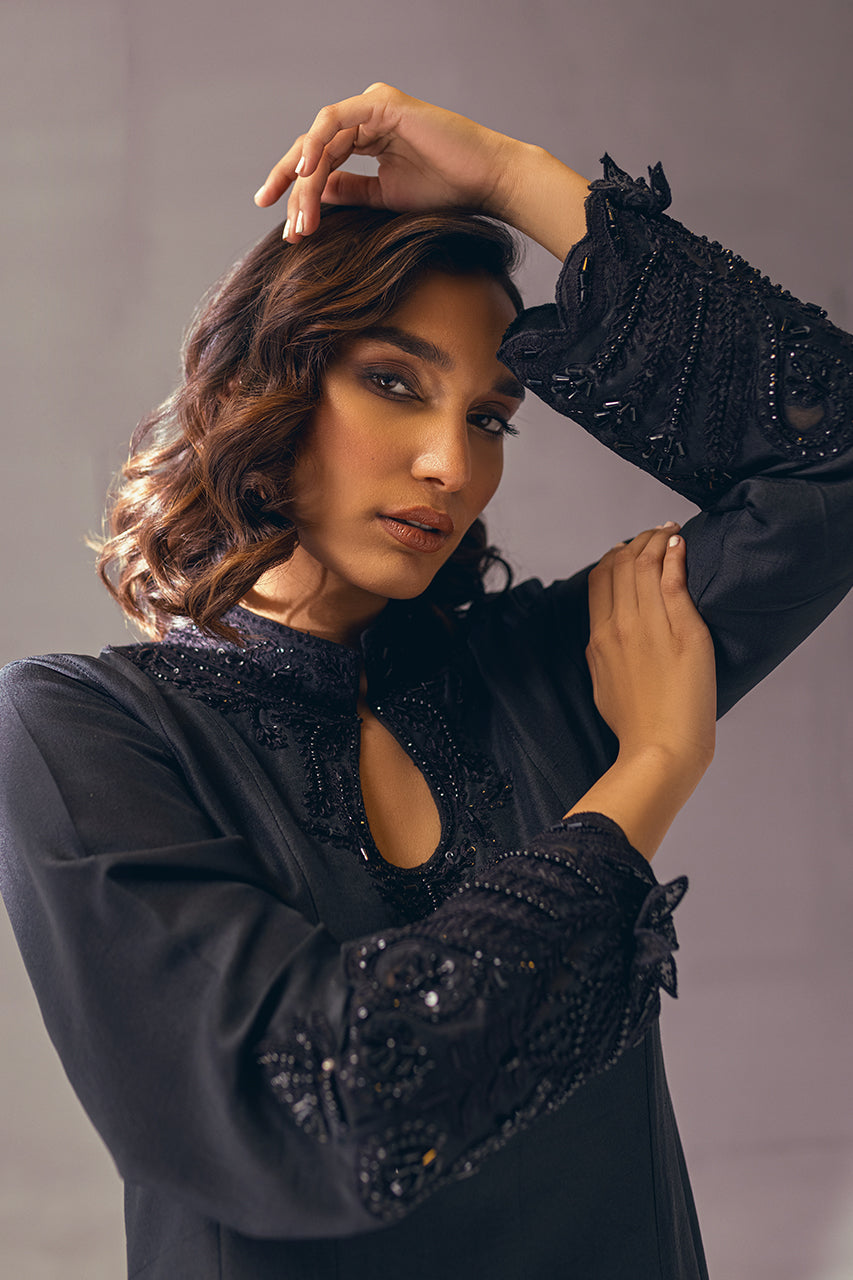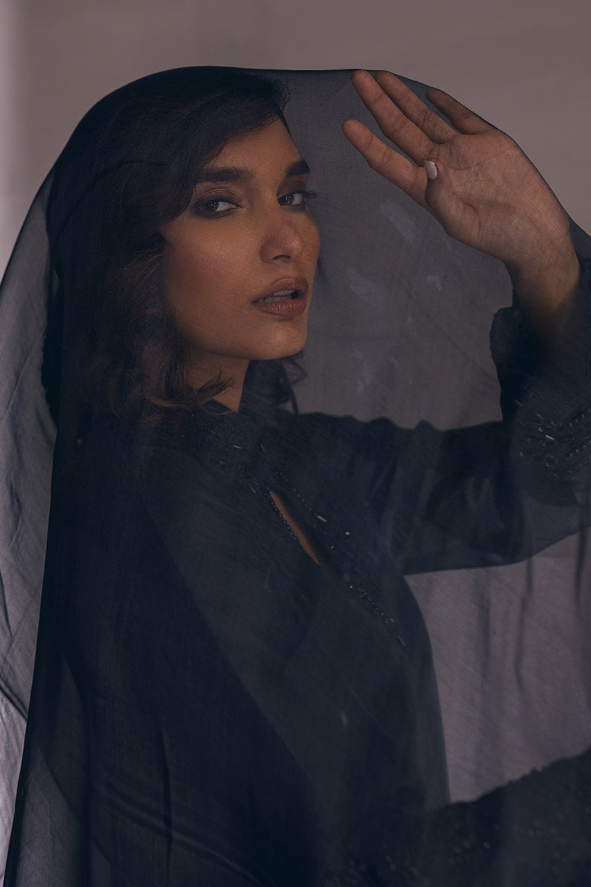 Naomi with its stunning silhouette features a raw silk princess cut shirt adorned with stunning embroidery. Paired along is a marvelous dupatta crafted out of organza, and black straight pants, perfectly portraying the stunning charm of graceful attire.
