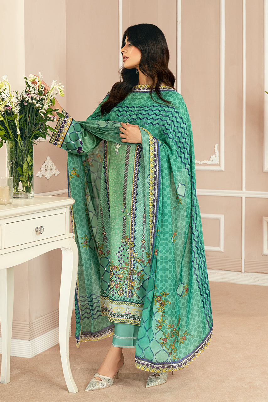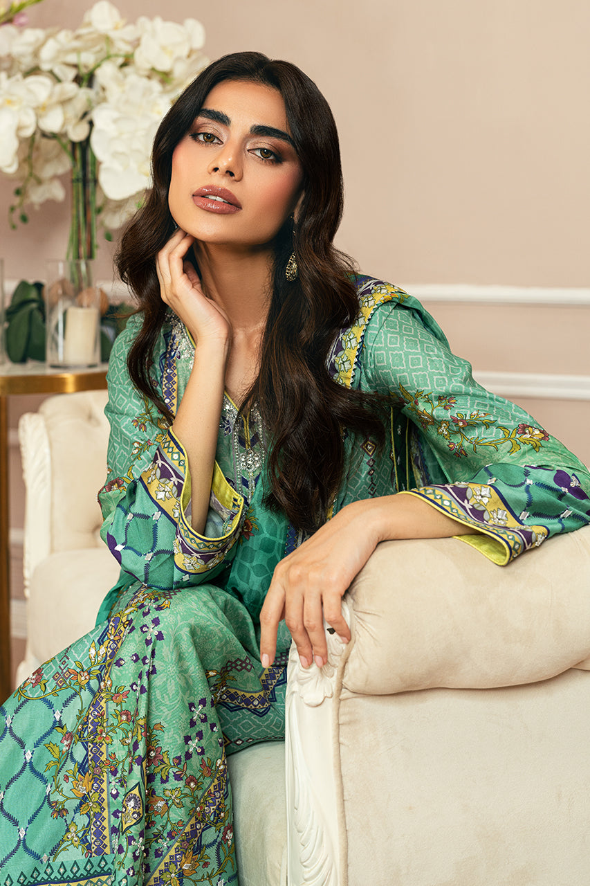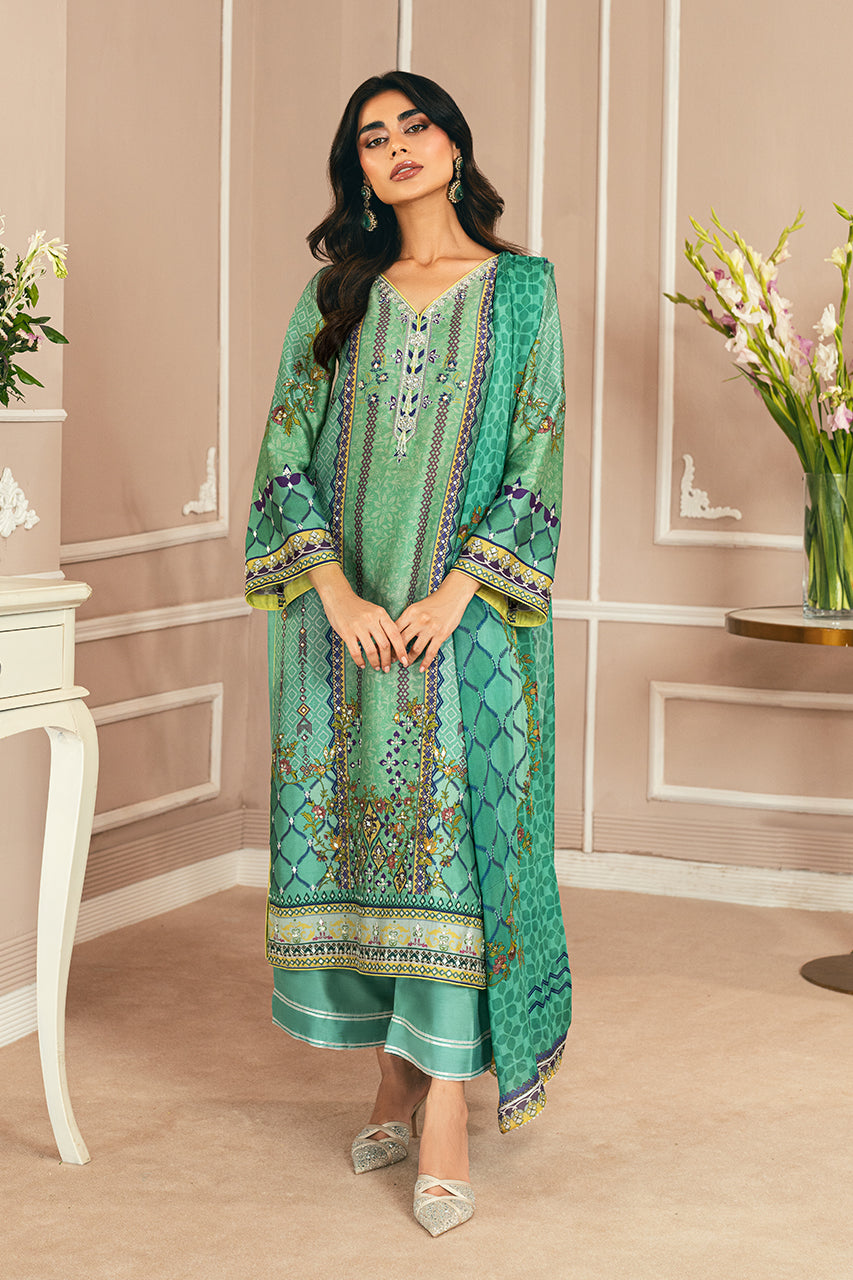 Brimming with playful elegance, this seafoam green silk shirt is a true masterpiece. Adorned with whimsical floral blooms and geometric patterns, each detail is meticulously embellished, accompanied by swaying tassels for a festive touch. Paired with sleek masoori silk izaar pants featuring delicate lace borders, and a silk dupatta with complementing digital prints, this outfit transforms any occasion into a vibrant celebration of style.
