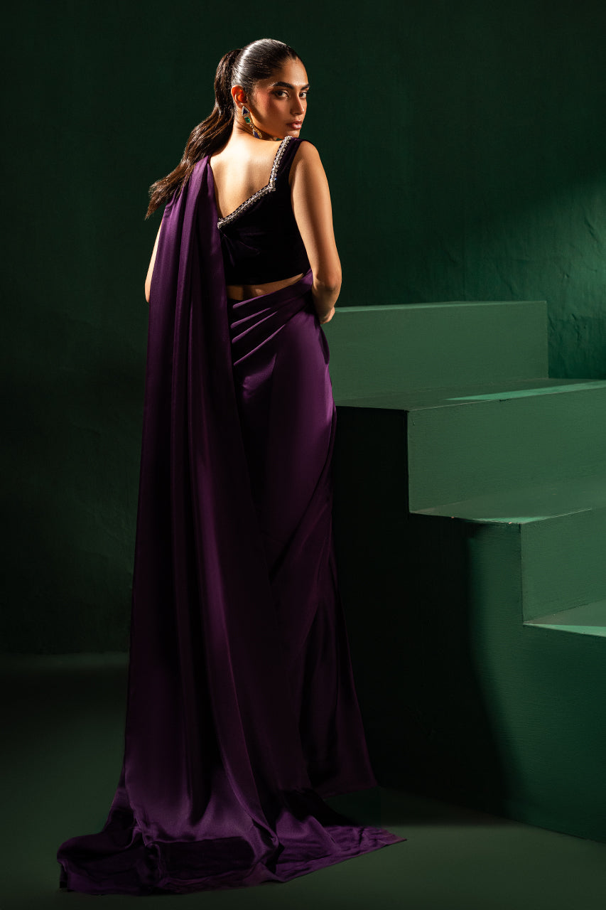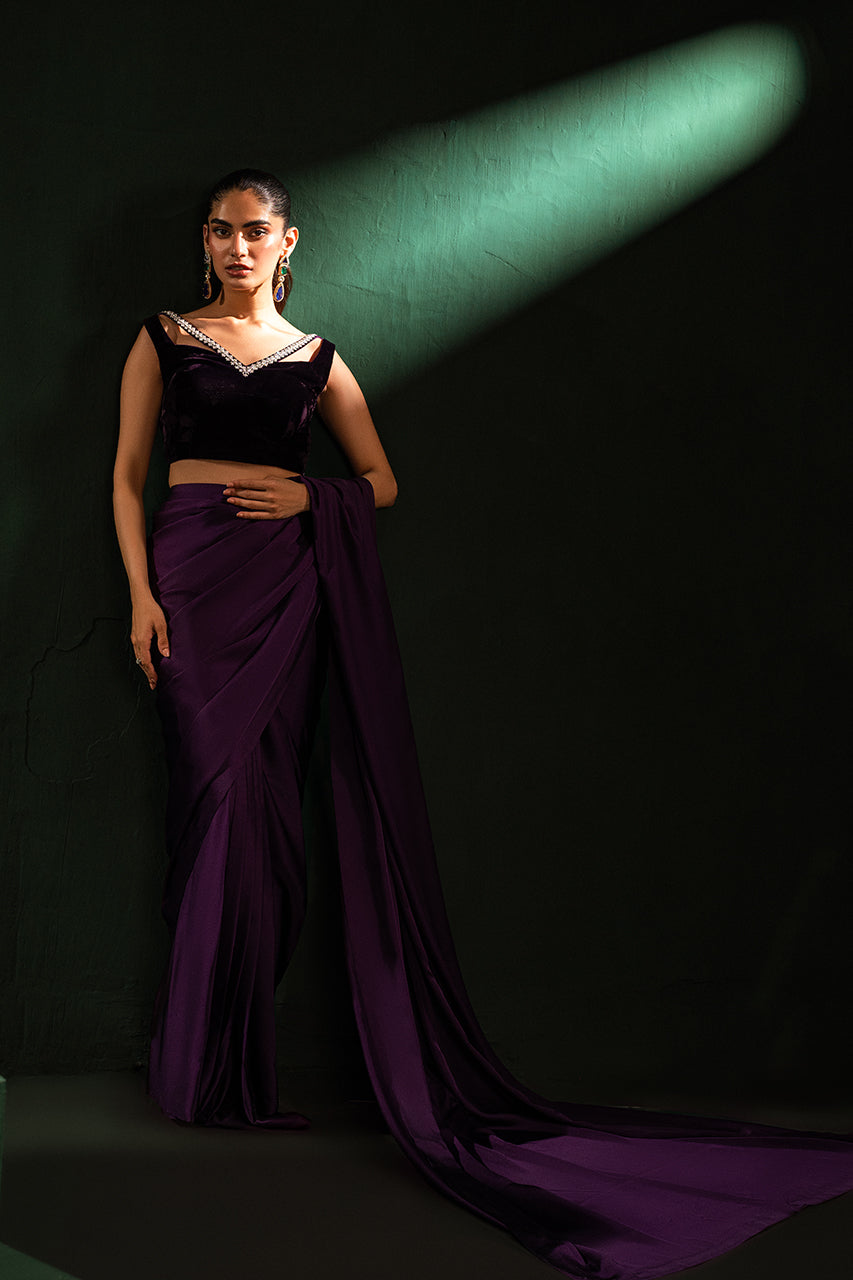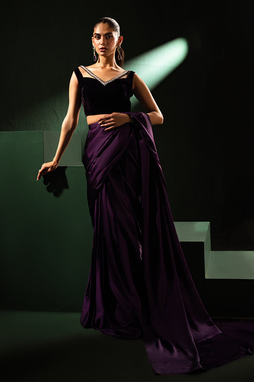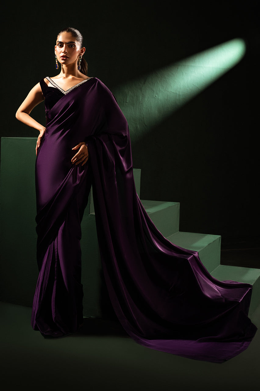 Discover elegance with a stunning purple saree crafted from premium Charmeuse silk, designed to enhance your beauty. Paired with a luxurious velvet blouse featuring a stylish neckline, this ensemble blends traditional charm and modern sophistication. The rich purple hues make this outfit perfect for festive occasions or glamorous evenings, to stand out effortlessly.