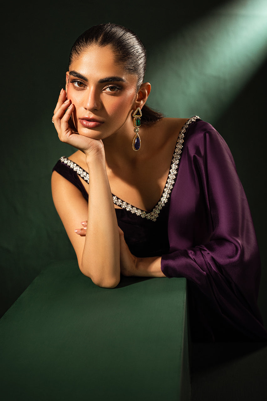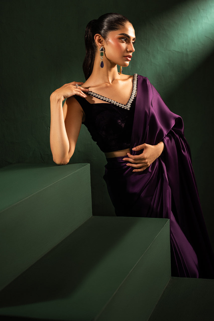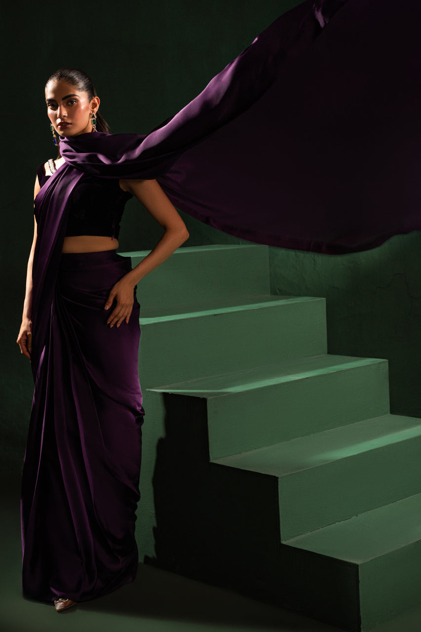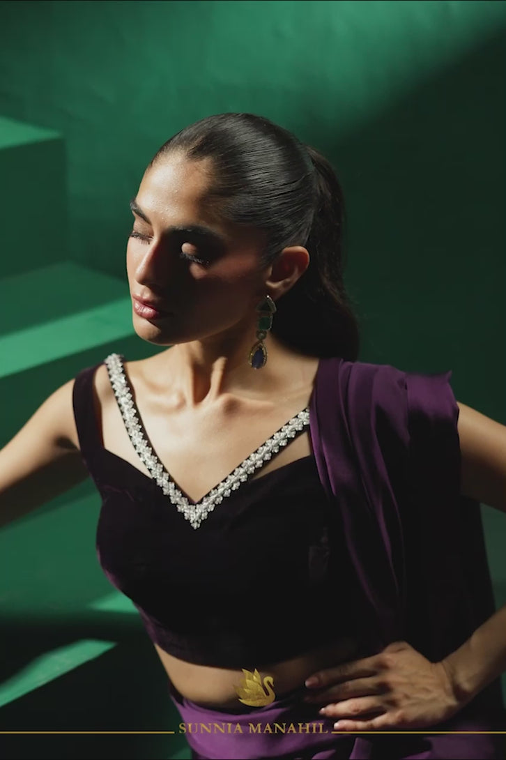 Discover elegance with a stunning purple saree crafted from premium Charmeuse silk, designed to enhance your beauty. Paired with a luxurious velvet blouse featuring a stylish neckline, this ensemble blends traditional charm and modern sophistication. The rich purple hues make this outfit perfect for festive occasions or glamorous evenings, to stand out effortlessly.