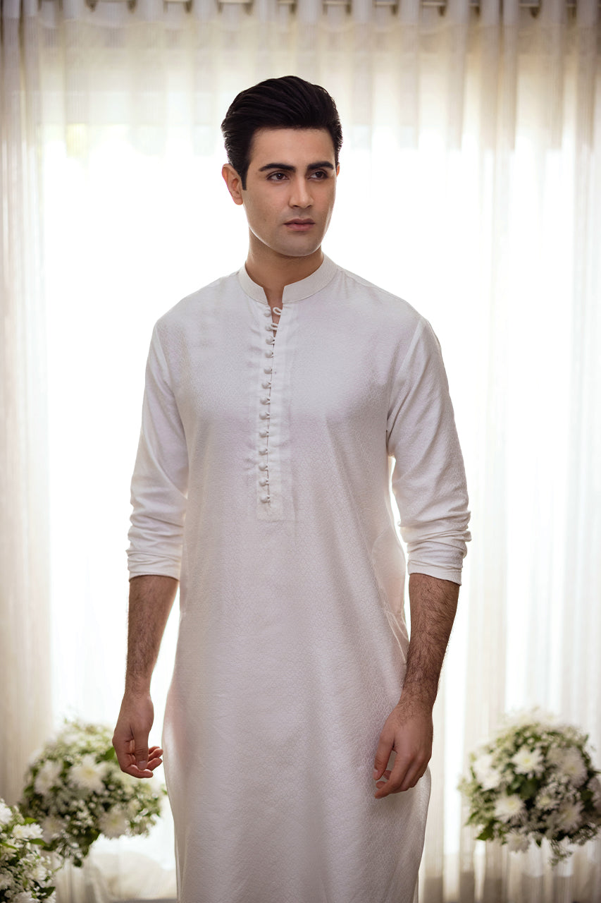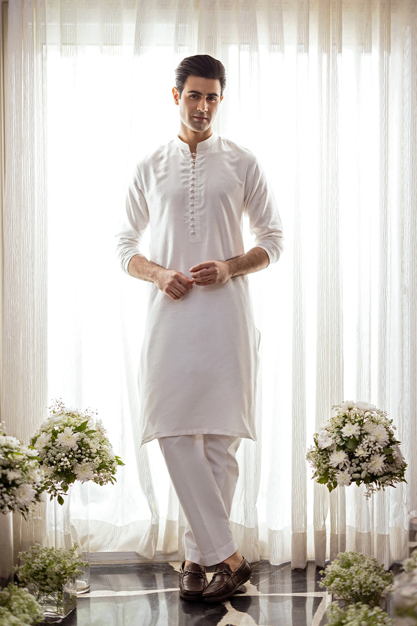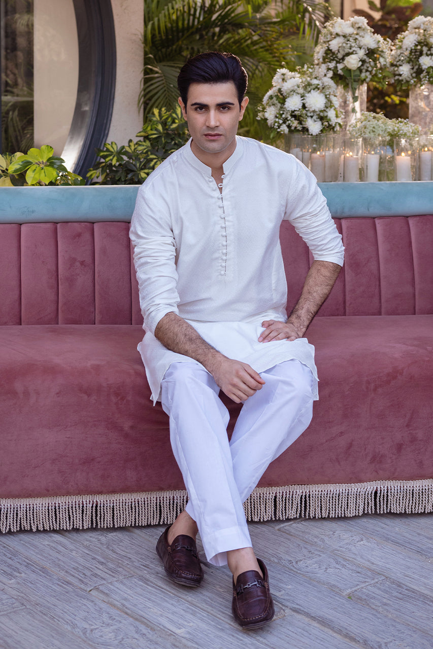 Experience sophistication with our exclusive in-house cotton kurta, featuring intricate textured detailing. Paired elegantly with white pants, it defines modern masculinity at its finest.