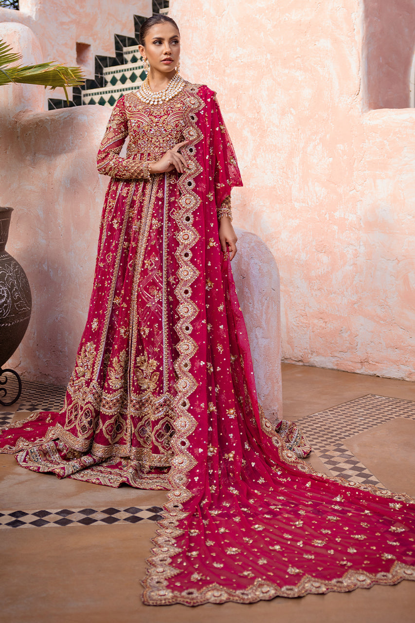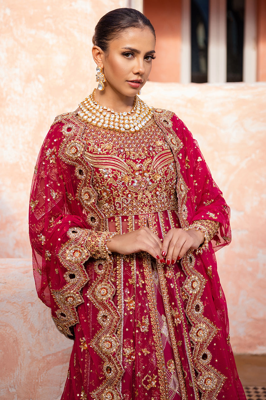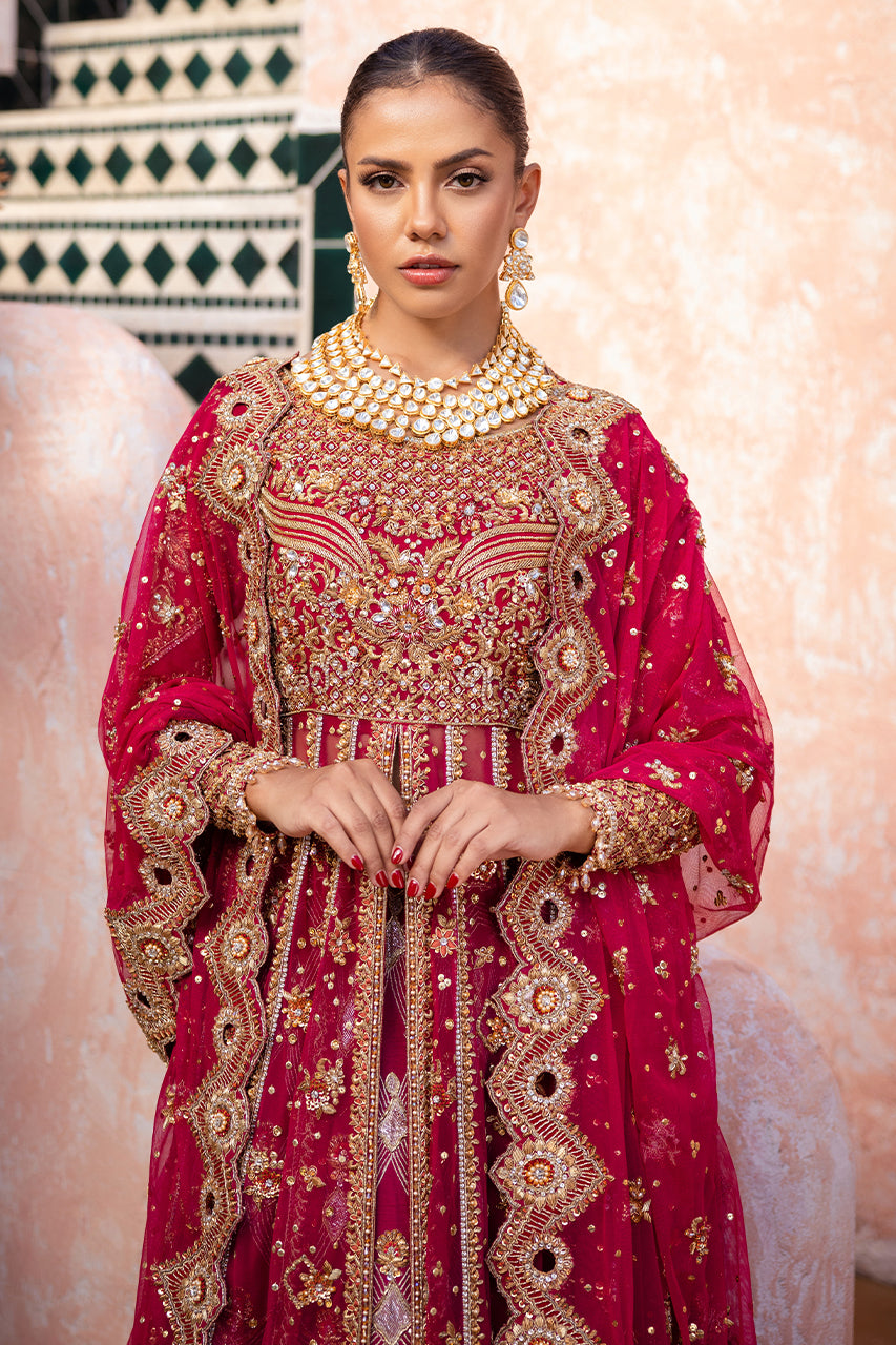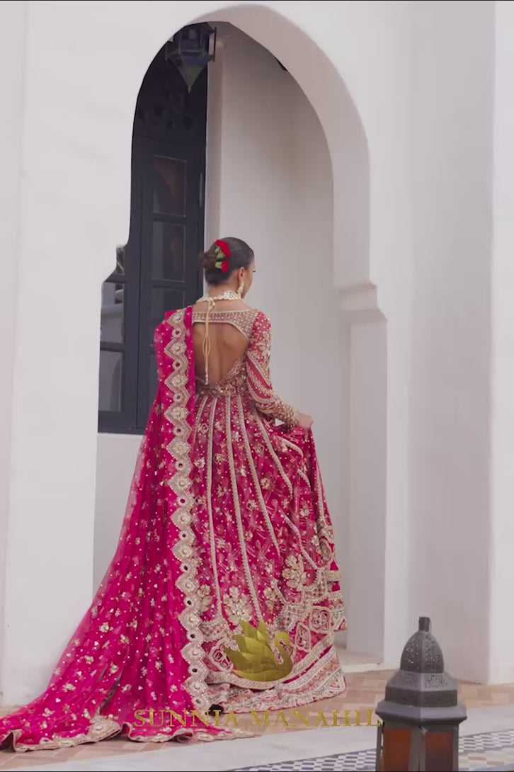 A stunning raspberry pink bridal outfit. It features intricate hand embroidery on the front and back of the open gown, perfectly paired with delicate French net sleeves. The lehnga is beautifully adorned with contrasting appliques, adding to its charm. The bridal ensemble is completed with a heavily embroidered dupatta, showcasing exquisite cutwork on all four edges.