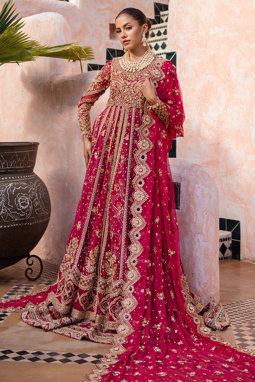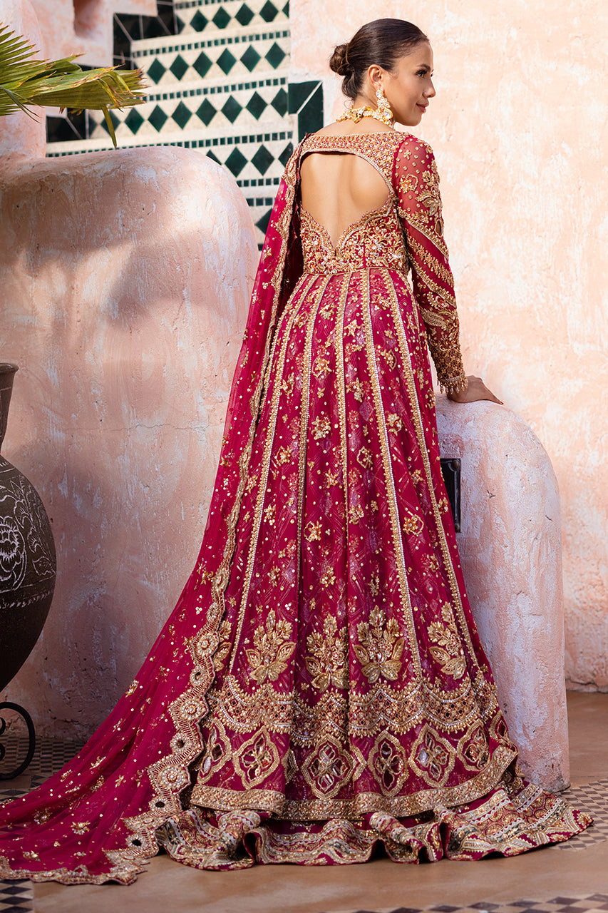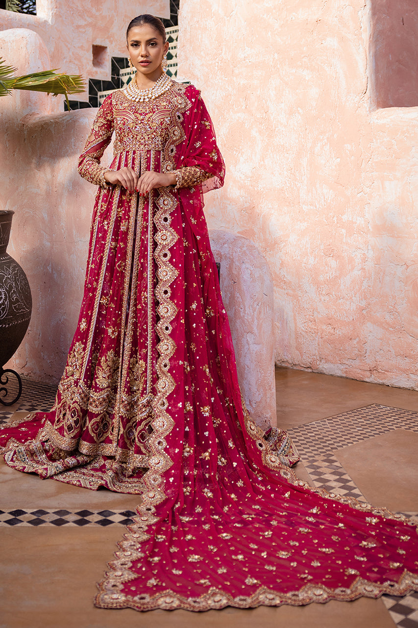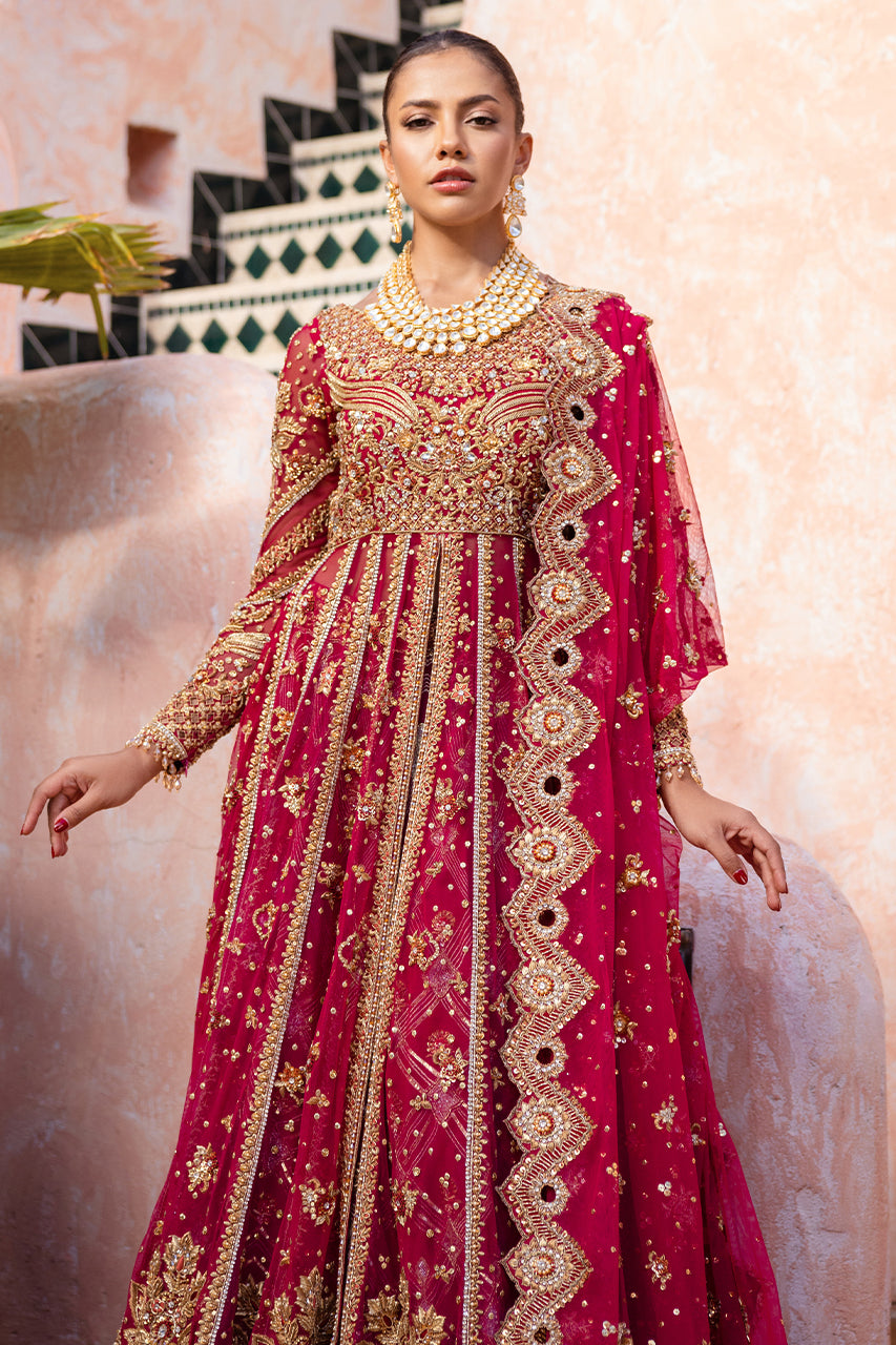 A stunning raspberry pink bridal outfit. It features intricate hand embroidery on the front and back of the open gown, perfectly paired with delicate French net sleeves. The lehnga is beautifully adorned with contrasting appliques, adding to its charm. The bridal ensemble is completed with a heavily embroidered dupatta, showcasing exquisite cutwork on all four edges.