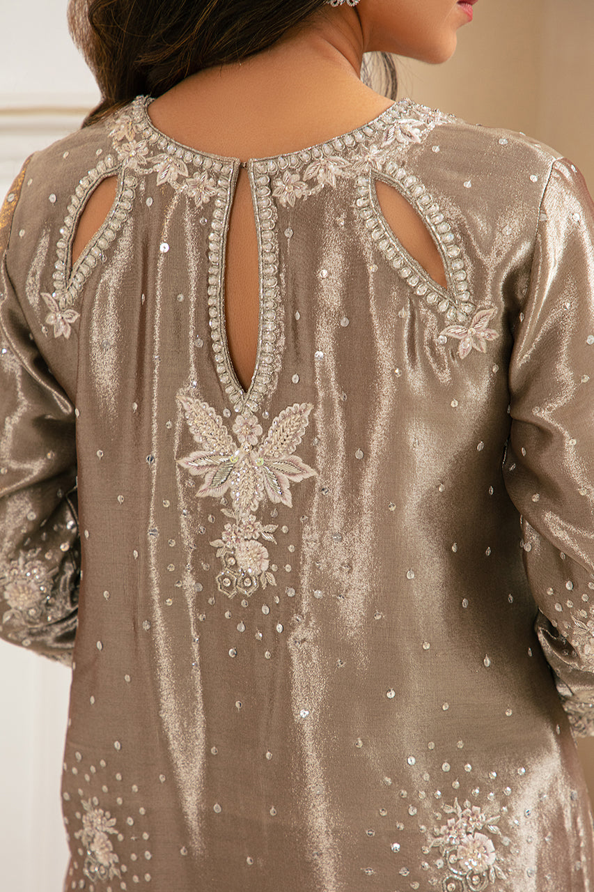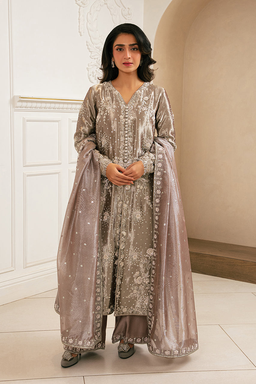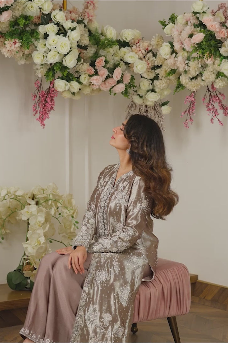 A sophisticated grey Lama front-open long shirt, adorned with 3D hand-embroidered motifs and intricate hand-embroidered buttons on the neckline. Pair it with Masuri Silk Izaar pants, featuring a delicately hand-embellished border. The ensemble is completed with a Masuri Net dupatta, beautifully finished with a hand-embroidered border on all four sides.