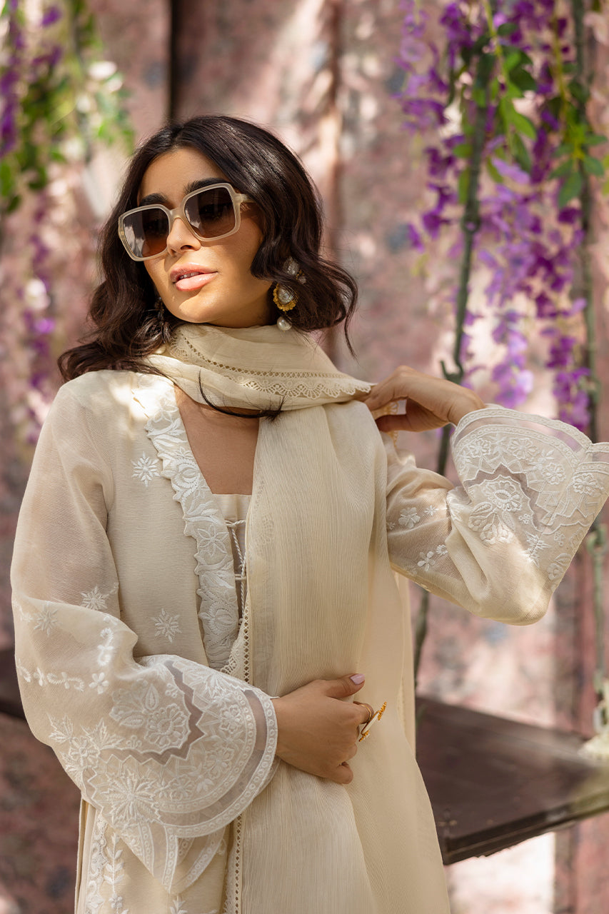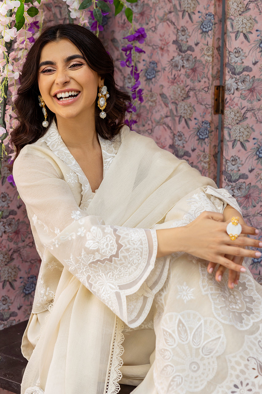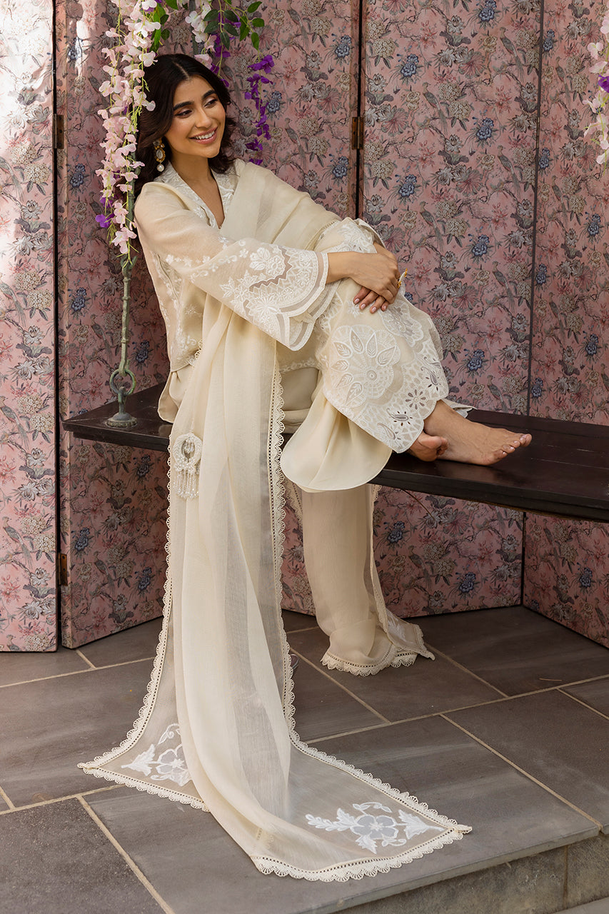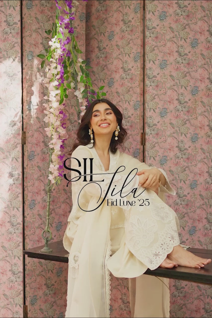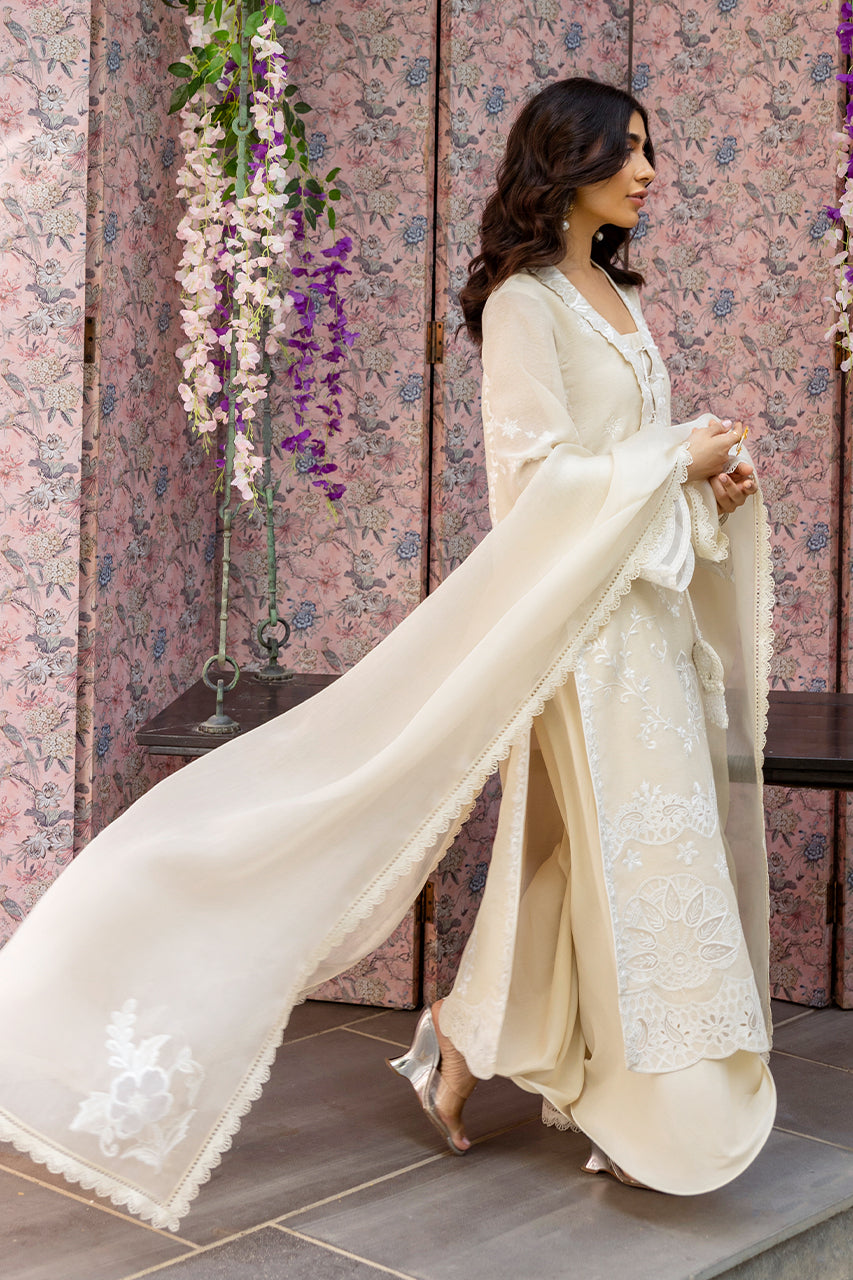 This Ivory masterpiece is made on pure khaddi net, featuring beautiful 3D neckline and heavily embroidered all over the shirt and sleeves. The delicate scalloped details on the sleeves and hem add charm, while tassels at the neckline bring a playful touch. Paired with flared khaddi silk pants, the outfit offers comfort and elegance. The matching ivory dupatta has appliqued 3D flowers and delicate lacework, adding a refined, luxurious finish.