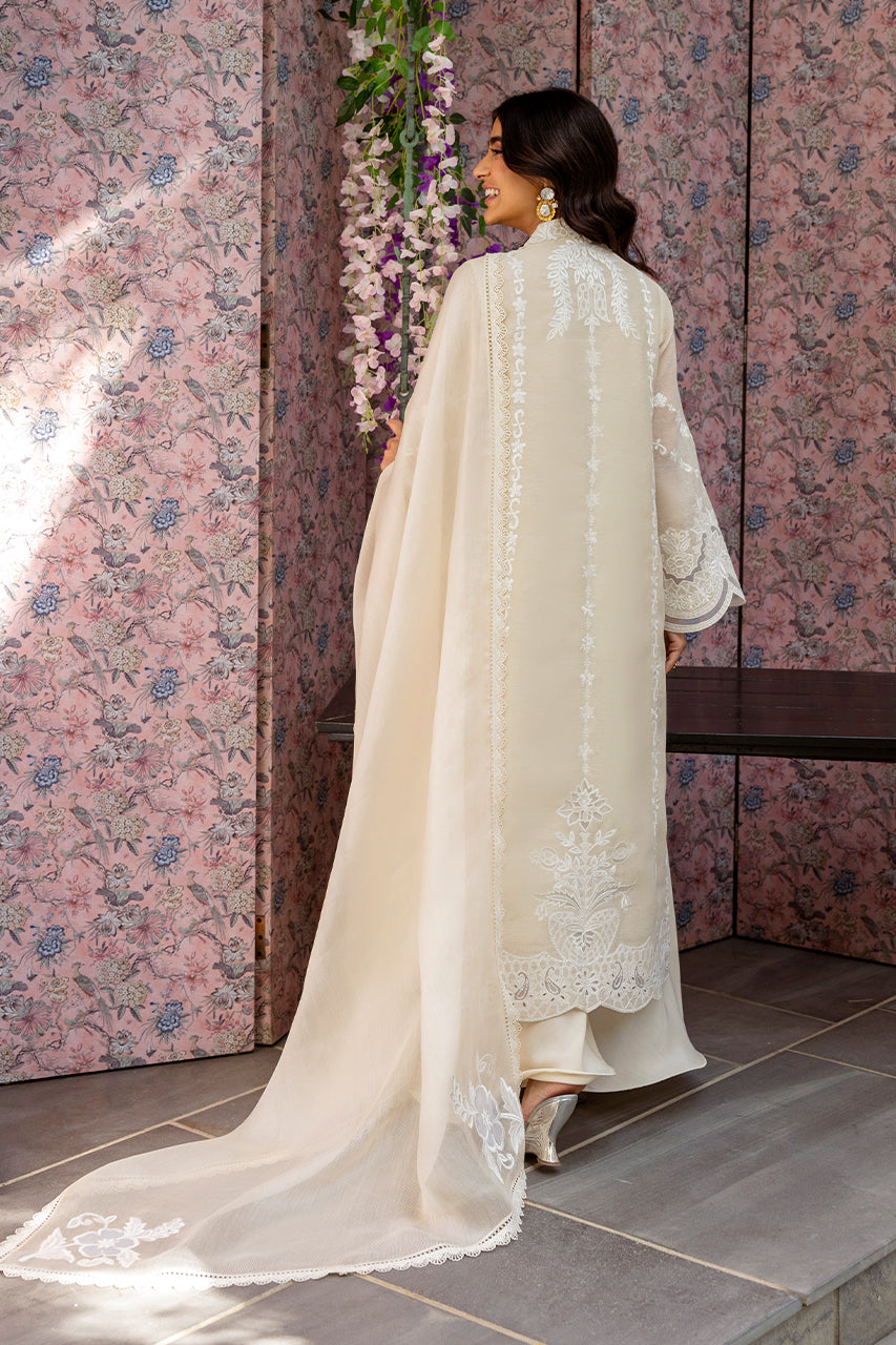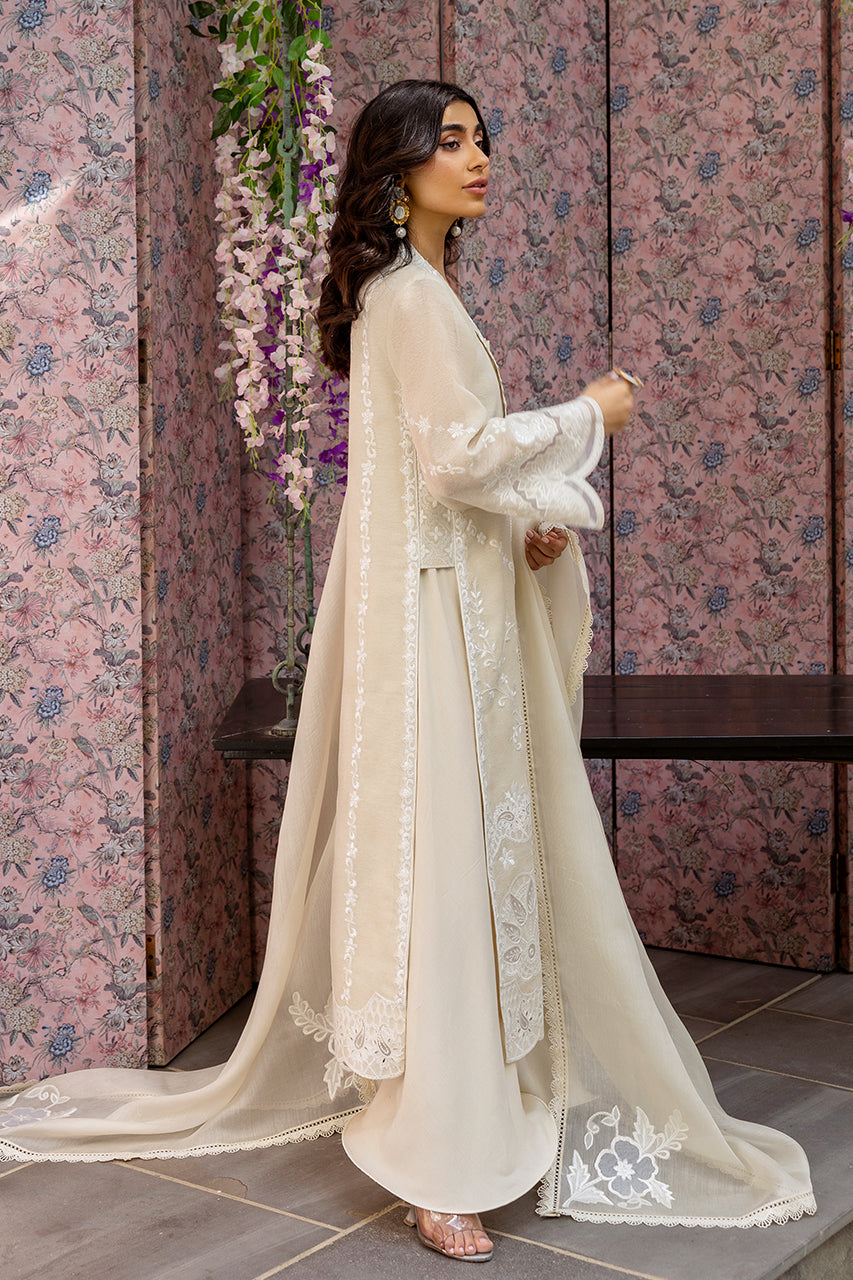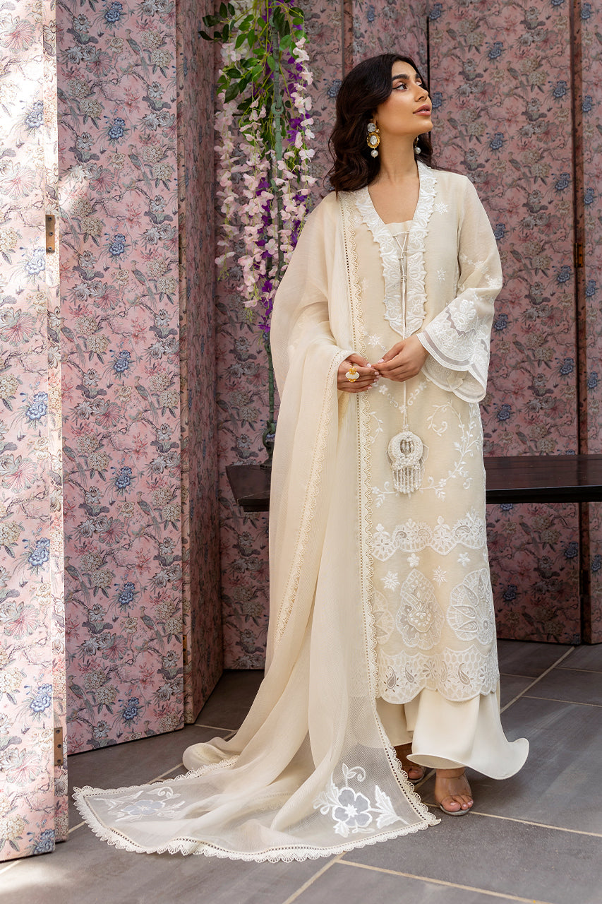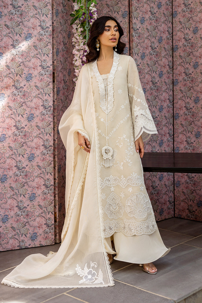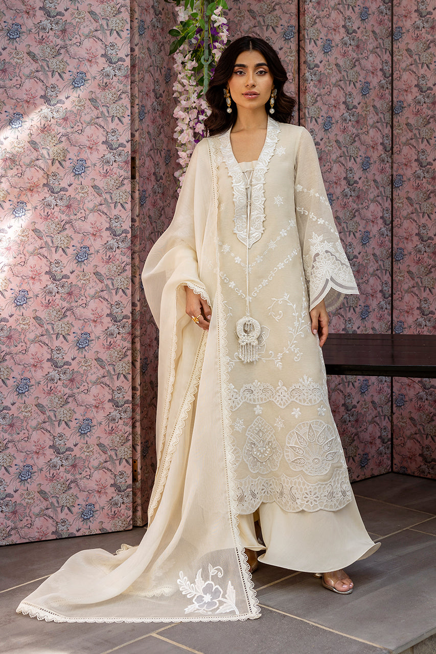 This Ivory masterpiece is made on pure khaddi net, featuring beautiful 3D neckline and heavily embroidered all over the shirt and sleeves. The delicate scalloped details on the sleeves and hem add charm, while tassels at the neckline bring a playful touch. Paired with flared khaddi silk pants, the outfit offers comfort and elegance. The matching ivory dupatta has appliqued 3D flowers and delicate lacework, adding a refined, luxurious finish.