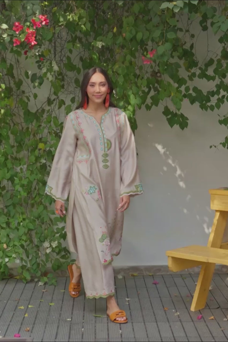 This elegant beige khadi silk ensemble features a knee-length shirt with full sleeves, adorned with a blend of floral and geometric patterns, making it stand out. The intricate thread embroidery enhances the design, adding texture and a touch of sophistication. Paired with matching beige khadi cotton pants, the outfit is elevated by a finishing border at the hem, providing a refined, polished look. This ensemble combines traditional craftsmanship with modern design, offering a timeless yet contemporary style perfect for special occasions.