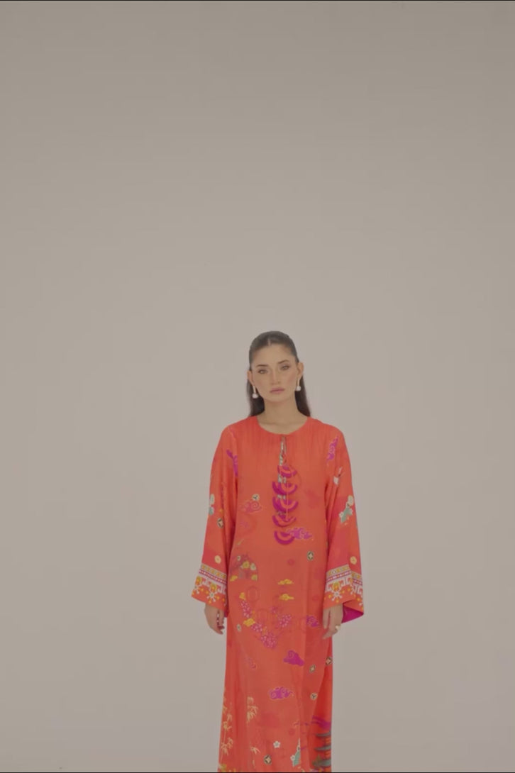 A bold Coral Red digital silk long kaftan, designed with a striking mix of contemporary elements that exude vibrance and modern artistry. The fluid silhouette drapes gracefully, offering both comfort and elegance, while the neckline is finished with a refined tassel detail that adds a playful yet sophisticated touch. A statement piece that blends effortless charm with timeless appeal.