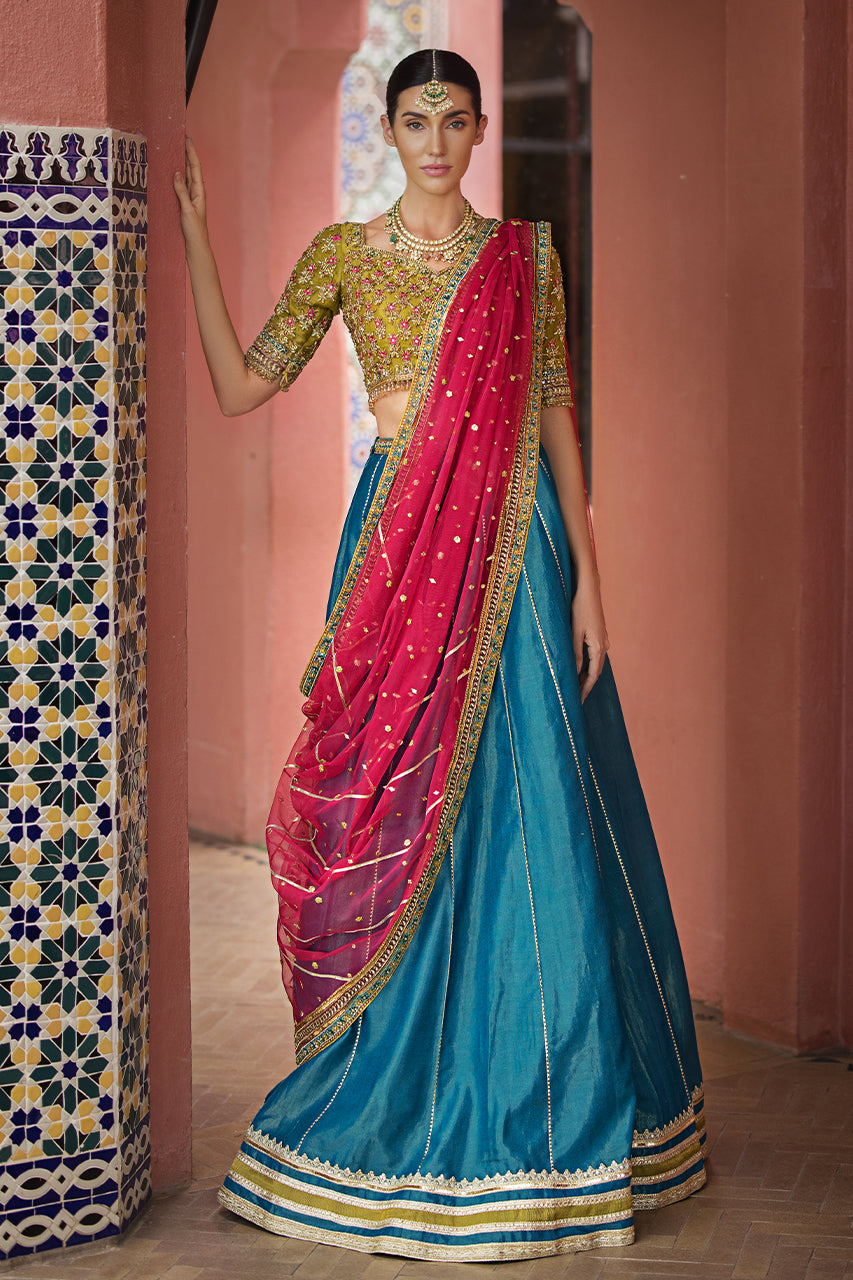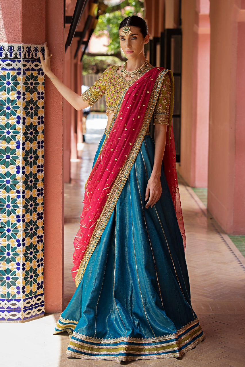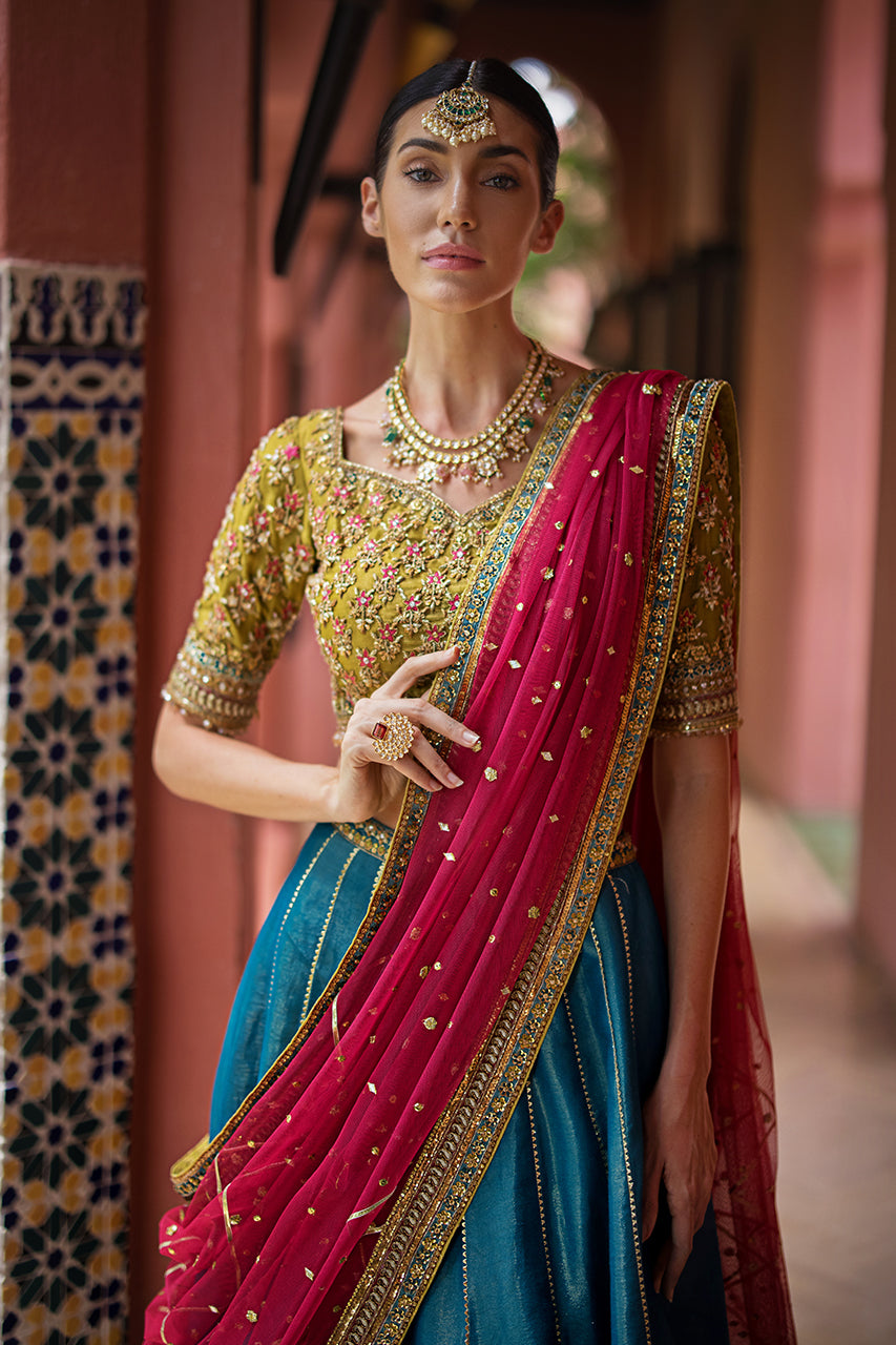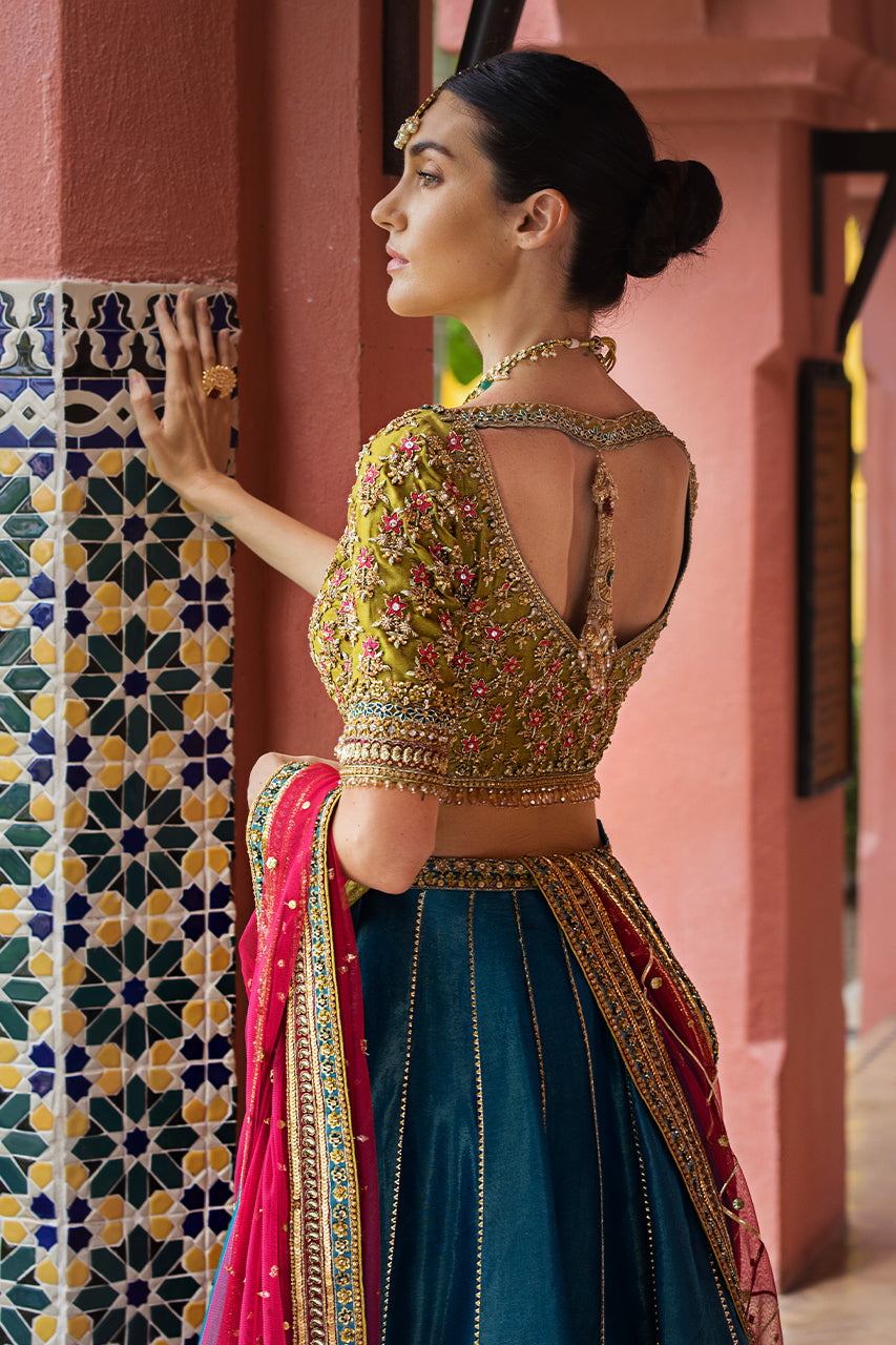 Oceanic Opulence,' where the artistry of lime green embroidery converges with the allure of teal intricacy. The meticulously embroidered masoori choli, adorned with quarter sleeves, strikes a harmonious chord with the teal dumzaari lehenga, its lace-kissed hem exuding timeless grace.
