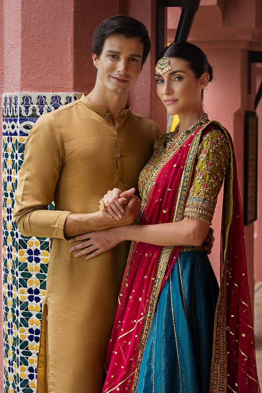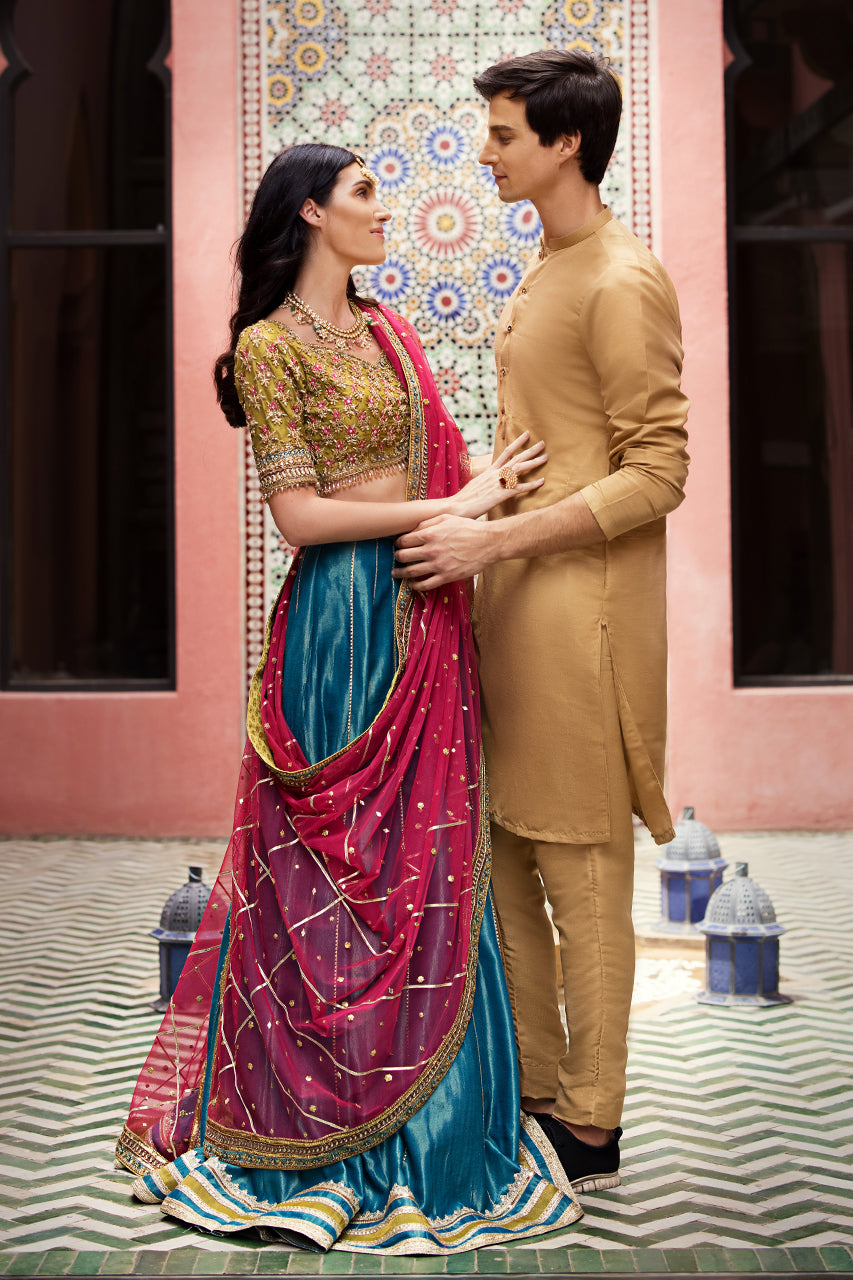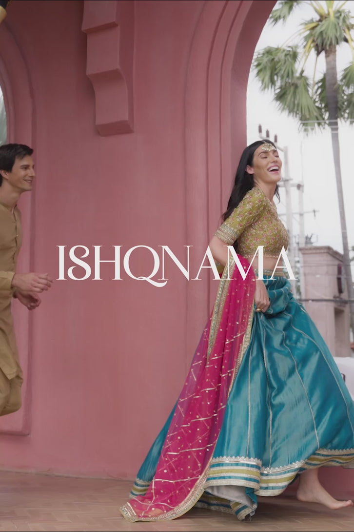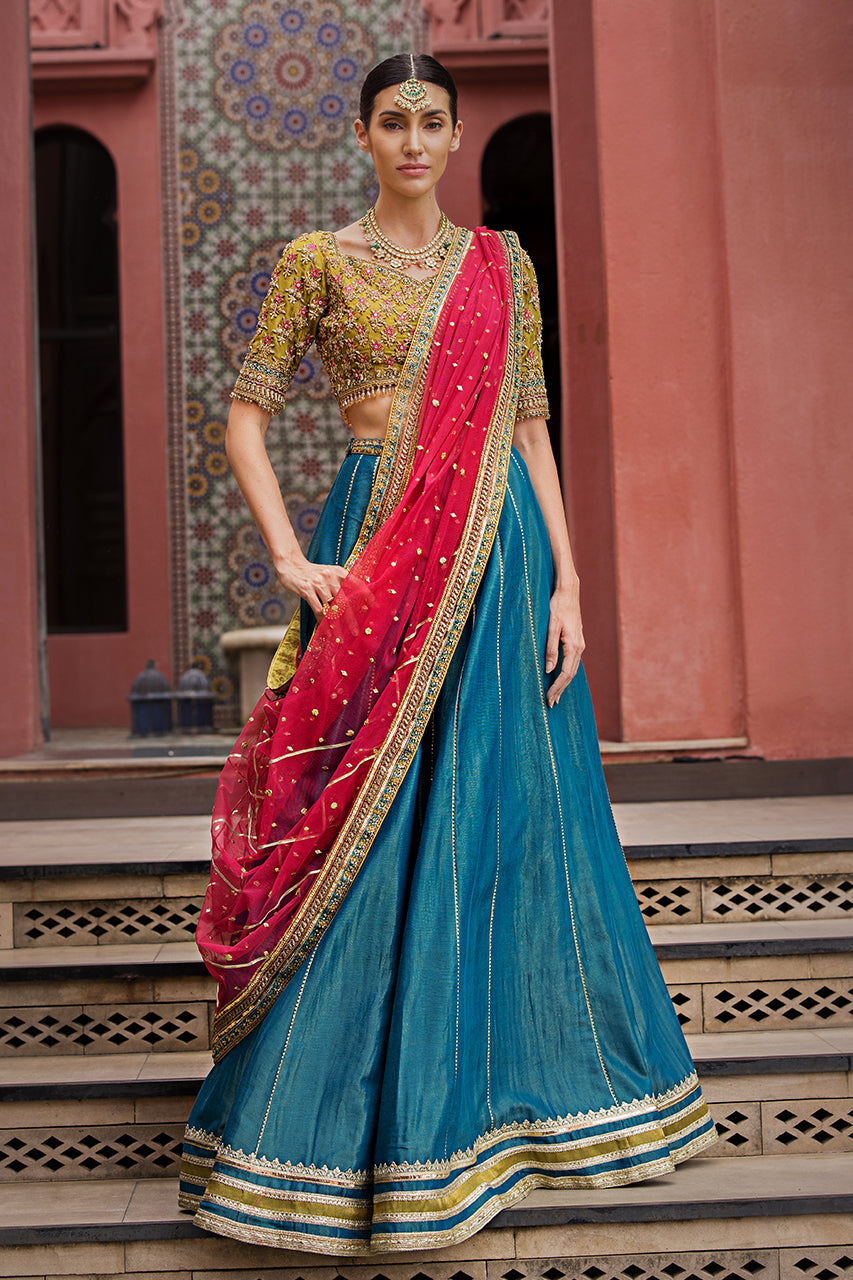 Oceanic Opulence,' where the artistry of lime green embroidery converges with the allure of teal intricacy. The meticulously embroidered masoori choli, adorned with quarter sleeves, strikes a harmonious chord with the teal dumzaari lehenga, its lace-kissed hem exuding timeless grace.