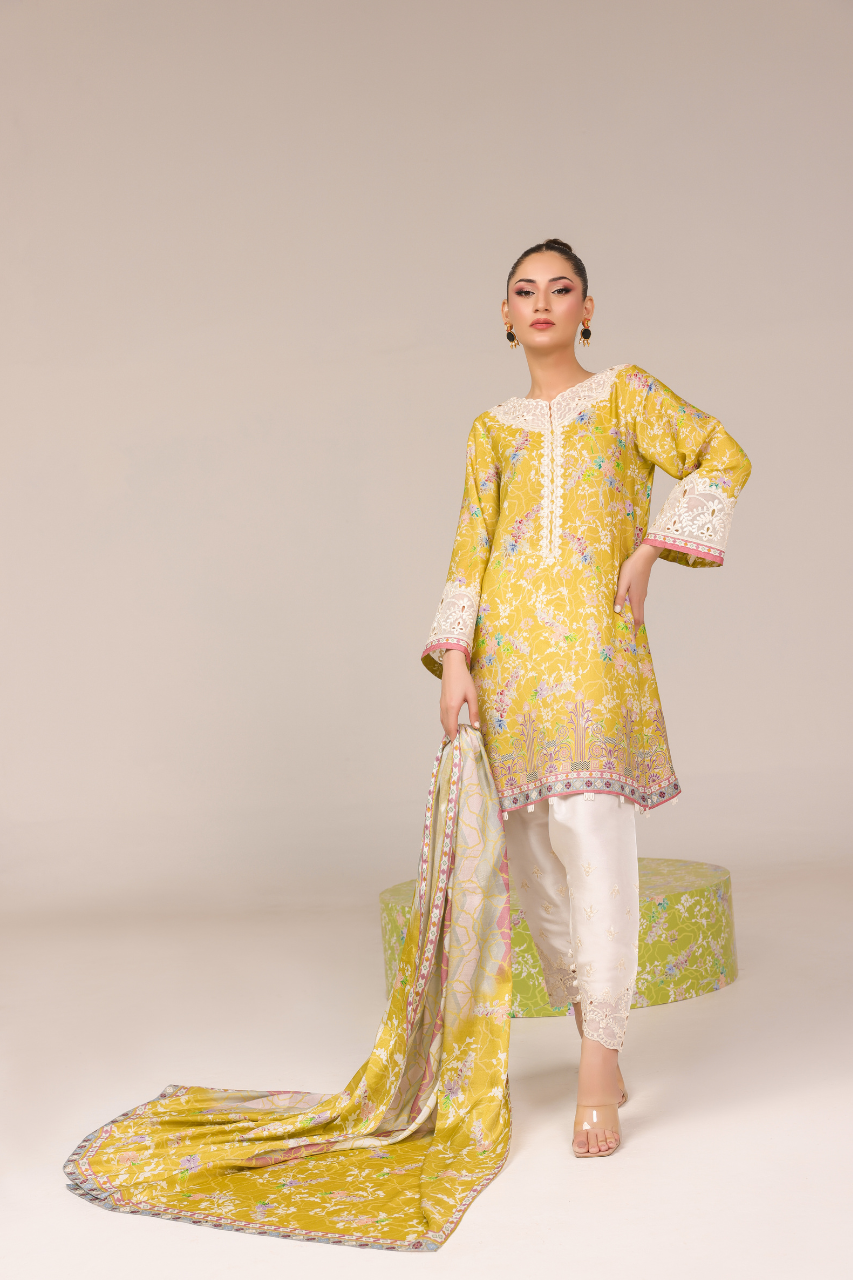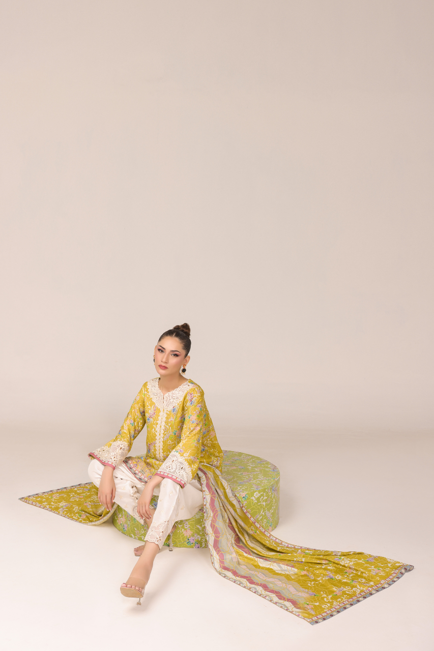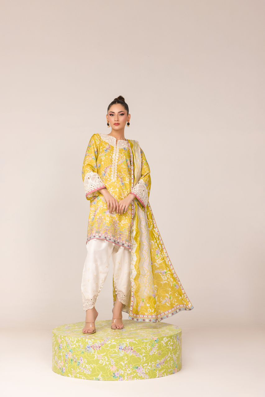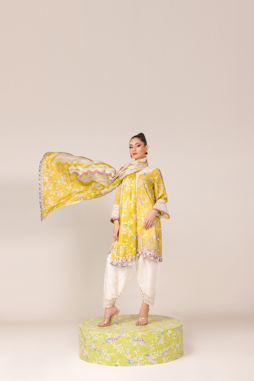 Step into the radiance with this vibrant short yellow shirt, digitally crafted from cora fabric, featuring full sleeves adorned with intricate Ari work on the neckline and sleeves, complemented by delicate cutwork detailing. It is paired gracefully with a medium silk dupatta and embroidered raw silk shalwar, both showcasing exquisite cutwork embellishments for timeless elegance!