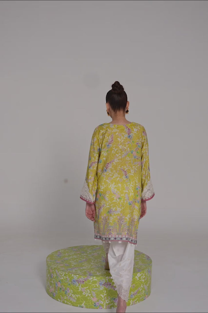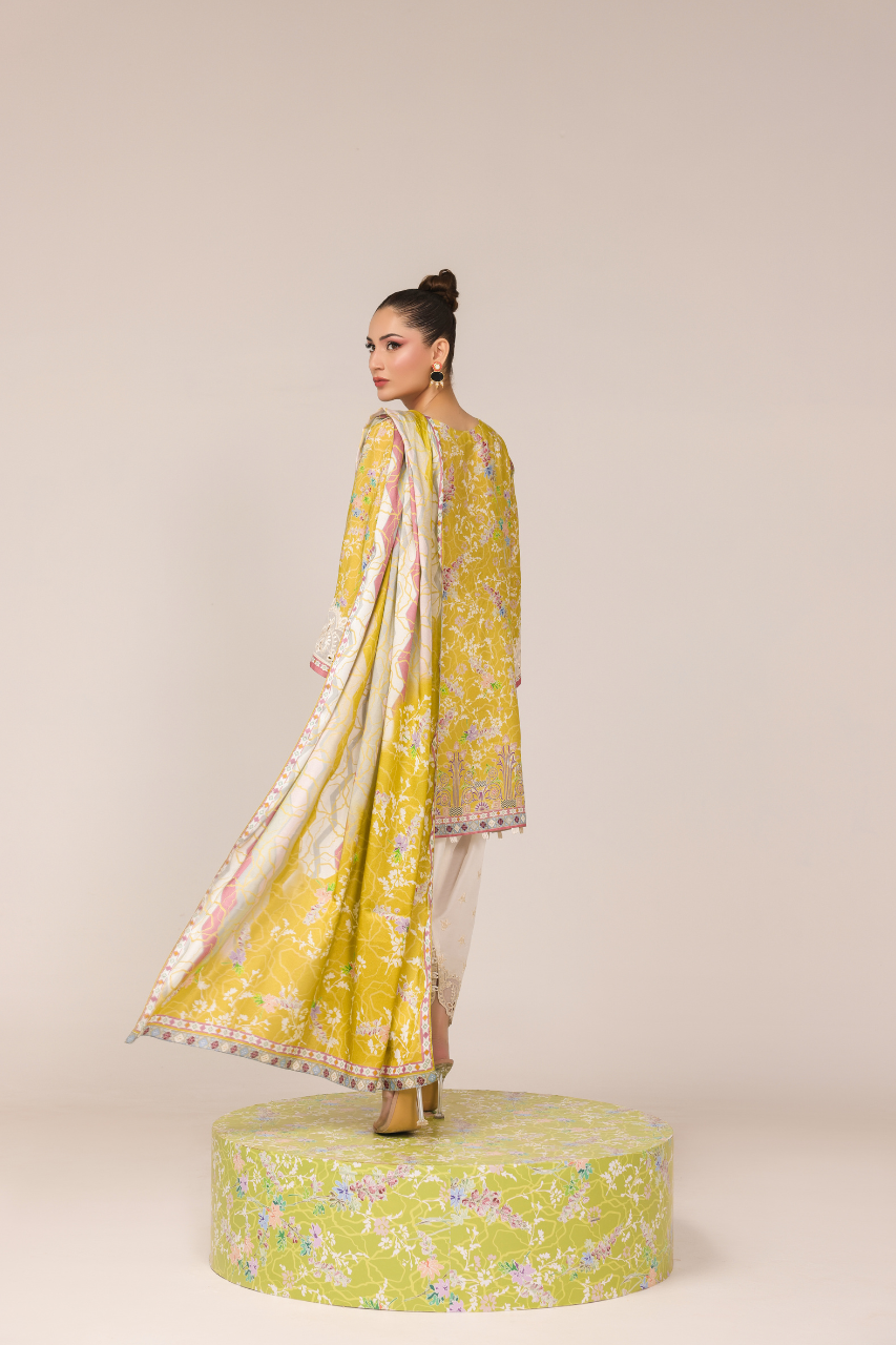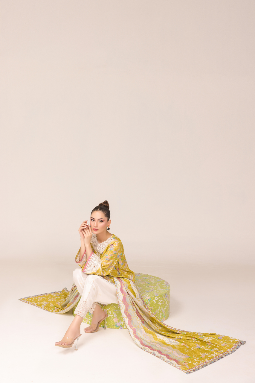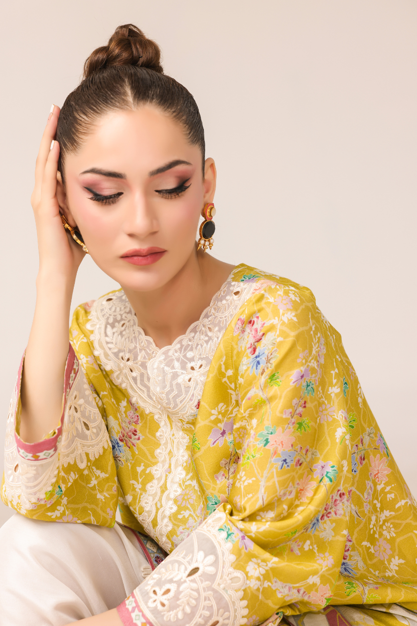 Step into the radiance with this vibrant short yellow shirt, digitally crafted from cora fabric, featuring full sleeves adorned with intricate Ari work on the neckline and sleeves, complemented by delicate cutwork detailing. It is paired gracefully with a medium silk dupatta and embroidered raw silk shalwar, both showcasing exquisite cutwork embellishments for timeless elegance!