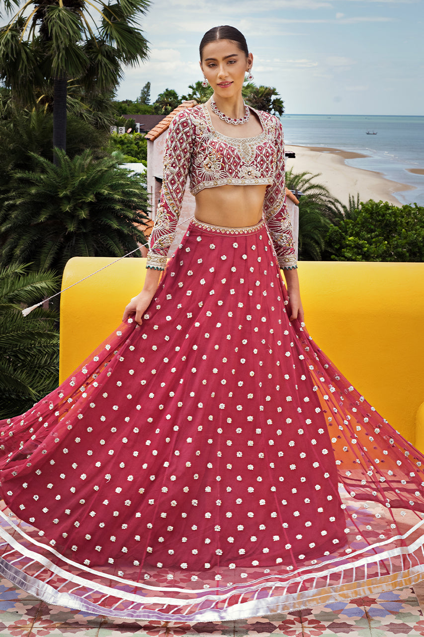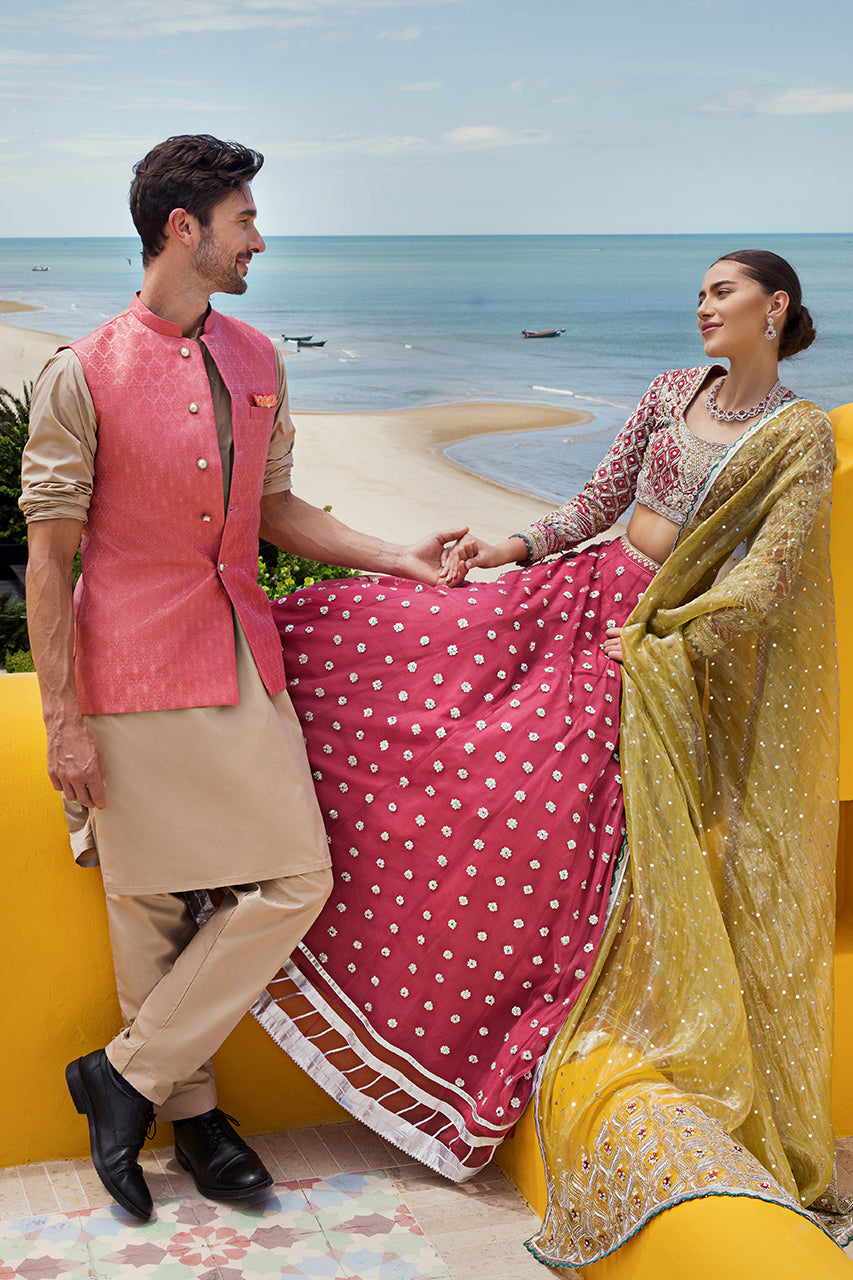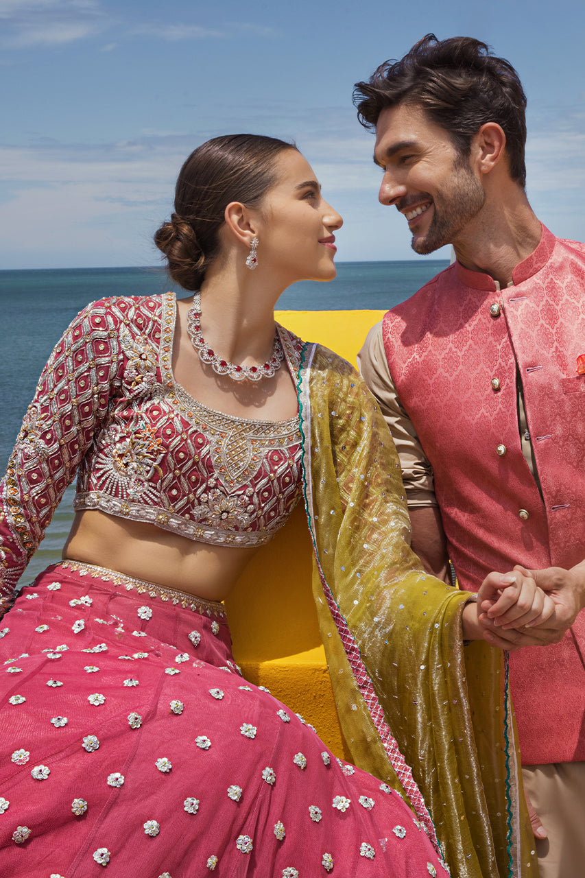 Dance with unparalleled grace in the embrace of pink Melody. Our enchanting ensemble redefines tradition, featuring a captivating pink net lehenga adorned with intricate sequins and delicate lace detailing. The artfully embroidered choli complements the lehenga effortlessly, while the contrasting handcrafted bordered dupatta adds a touch of elegance to your dance.
