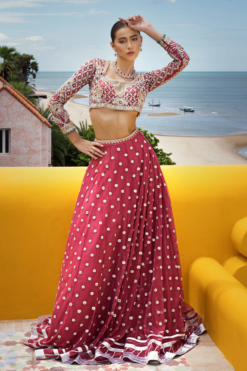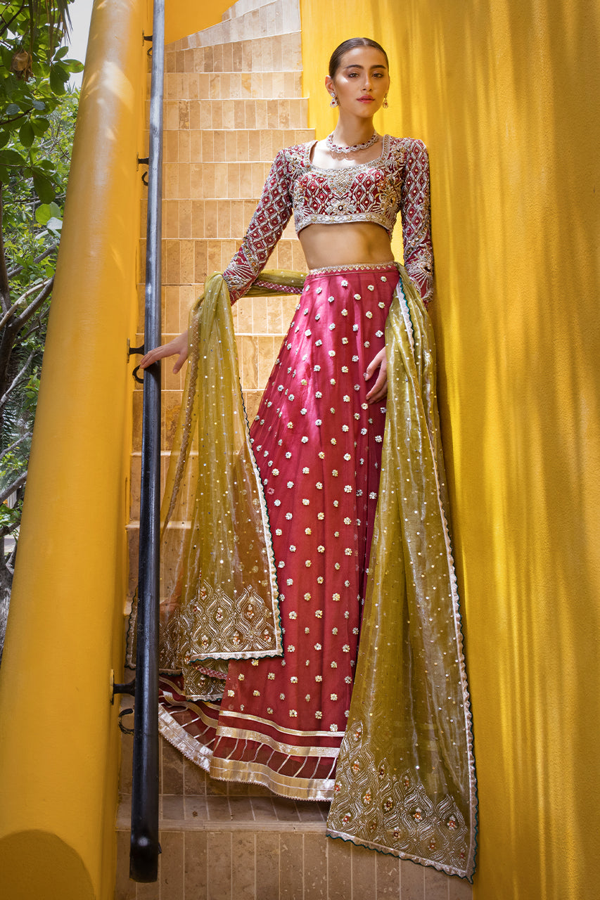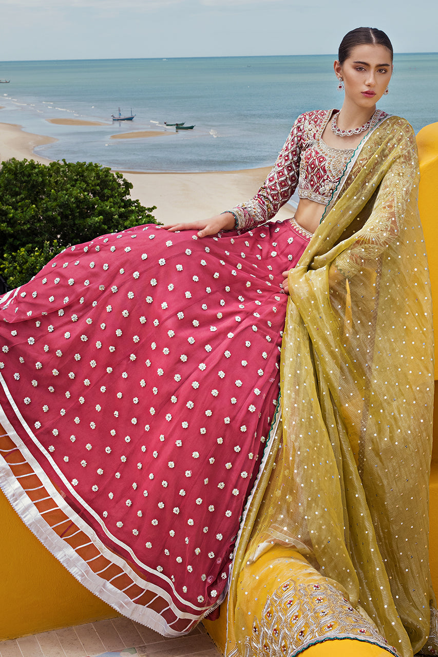 Dance with unparalleled grace in the embrace of pink Melody. Our enchanting ensemble redefines tradition, featuring a captivating pink net lehenga adorned with intricate sequins and delicate lace detailing. The artfully embroidered choli complements the lehenga effortlessly, while the contrasting handcrafted bordered dupatta adds a touch of elegance to your dance.