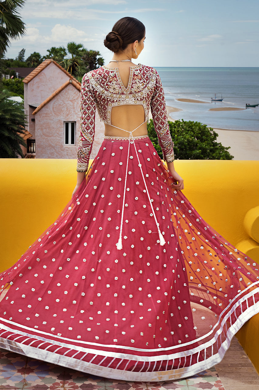Dance with unparalleled grace in the embrace of pink Melody. Our enchanting ensemble redefines tradition, featuring a captivating pink net lehenga adorned with...