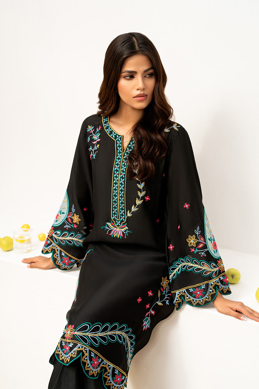 Unveil elegance in every detail with this black khaddi silk knee-length shirt enhanced with intricate cutwork, scalloped borders, and delicate embroidery on daman...