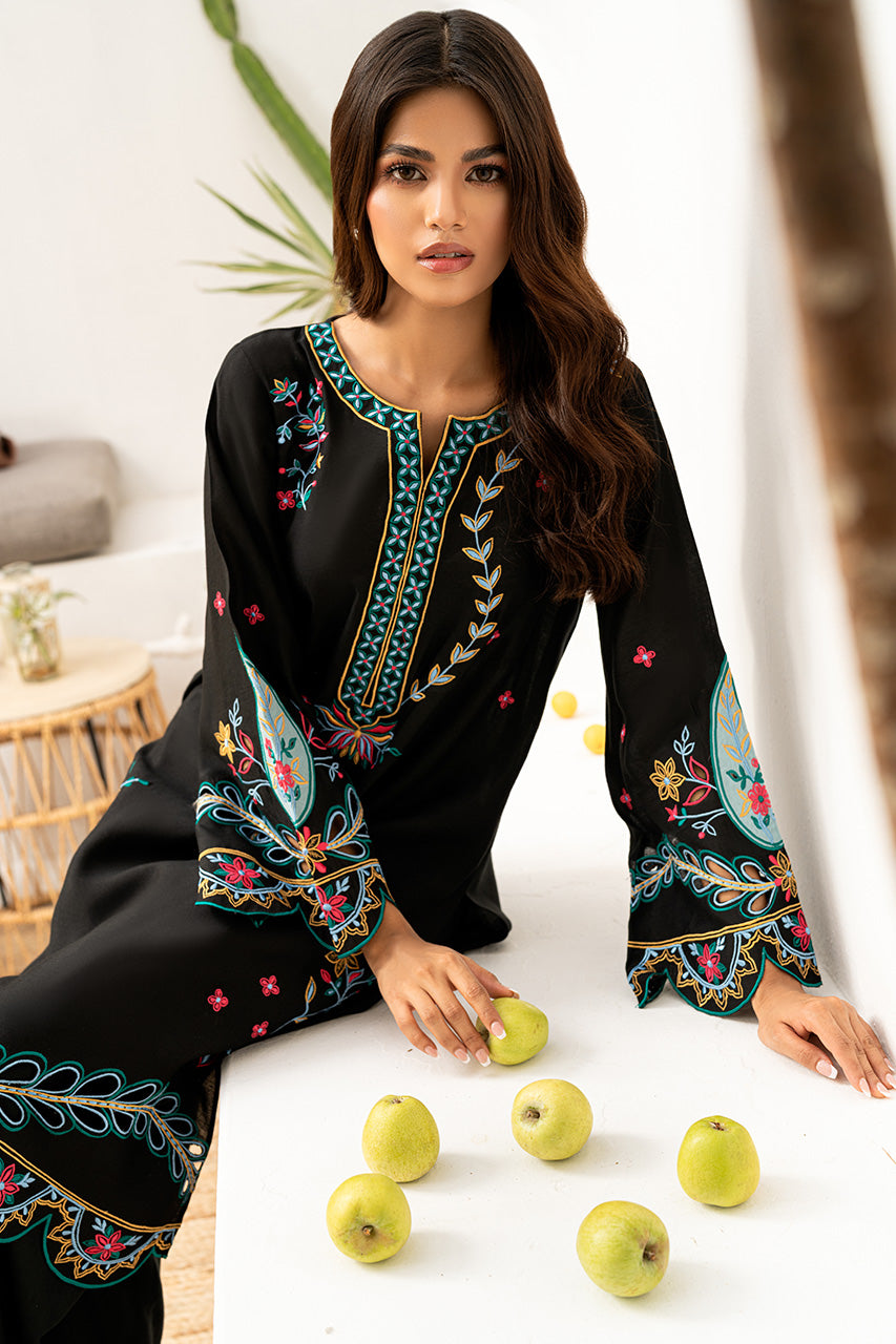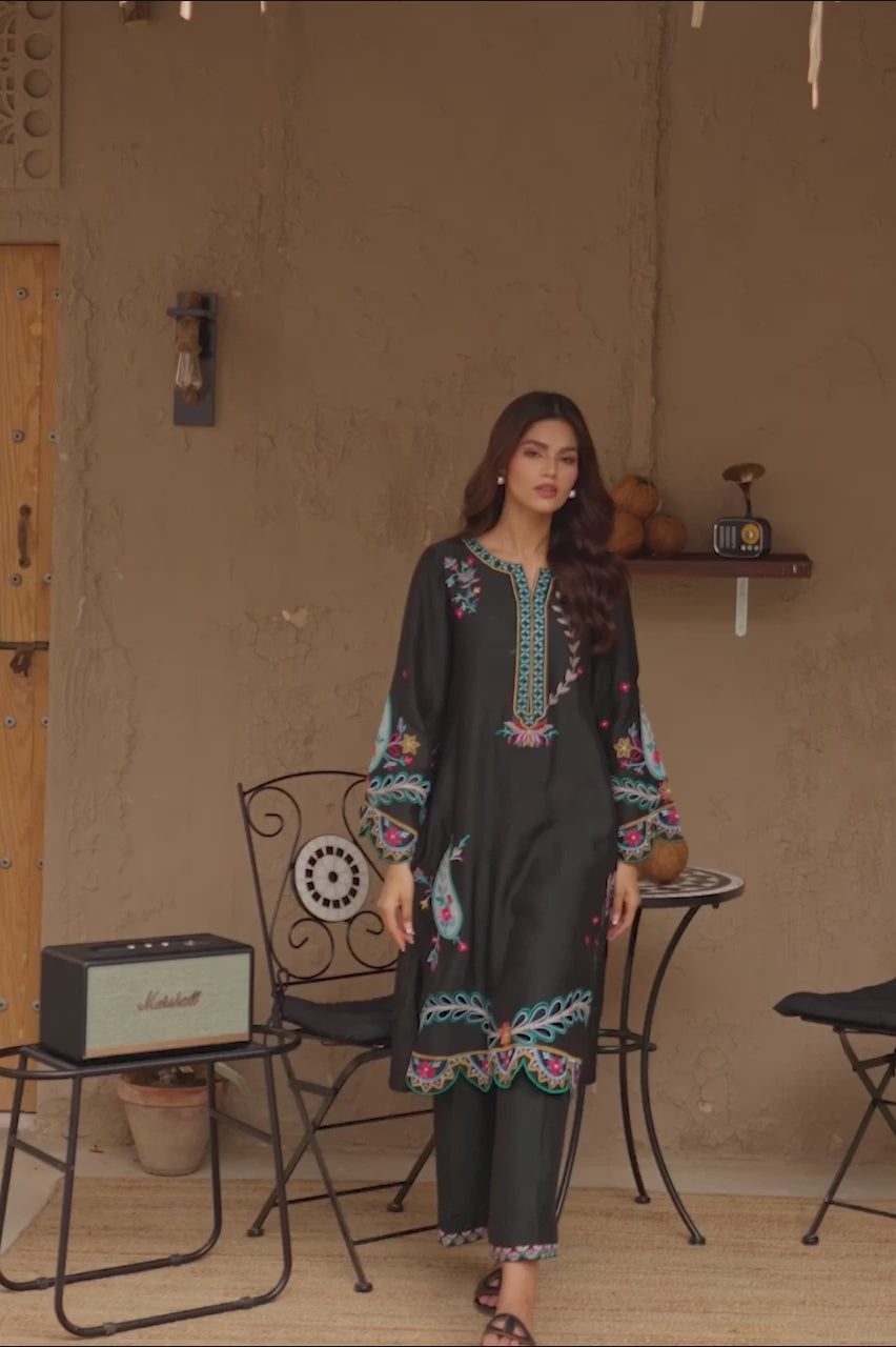 Unveil elegance in every detail with this black khaddi silk knee-length shirt enhanced with intricate cutwork, scalloped borders, and delicate embroidery on daman and sleeves. The complementing khaddi cotton izaar pants are paired to complete the look, making this a true statement of timeless sophistication.