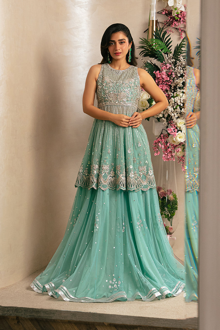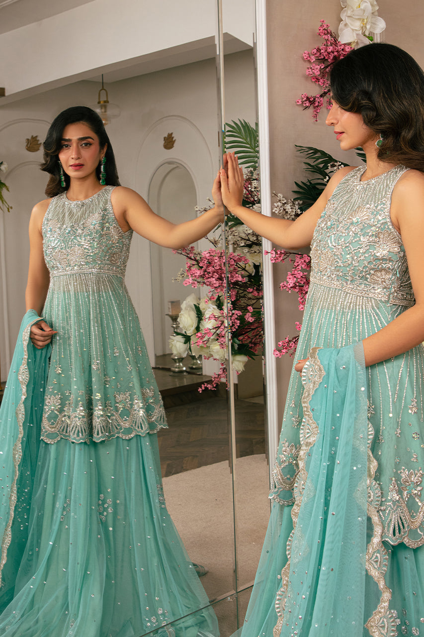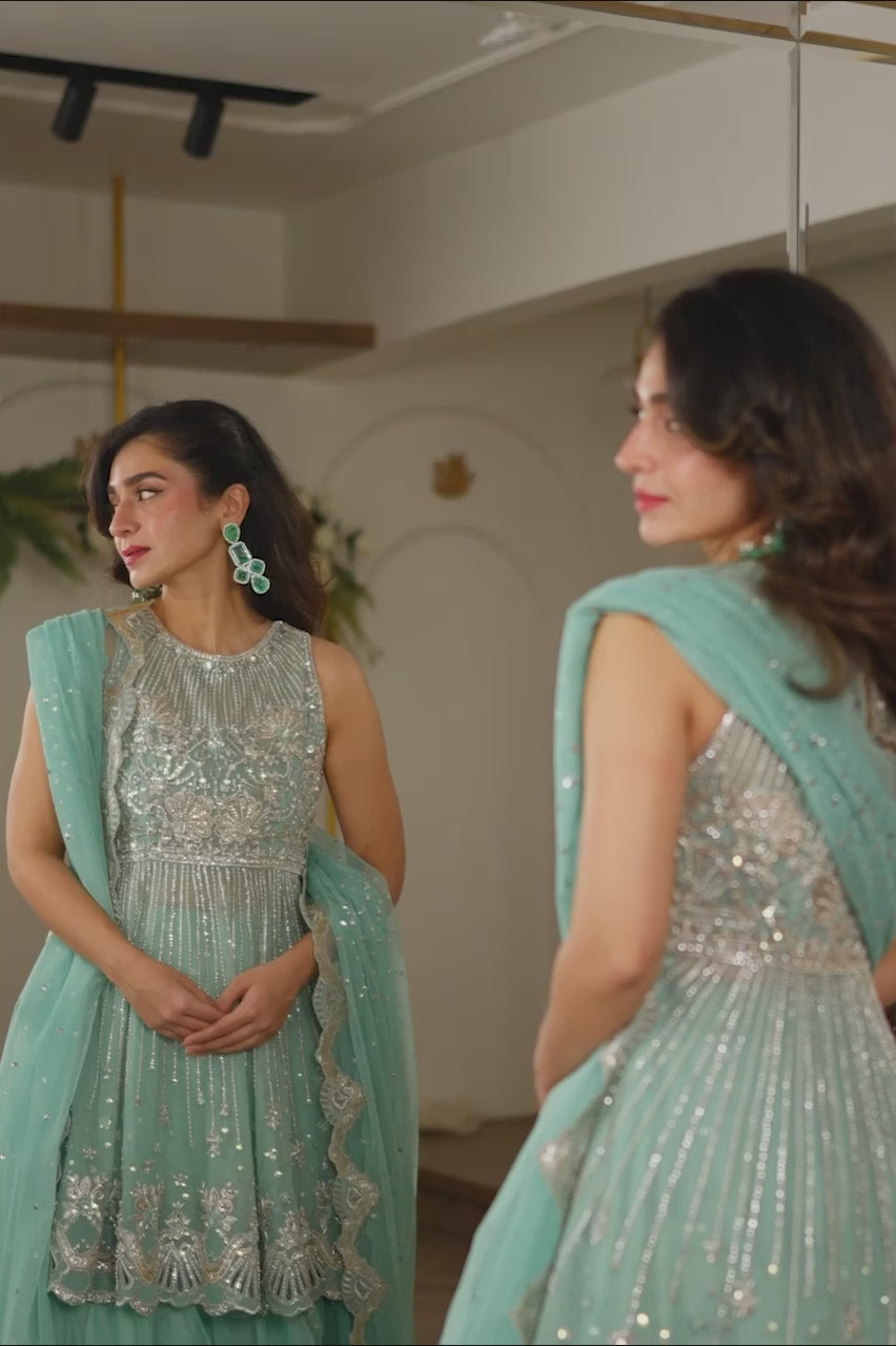 A graceful Sea Green short Peplum shirt made in French net, featuring intricate hand embellishments on the bodice and flair, with slimming hand-embroidered lines for a flattering silhouette, and finished with a delicate border. Pair it with a French Net lehenga adorned with a floral spray and booti-chan design. Complete the ensemble with a complimenting French Net dupatta, beautifully detailed with a hand-embroidered scalloped border and a sequins spray for an elegant touch.