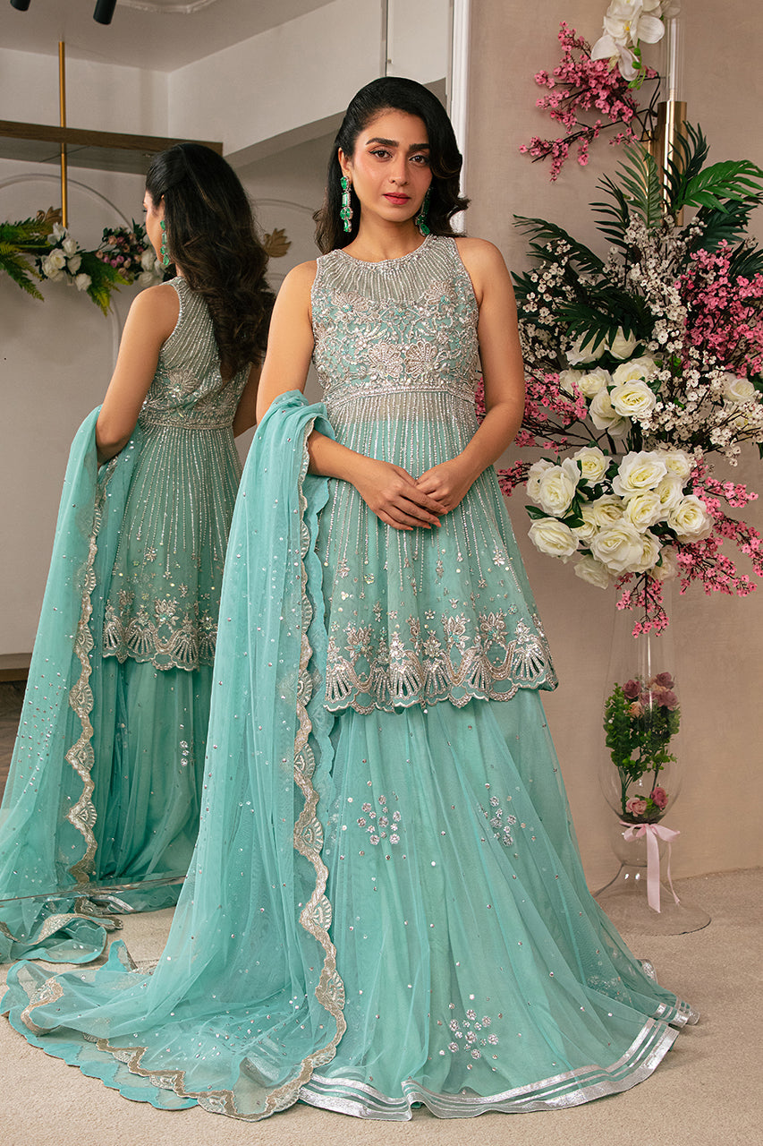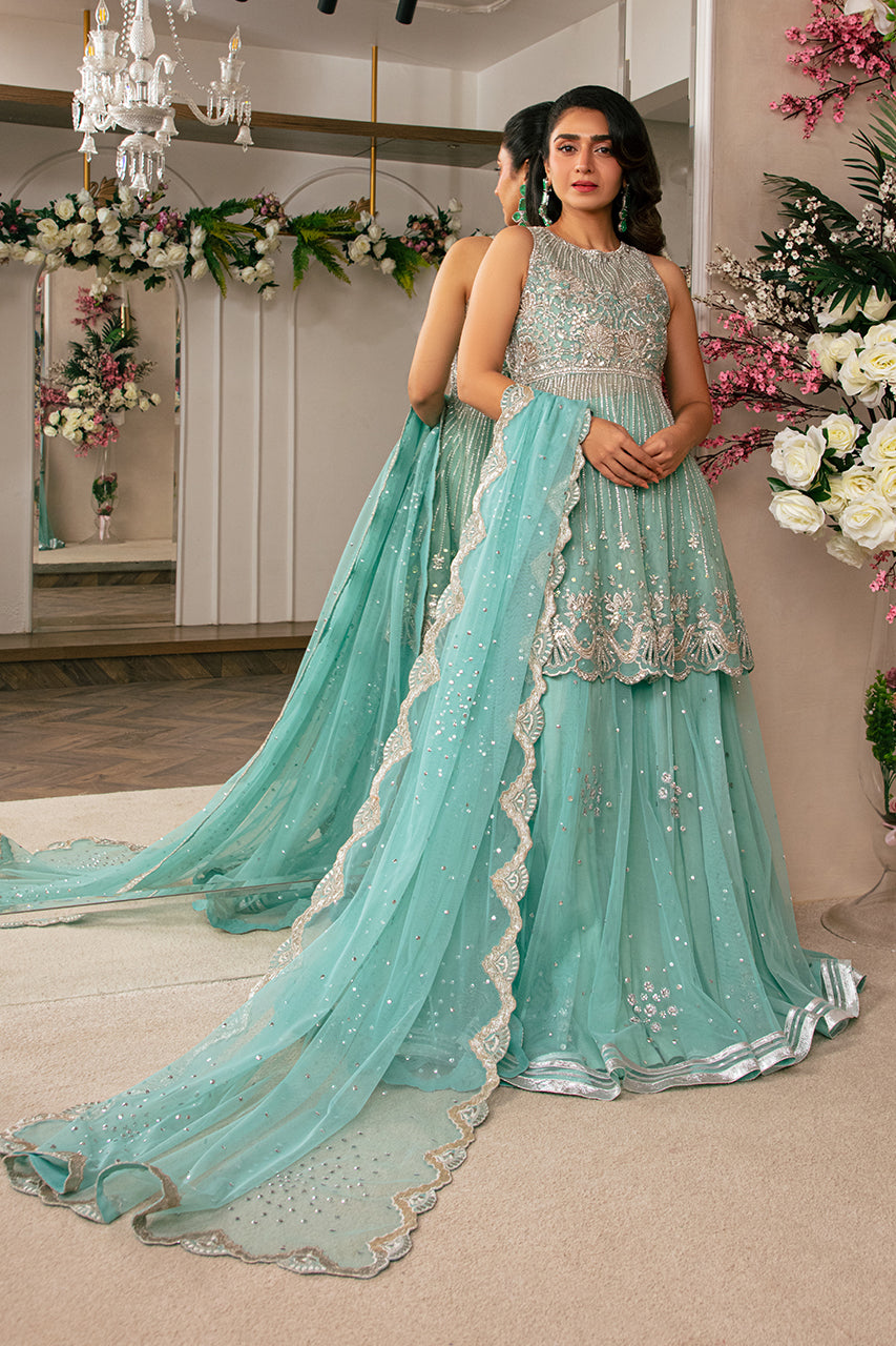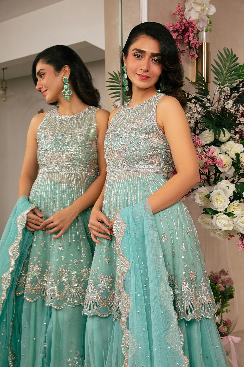 A graceful Sea Green short Peplum shirt made in French net, featuring intricate hand embellishments on the bodice and flair, with slimming hand-embroidered lines for a flattering silhouette, and finished with a delicate border. Pair it with a French Net lehenga adorned with a floral spray and booti-chan design. Complete the ensemble with a complimenting French Net dupatta, beautifully detailed with a hand-embroidered scalloped border and a sequins spray for an elegant touch.