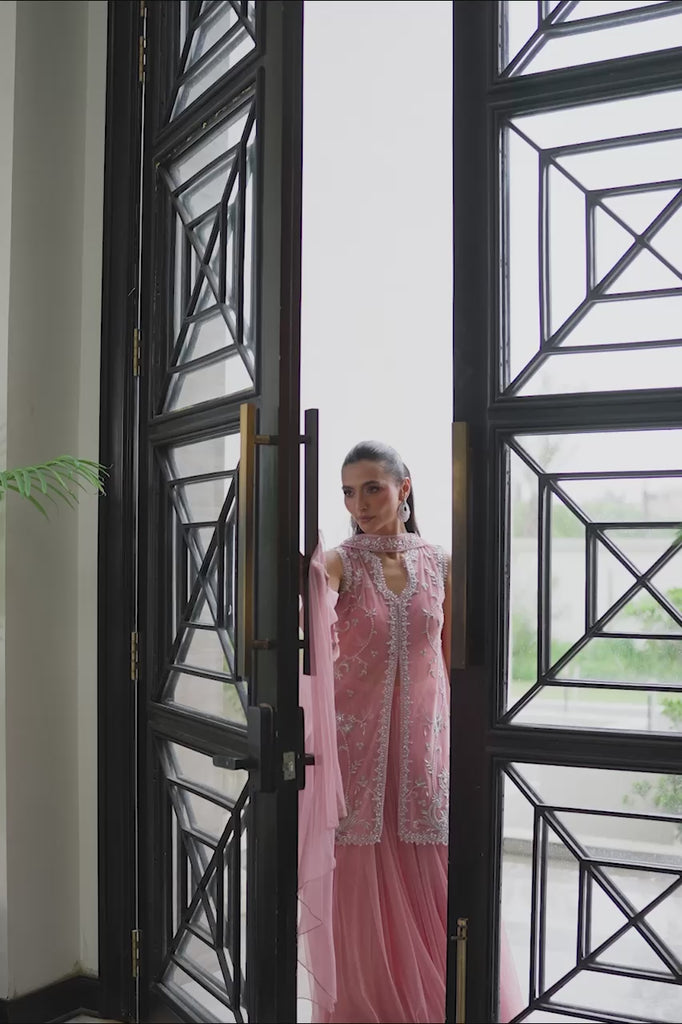 A delicate pink short French net front-open shirt, richly adorned with heavy embellishment that shimmers with intricate craftsmanship. The design i... see more