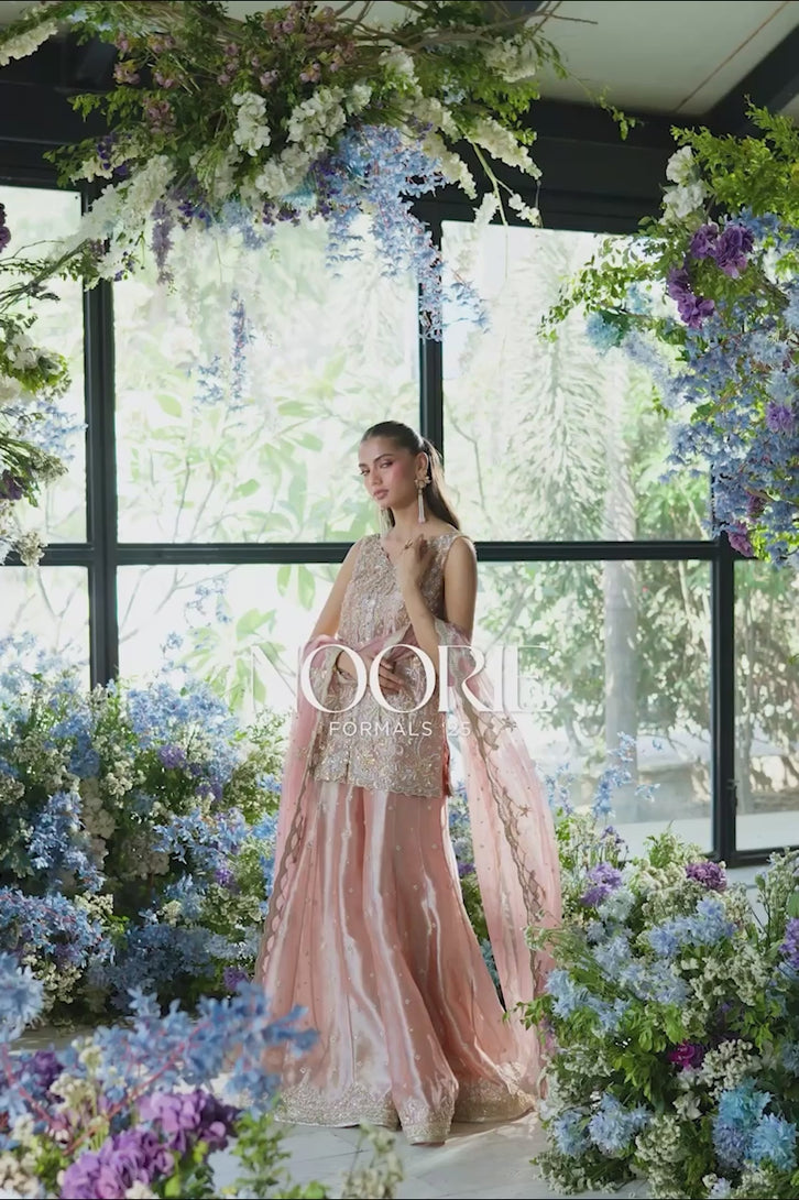 A dreamy light pink pure lame short shirt, lavishly embroidered with intricate detailing and delicate cutwork on the back, adorned with graceful tassel hangings. Paired with matching pure lame Dhaka pants featuring shimmering sequin work and refined finishing along the borders. The ensemble is completed with a soft French net dupatta, beautifully embellished with sequins and delicate finishing—perfect for a graceful and timeless festive look.