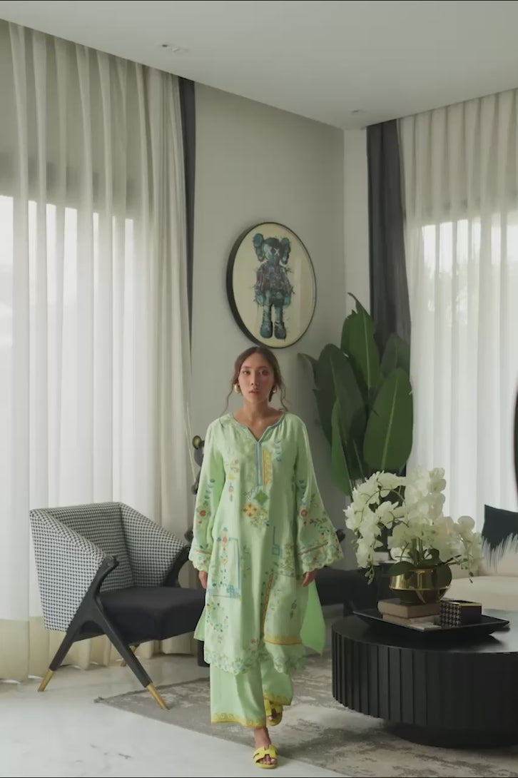 A pistachio green khaddi silk shirt featuring a blend of embroidered floral vines and angular motifs, arranged in a grid-like composition across the shirt front. The design draws from garden trellises and geometric balance, creating a structured yet airy look. Scalloped borders along the sleeves and hemline add softness and a feminine finish. Paired with matching khaddi cotton izaar pants, completed with a tonal embroidered border, Seherin brings quiet precision and elegance to everyday wear.