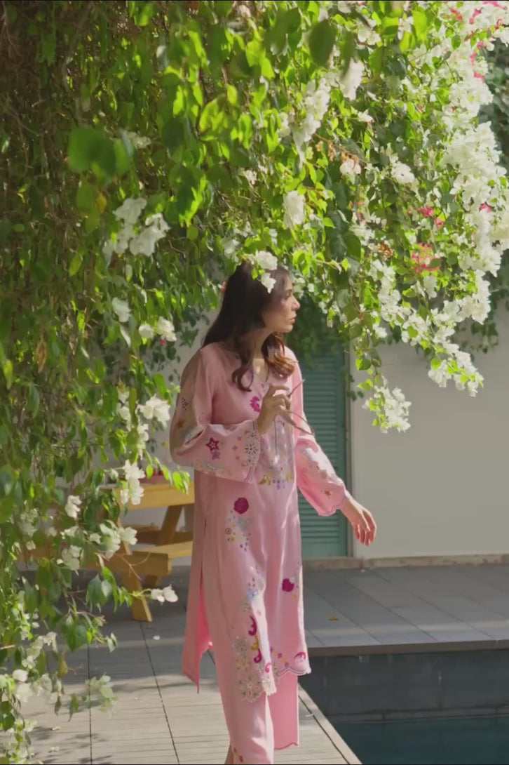 This stunning pink knee-length khadi silk shirt with full sleeves is a blend of traditional elegance and modern flair. The shirt features a mix of intricate floral and geometric patterns, beautifully enhanced with thread embroidery and cutwork that adds texture and depth. The unique design elements come together to create a radiant effect. The scalloped border on the sleeves and hemline adds a delicate, feminine touch, making the shirt truly stand out. Paired with matching pink khadi cotton pants, featuring a scalloped edge and a refined finishing border, the ensemble offers a seamless and sophisticated silhouette. The soft pink hue and detailed embroidery make this outfit both captivating and graceful, perfect for any special occasion where elegance meets contemporary design.