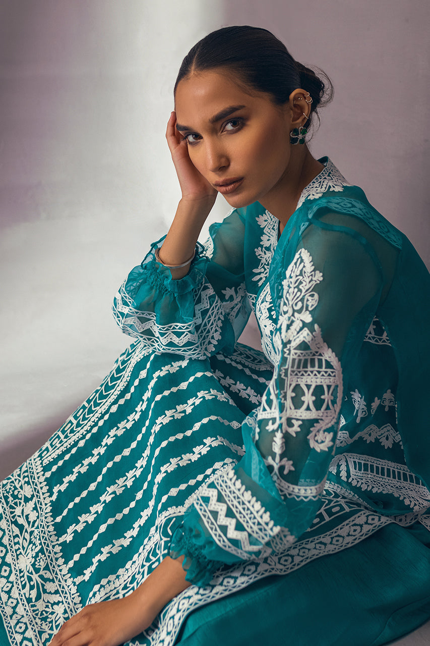 Stacy is an embodiment of voguish fashion trends dipped in Persian green color. A kattan organza-based long shirt encapsulated with ari embroidery worn...