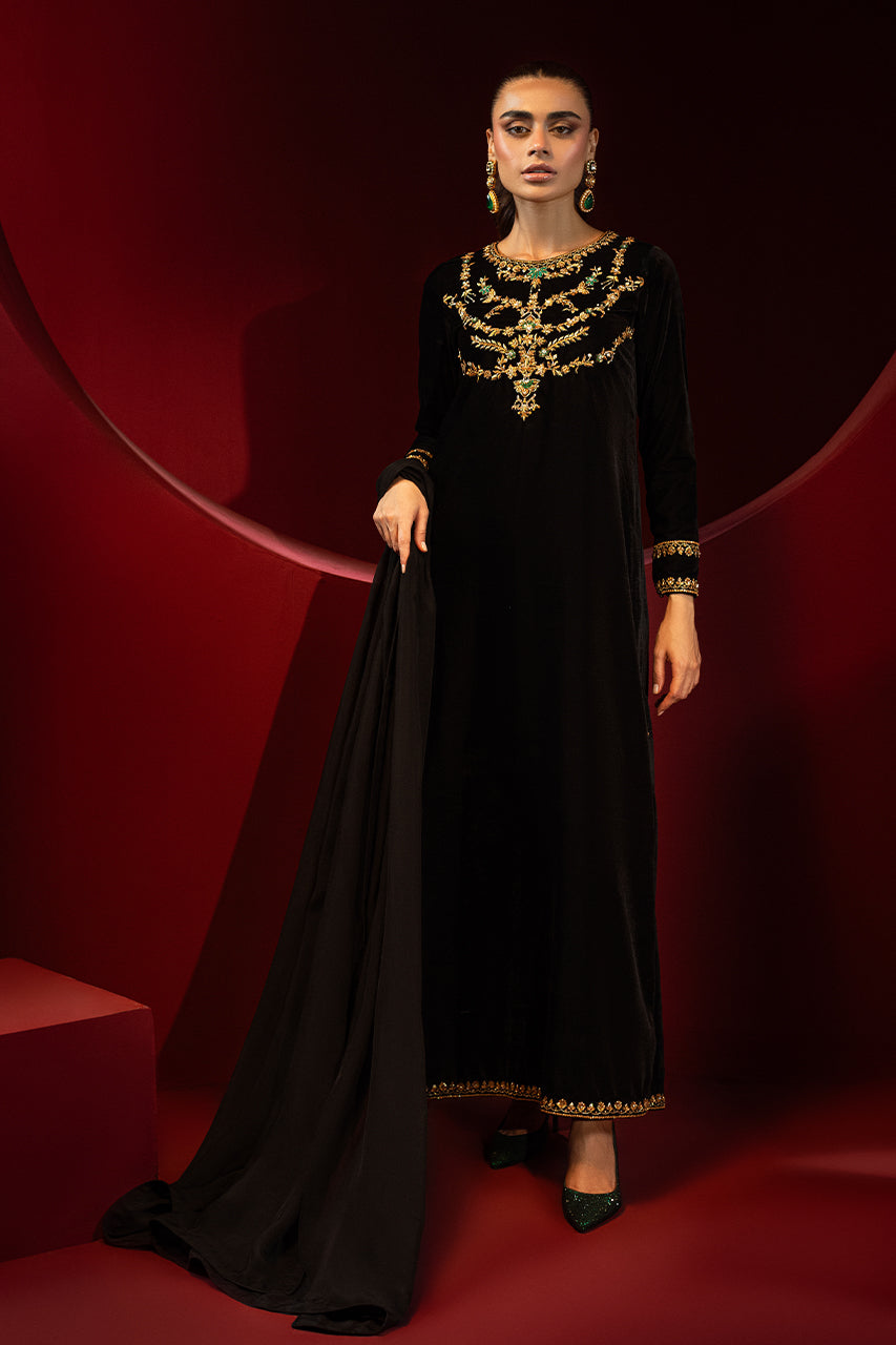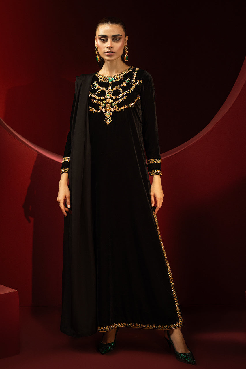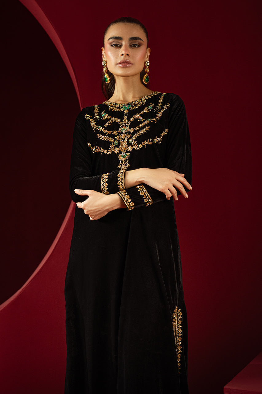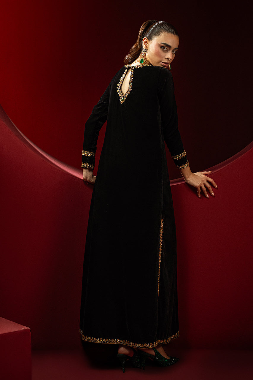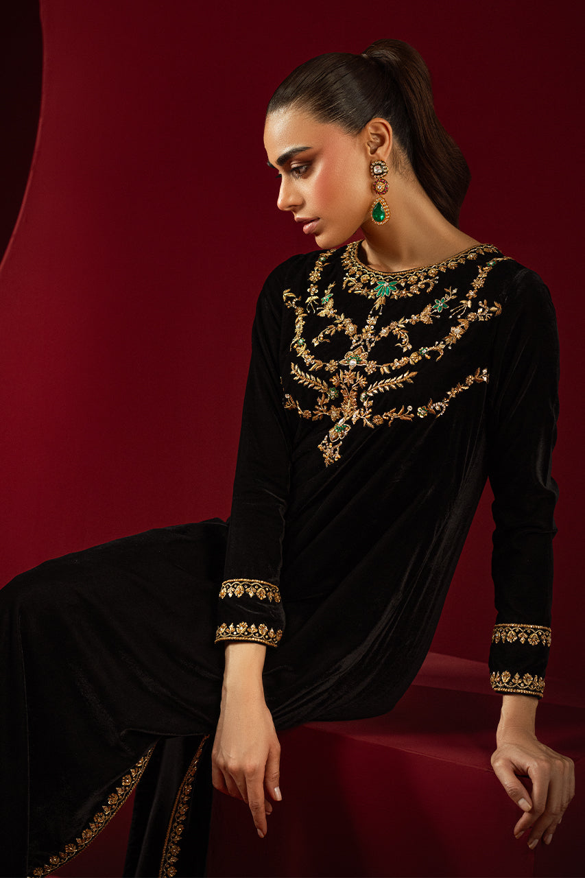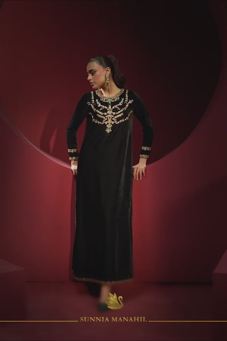 Embrace sophistication with this exquisite black velvet long shirt, perfect for any occasion. The shirt features a heavily embellished neckline that highlights your silhouette, while meticulous finishing borders on the sleeves and hem enhance its charm. A keyhole back adds allure, complemented by refined details. Pair this elegant piece pairs with complimenting velvet straight pants and a medium silk dupatta, offering a graceful drape. Ideal for festive or formal events, this outfit combines traditional elegance with modern style.