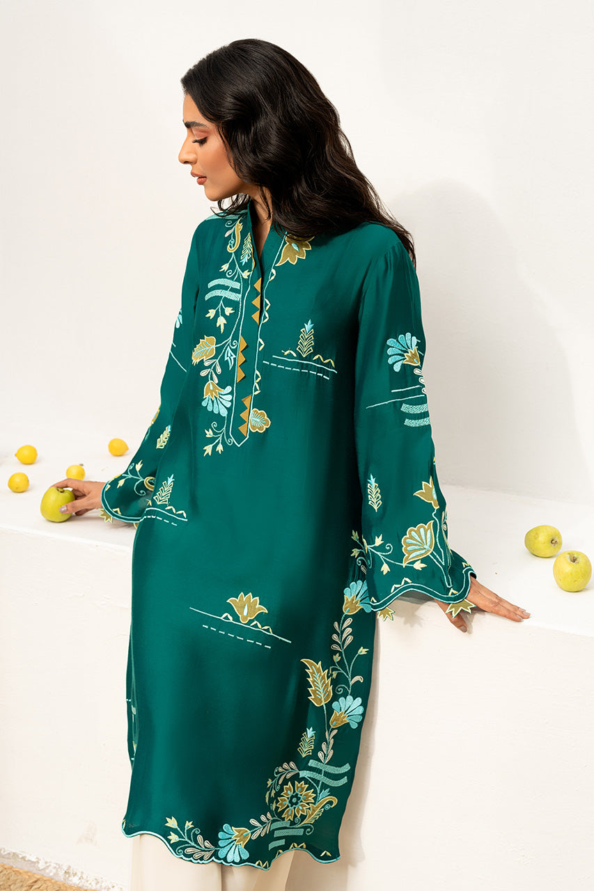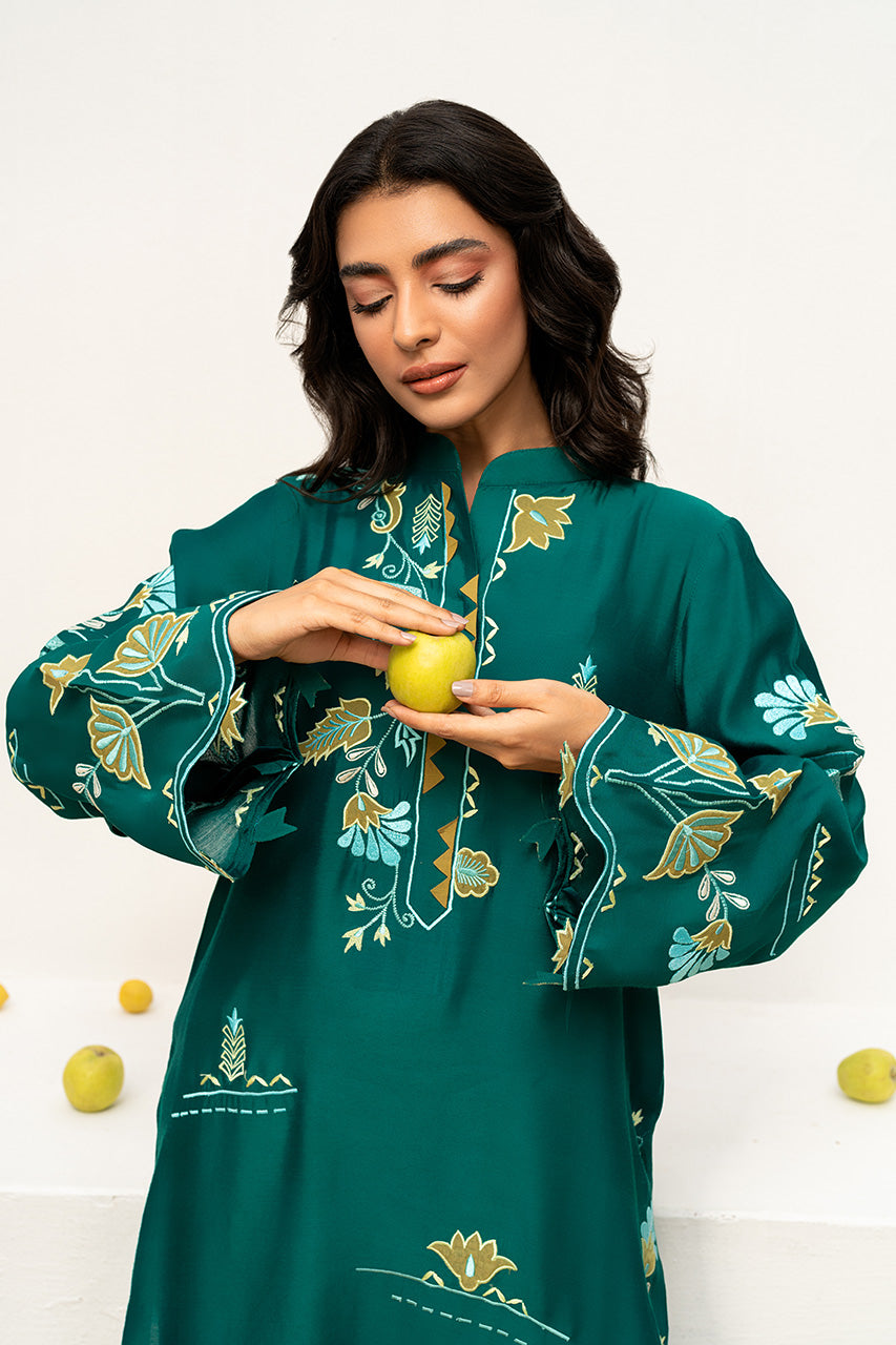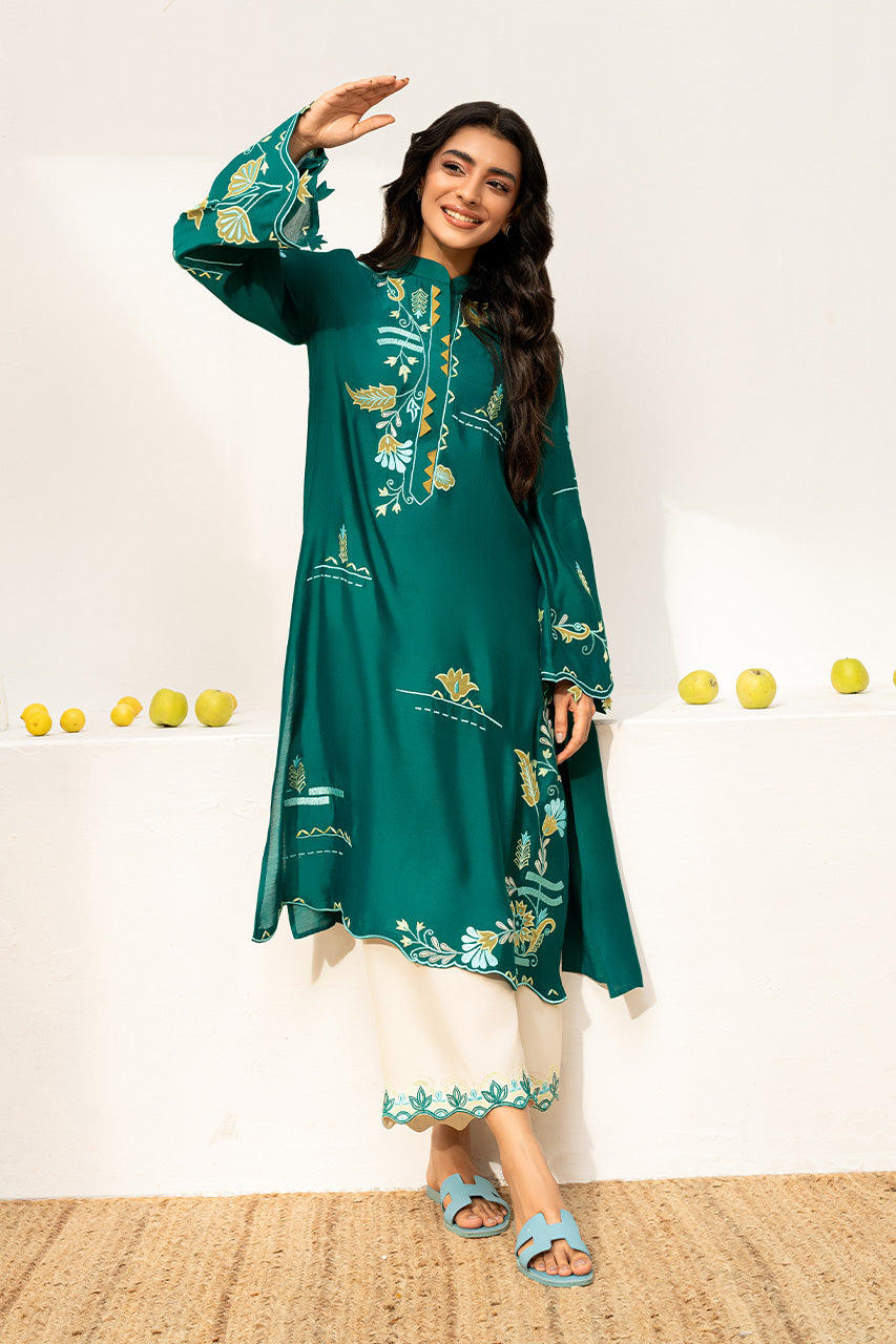 This stunning Teal, Khaddi Silk, outfit brings a refreshing vibe to your wardrobe. The shirt features intricate floral embroidery with applique work in contrasting colors of yellow baby blue and white on the neck, sleeves and daman. The shirt features cutworked leaves on the sleeves and a scalloped hemline adding a soft finish to the outfit. Pair it with cream khaddi cotton pants with embroidered hems. Complete the look with a pair of comfortable slip-on sandals for an effortless yet chic style.