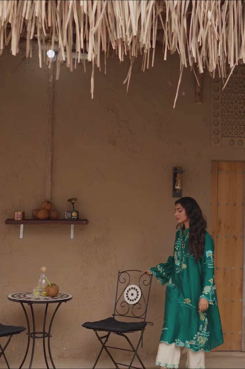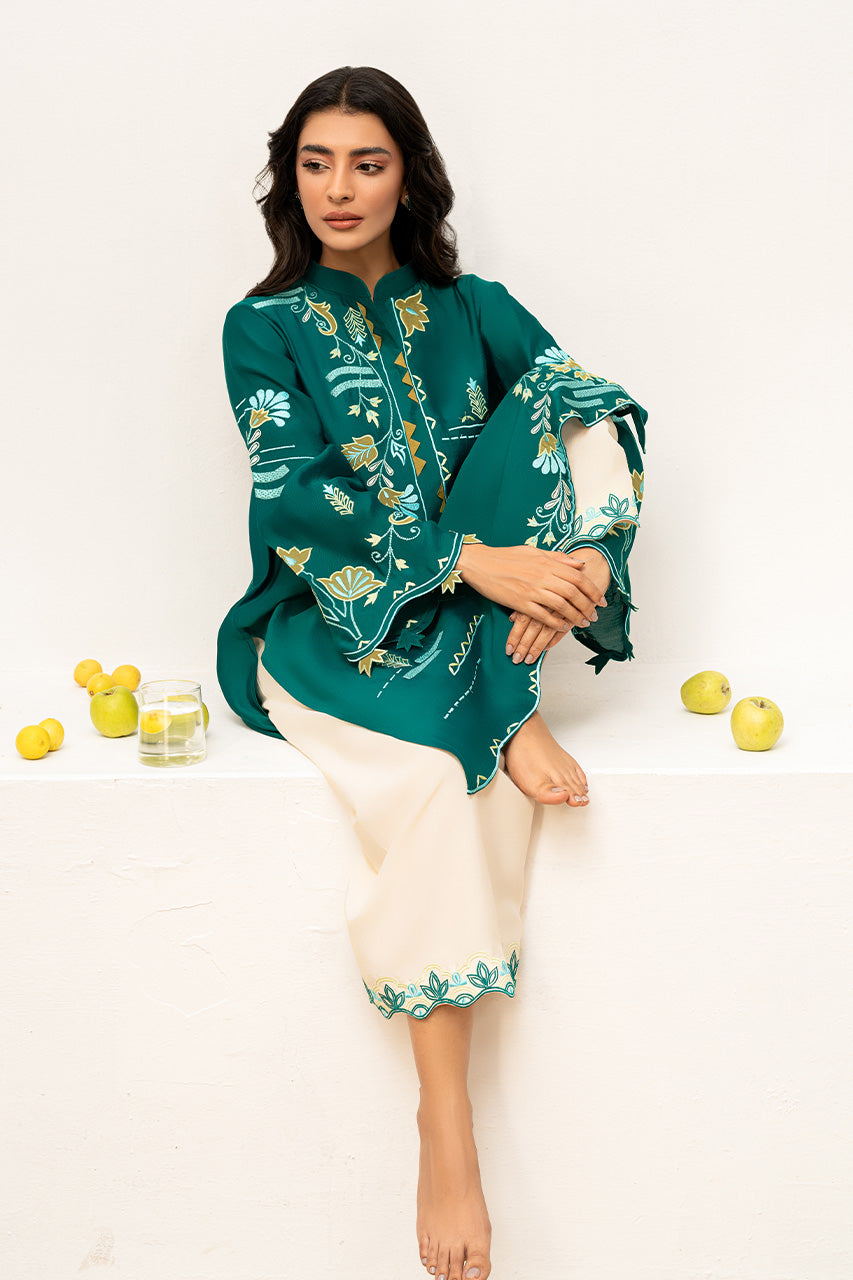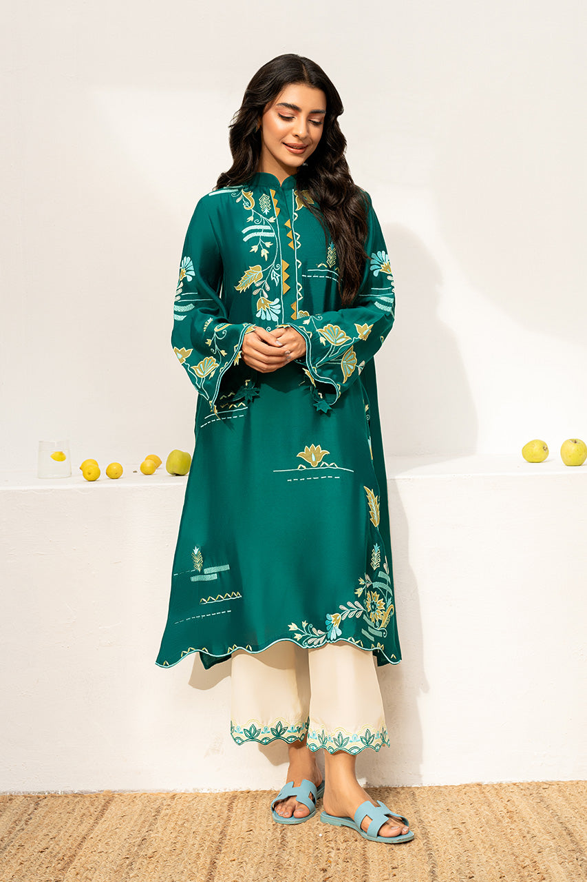 This stunning Teal, Khaddi Silk, outfit brings a refreshing vibe to your wardrobe. The shirt features intricate floral embroidery with applique work in contrasting colors of yellow baby blue and white on the neck, sleeves and daman. The shirt features cutworked leaves on the sleeves and a scalloped hemline adding a soft finish to the outfit. Pair it with cream khaddi cotton pants with embroidered hems. Complete the look with a pair of comfortable slip-on sandals for an effortless yet chic style.