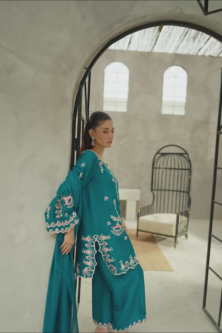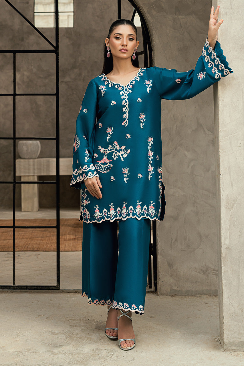 In rich teal raw silk, this short shirt is adorned with intricate multicolored Ari embroidery that enhances its luxurious appeal. Scalloped edges along the hem and sleeves add a graceful, feminine touch, while a plain silk dupatta lends understated sophistication. Paired with tailored raw silk izzar pants, the ensemble strikes the perfect balance between timeless charm and contemporary poise.