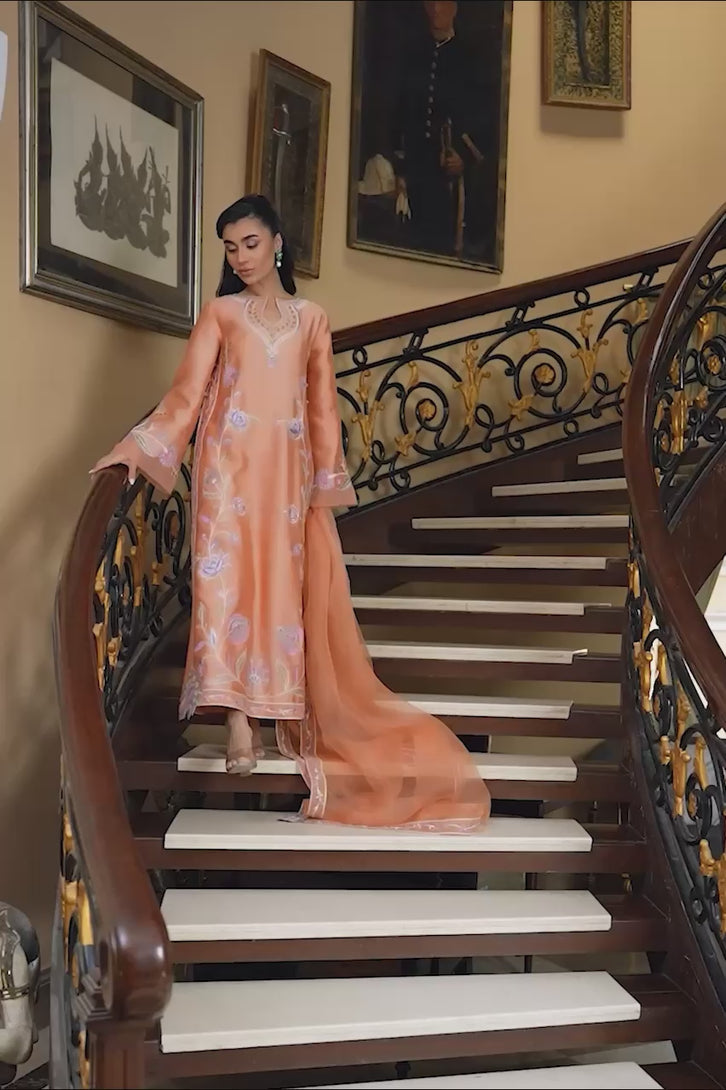A fresh, cool-toned coral outfit adorned with soft floral embroidery in soothing shades of lavender, sage, and blue. The classic long straight shirt features a beautifully detailed neckline and an equally elegant embroidered back. The subtle color palette enhances the freshness of the coral base while maintaining a timeless appeal. Pair it with matching Masoori Silk embroidered pants and Pure Organza dupatta with four side embroidered borders. Perfect for daytime festivities or elegant gatherings.