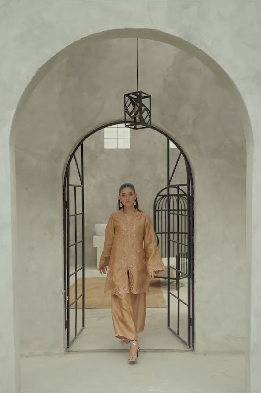Tailored from rich brown masoori silk, this front slit short shirt is adorned with exquisite, multi‑style embroidery and hand work that blends elegance with intricate artistry. The ensemble is paired with matching straight masoori silk pants, beautifully finished for a refined touch, and a plain silk dupatta that adds understated grace. A perfect balance of contemporary silhouette and timeless sophistication.