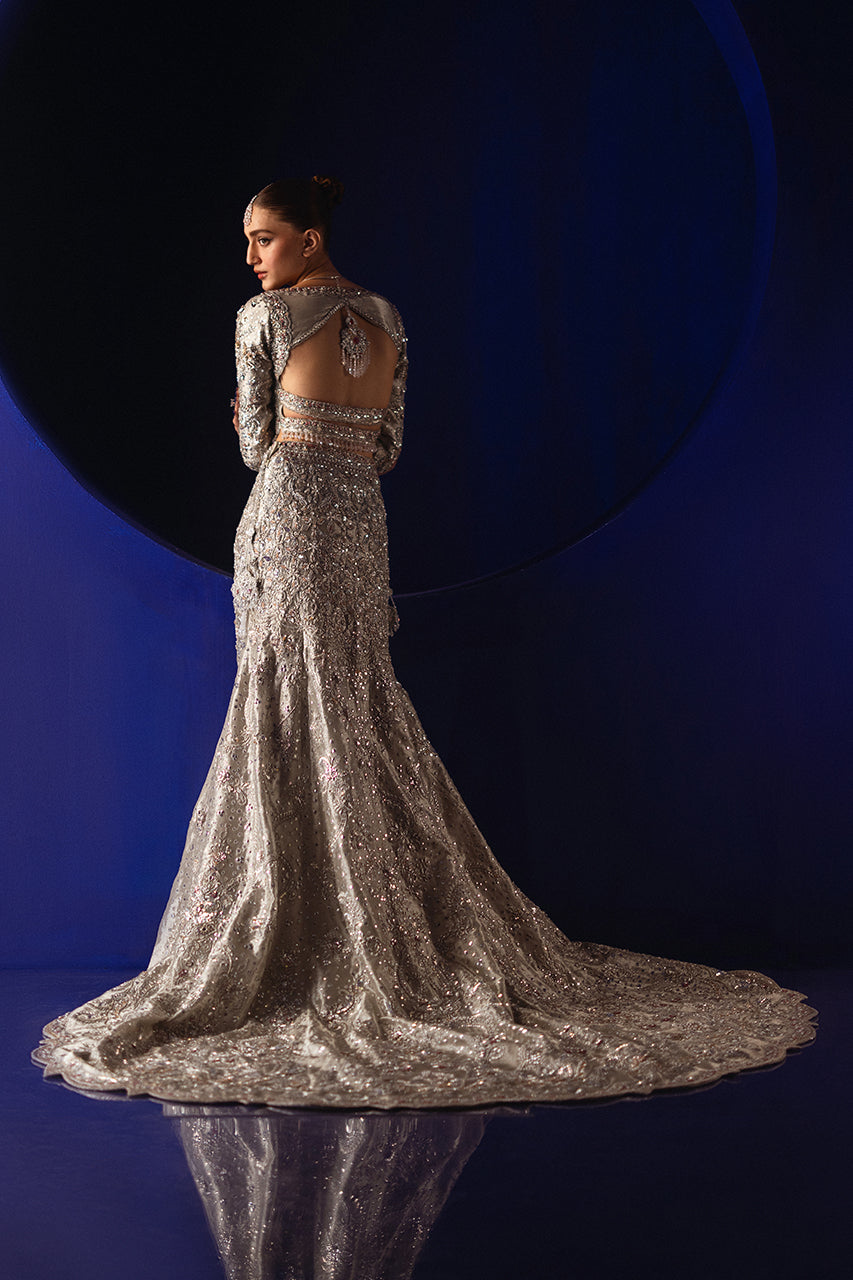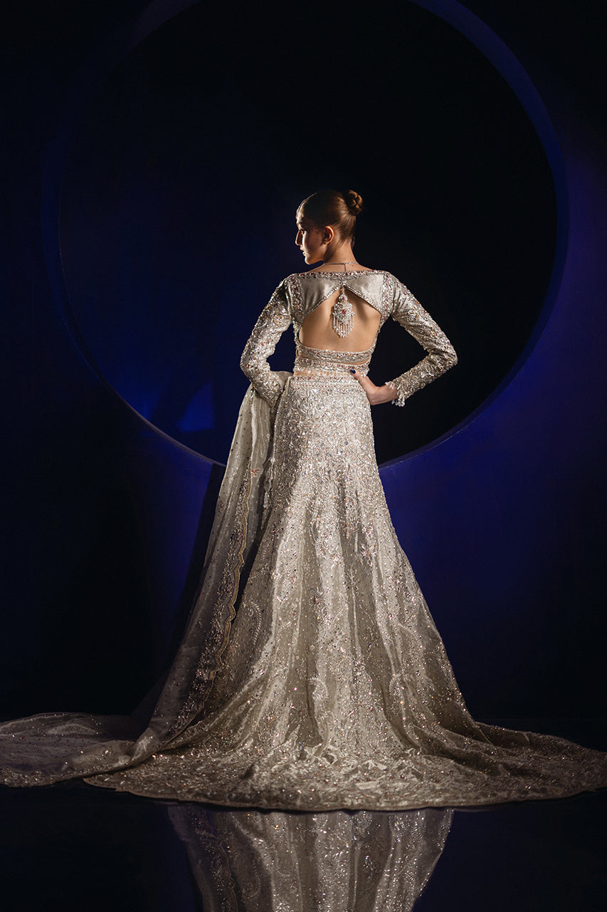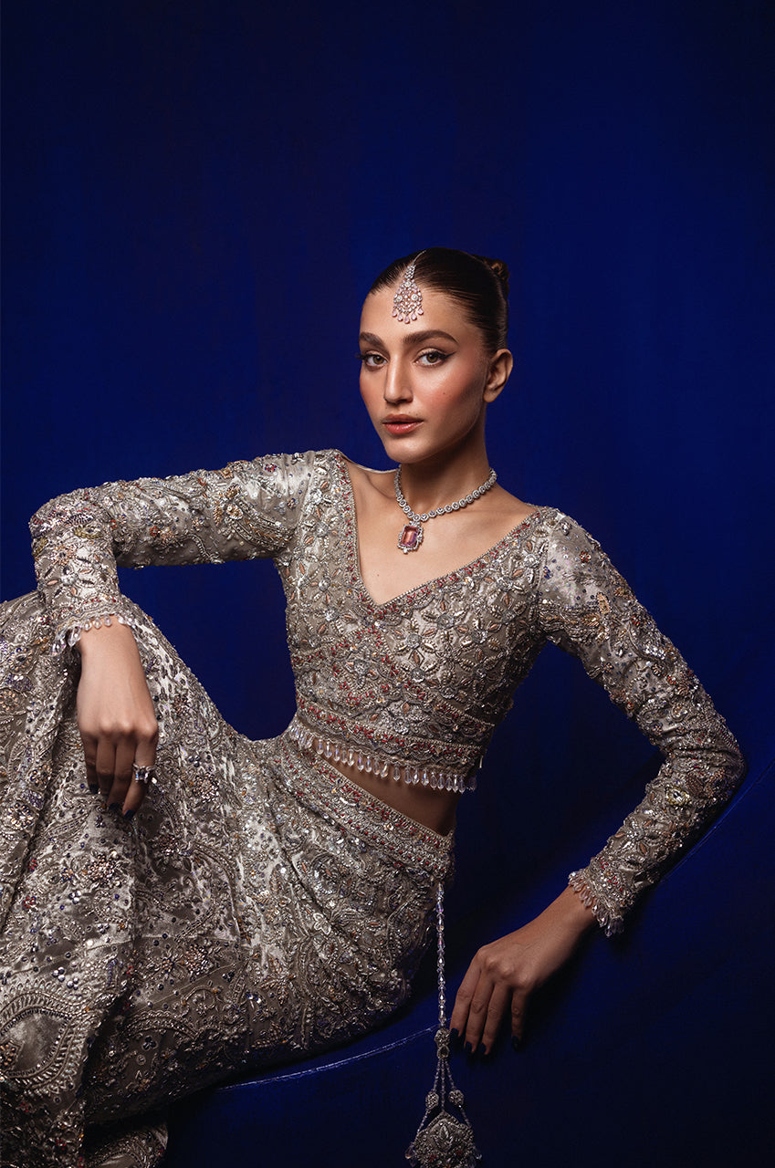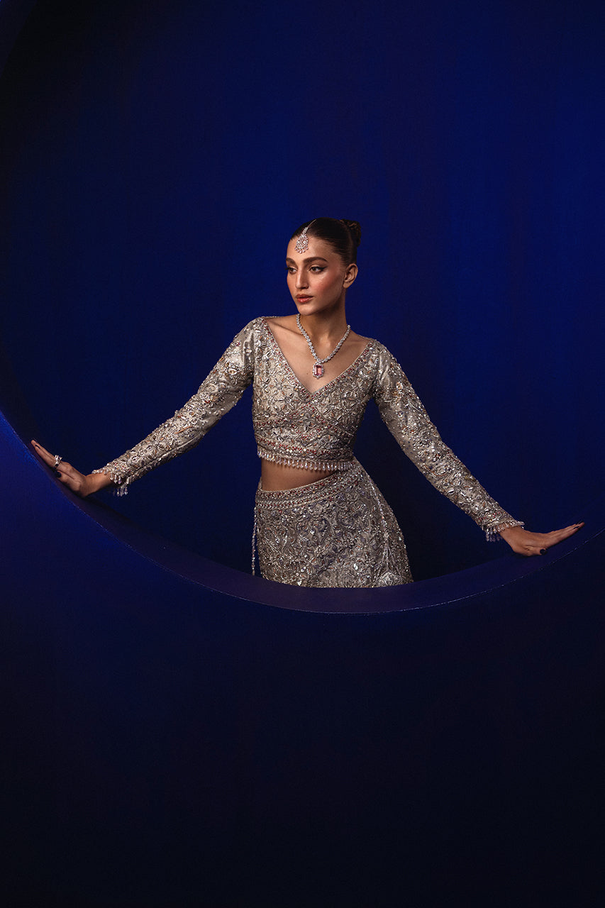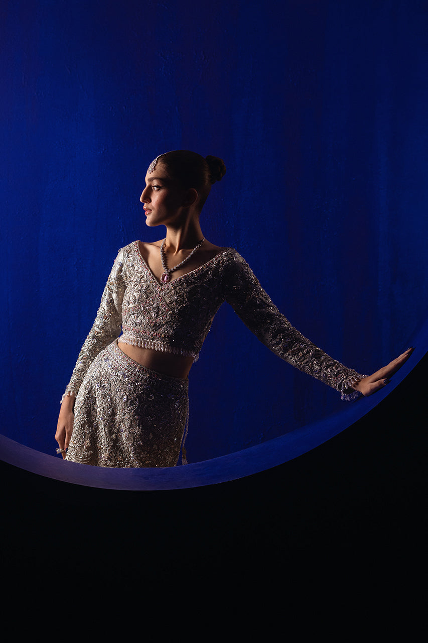 Radiate with elegance in this stunning silver lehnga choli crafted on a Masuri lame base. The choli is intricately crafted featuring graceful floral work accented with silver, and gold. Scalloped edges add elegance, while crystal hangings at the waist provide a touch of sparkle. The heavily embellished full sleeves are also finished with dangling crystals while the back-open design is further enhanced with tassels adding an alluring finish.
