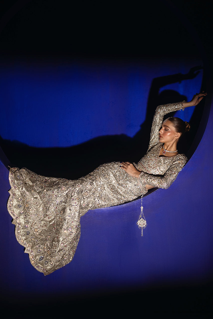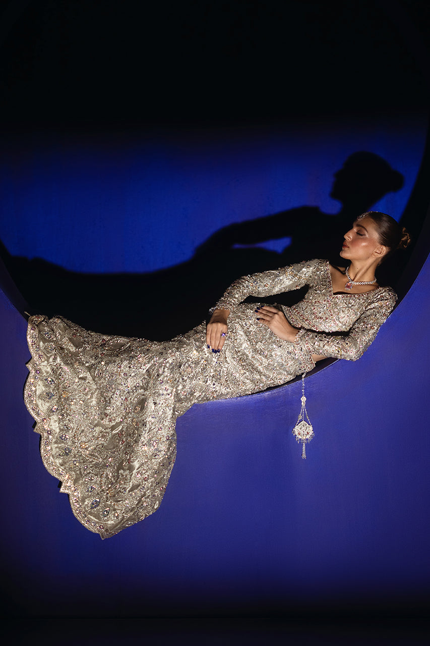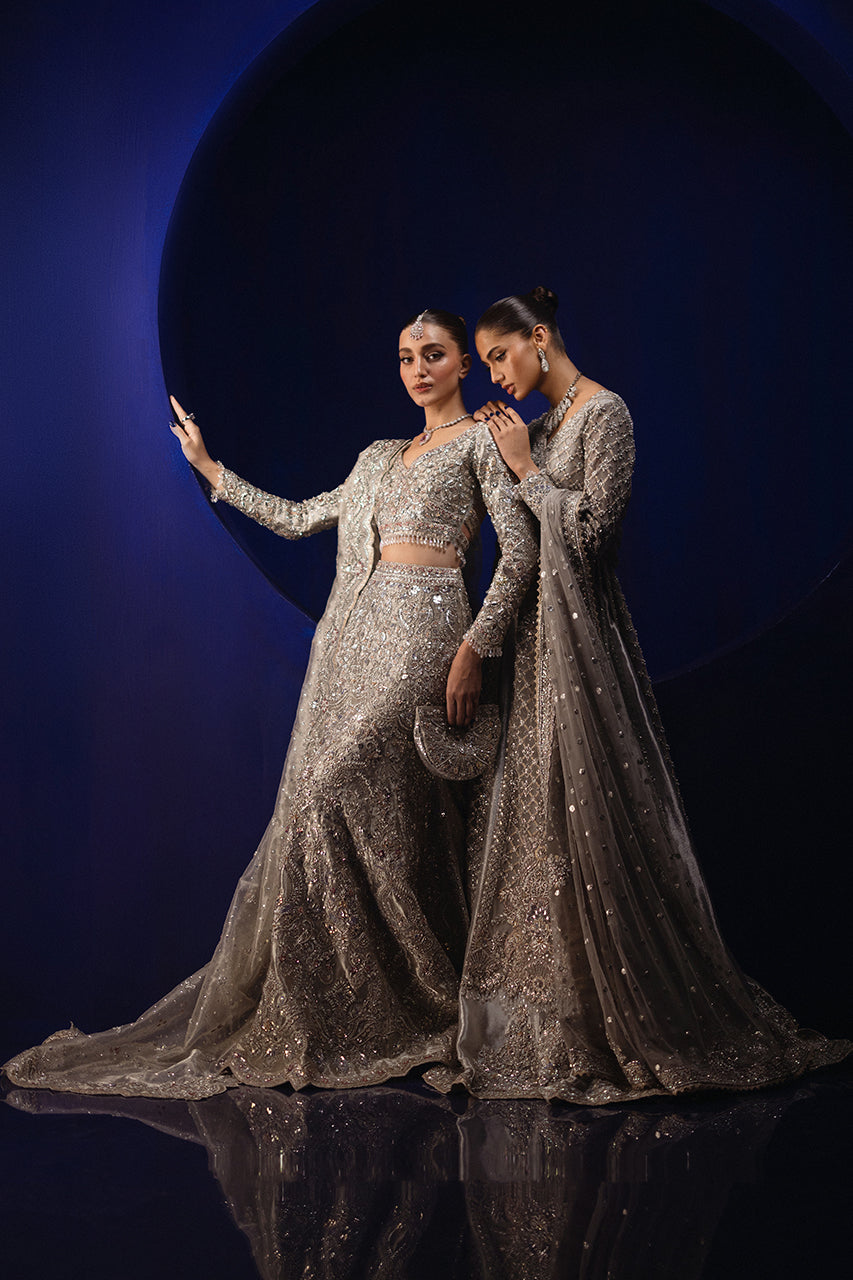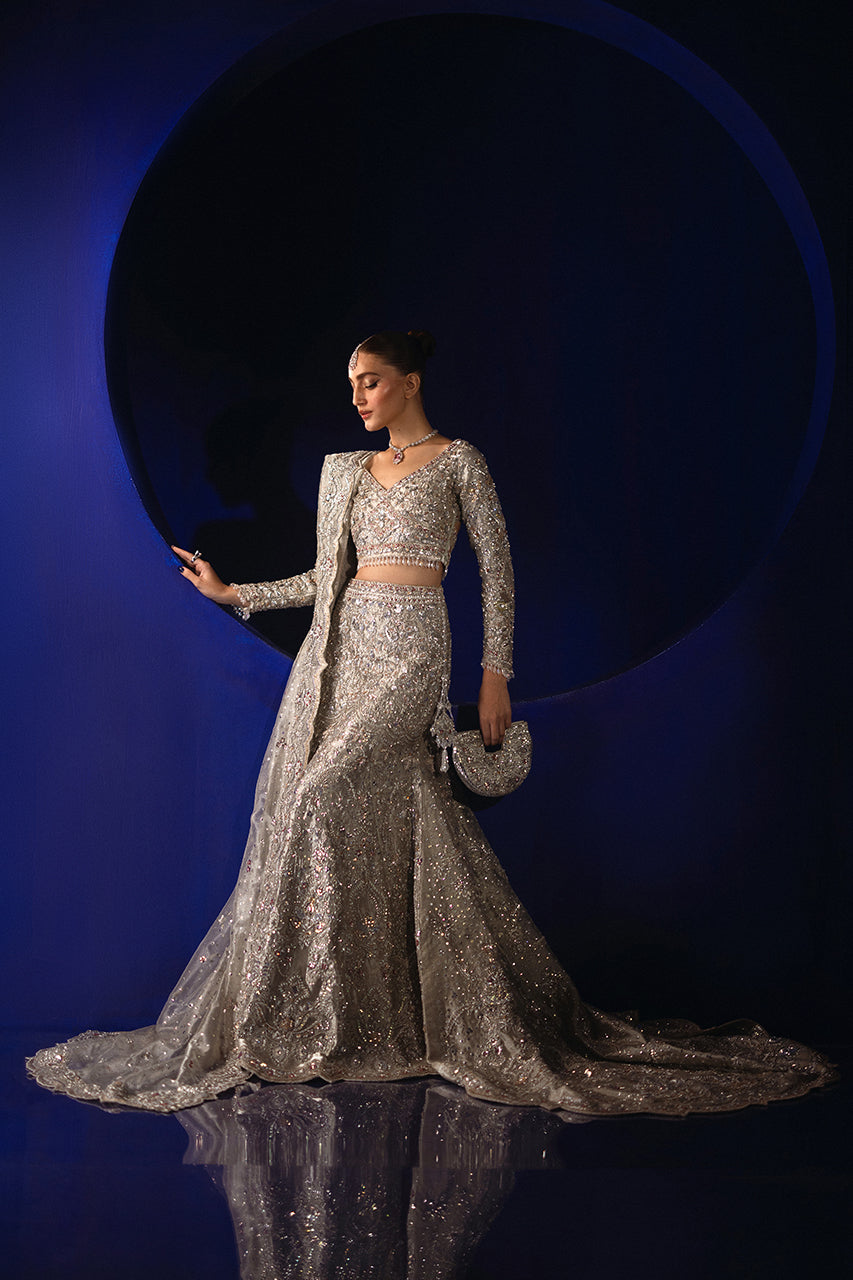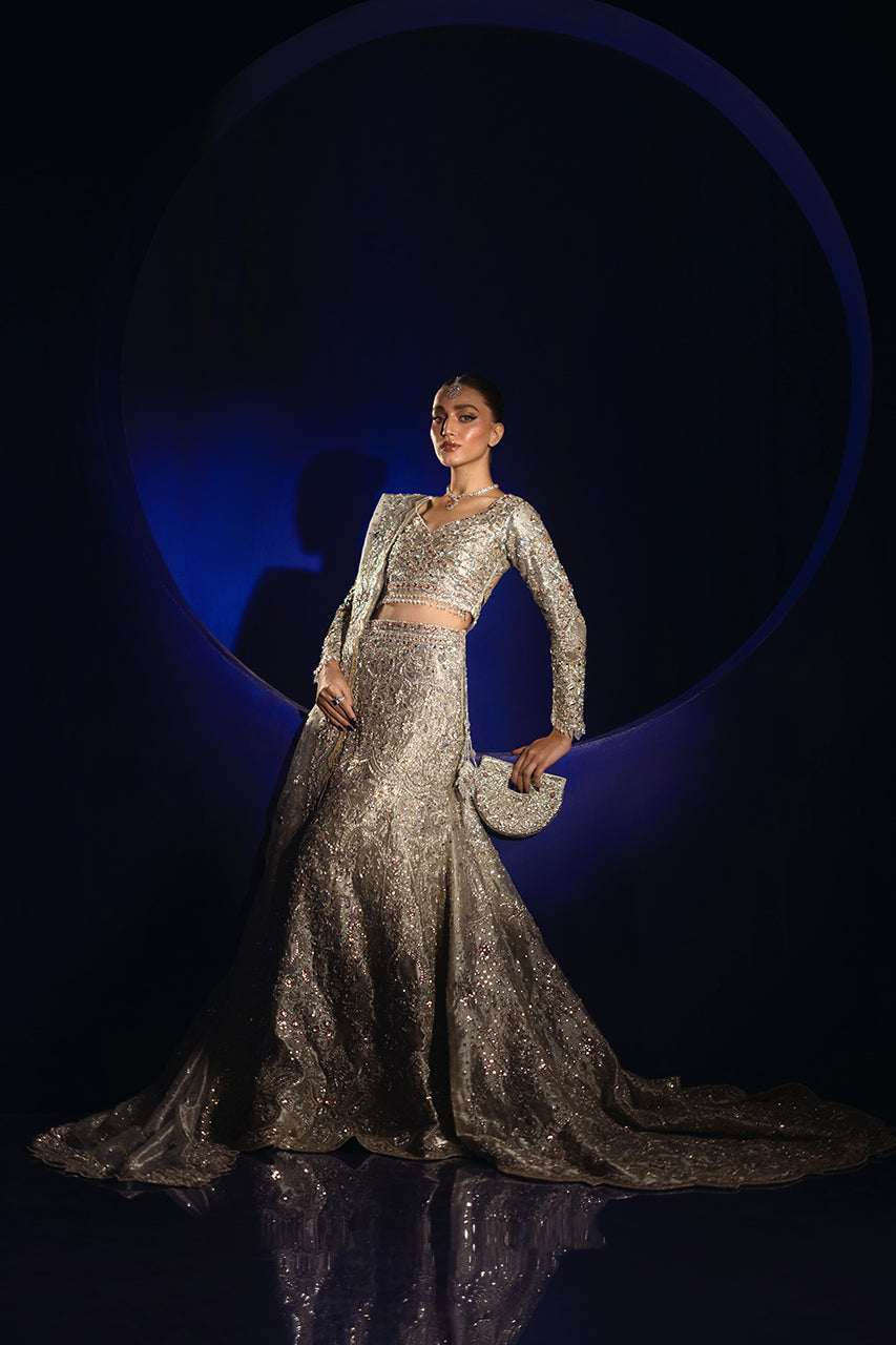 Radiate with elegance in this stunning silver lehnga choli crafted on a Masuri lame base. The choli is intricately crafted featuring graceful floral work accented with silver, and gold. Scalloped edges add elegance, while crystal hangings at the waist provide a touch of sparkle. The heavily embellished full sleeves are also finished with dangling crystals while the back-open design is further enhanced with tassels adding an alluring finish.