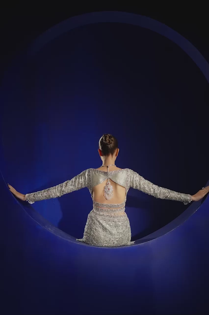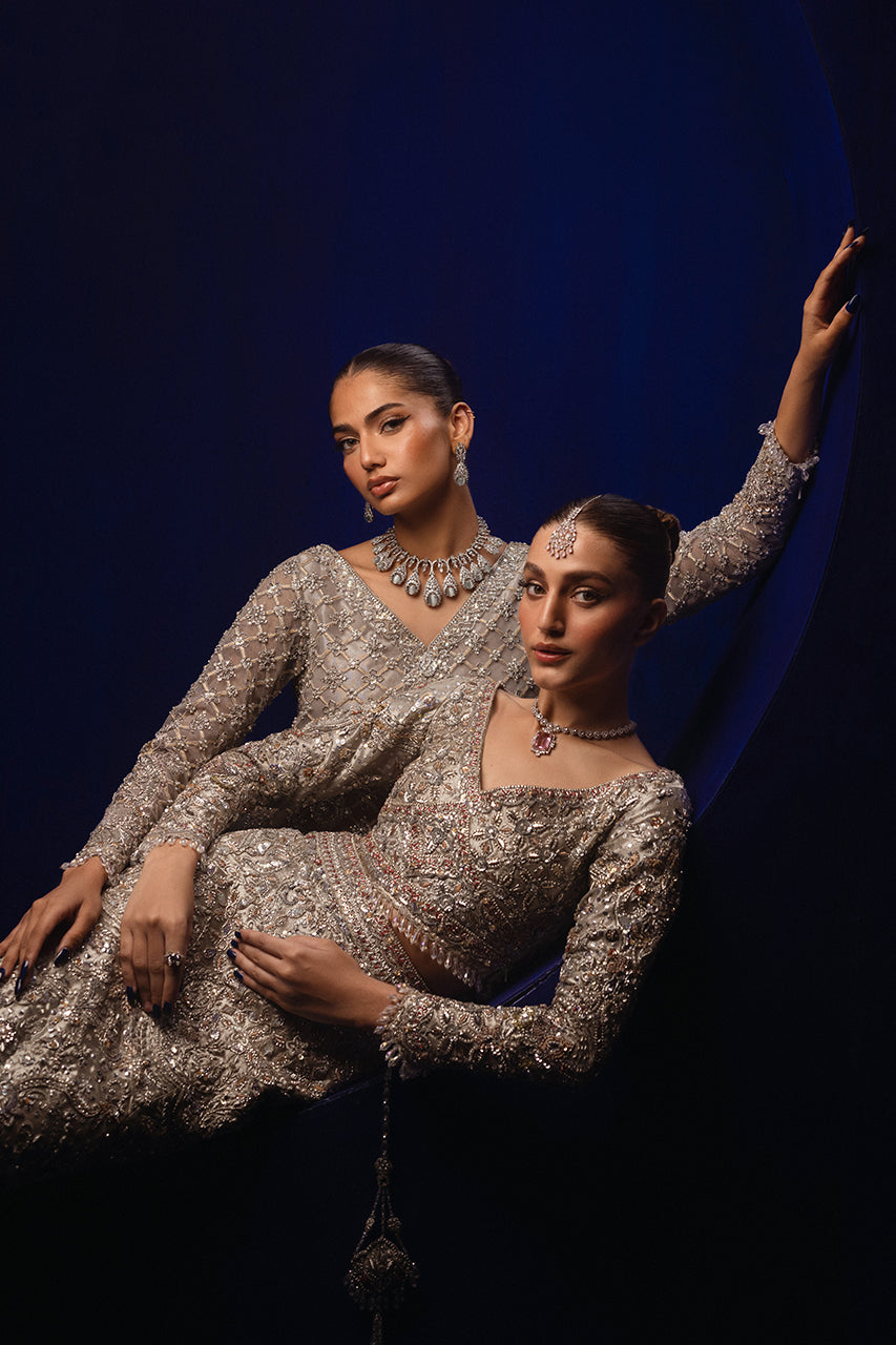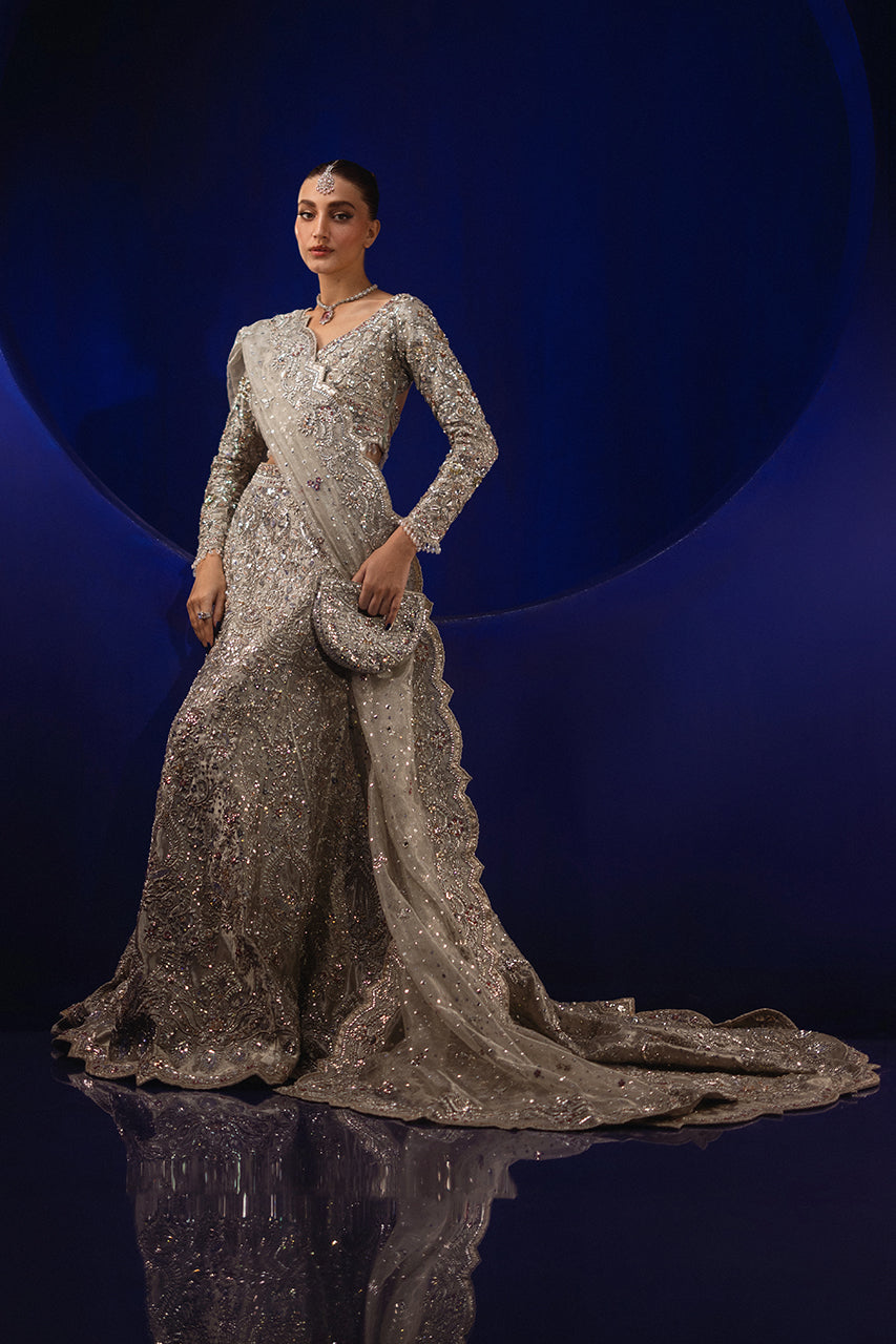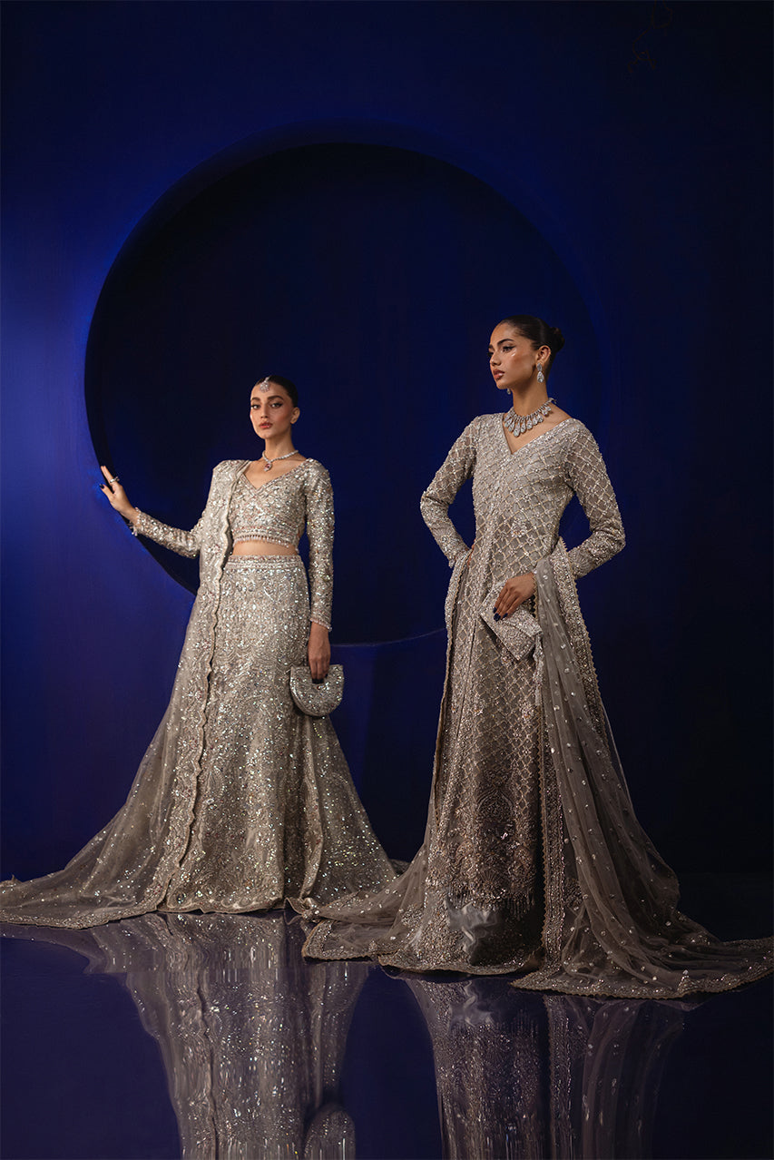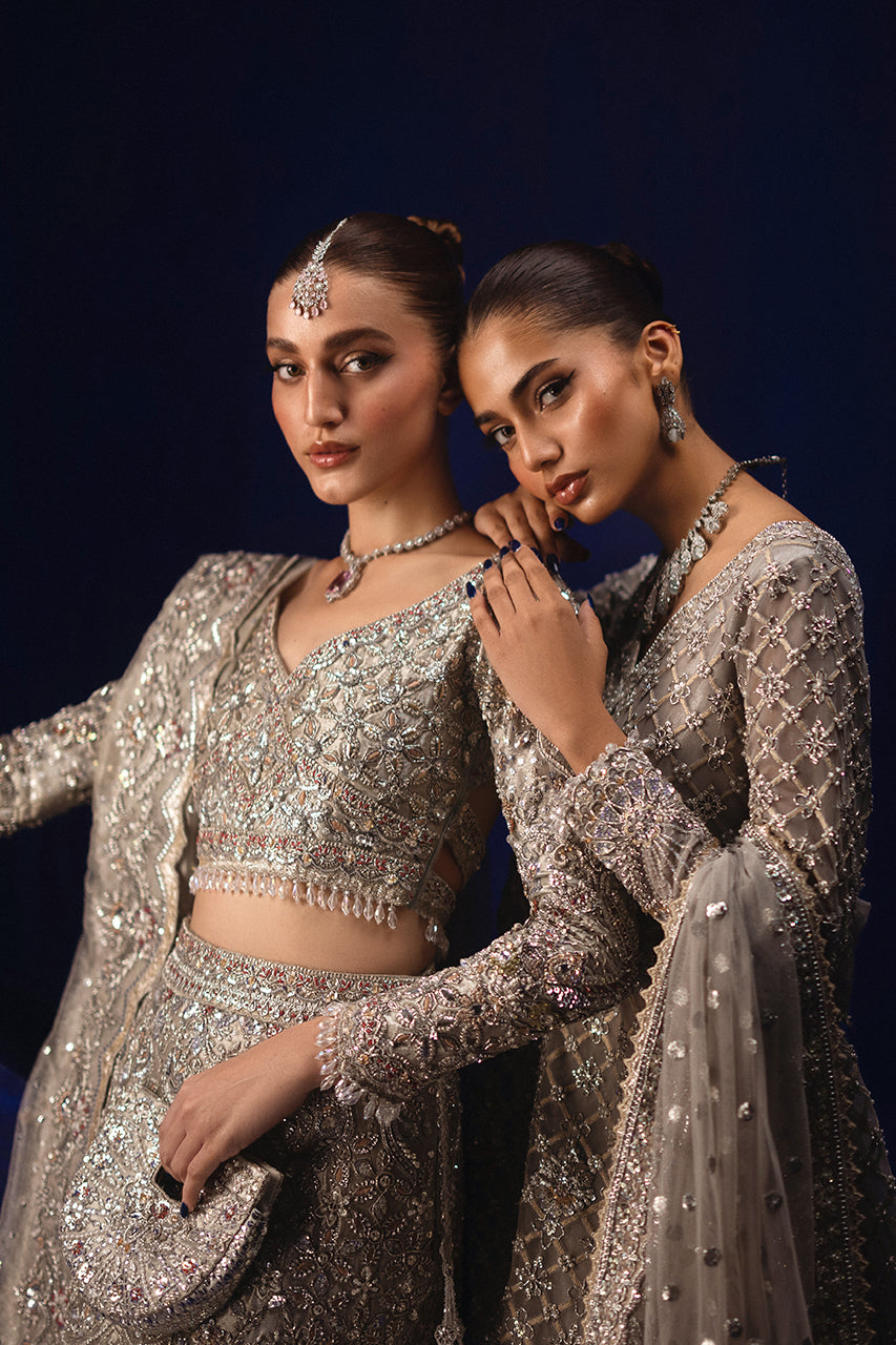 Radiate with elegance in this stunning silver lehnga choli crafted on a Masuri lame base. The choli is intricately crafted featuring graceful floral work accented with silver, and gold. Scalloped edges add elegance, while crystal hangings at the waist provide a touch of sparkle. The heavily embellished full sleeves are also finished with dangling crystals while the back-open design is further enhanced with tassels adding an alluring finish.