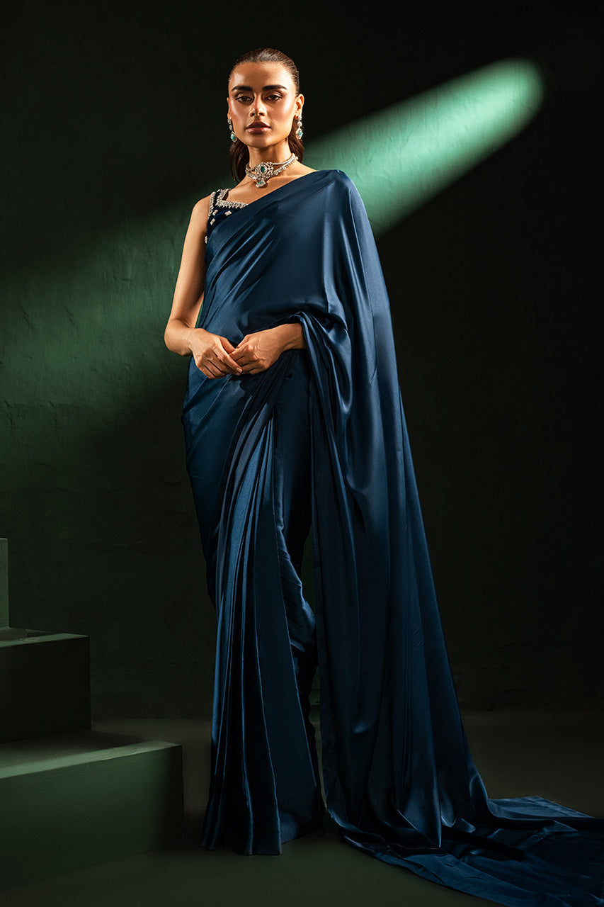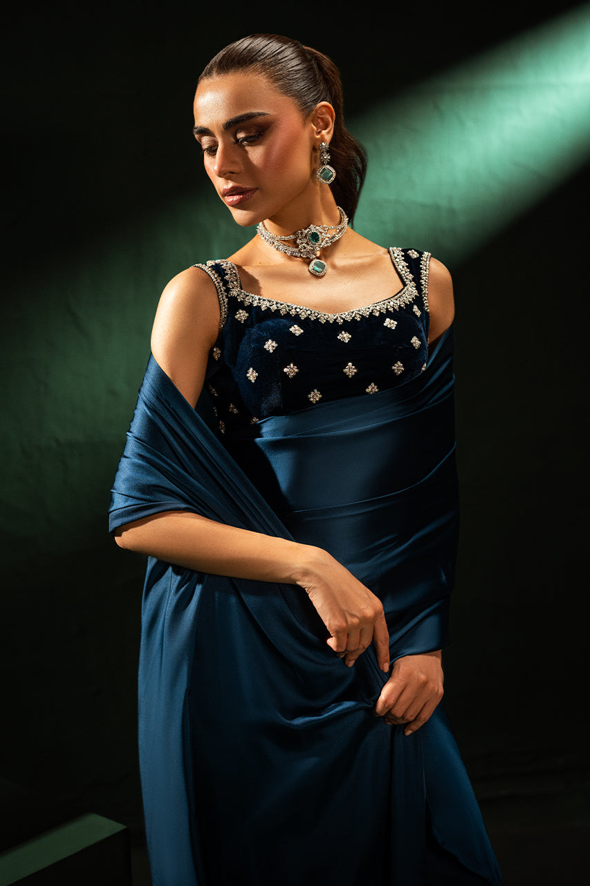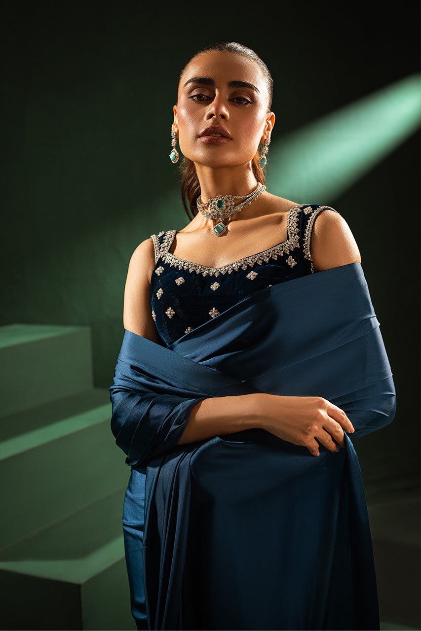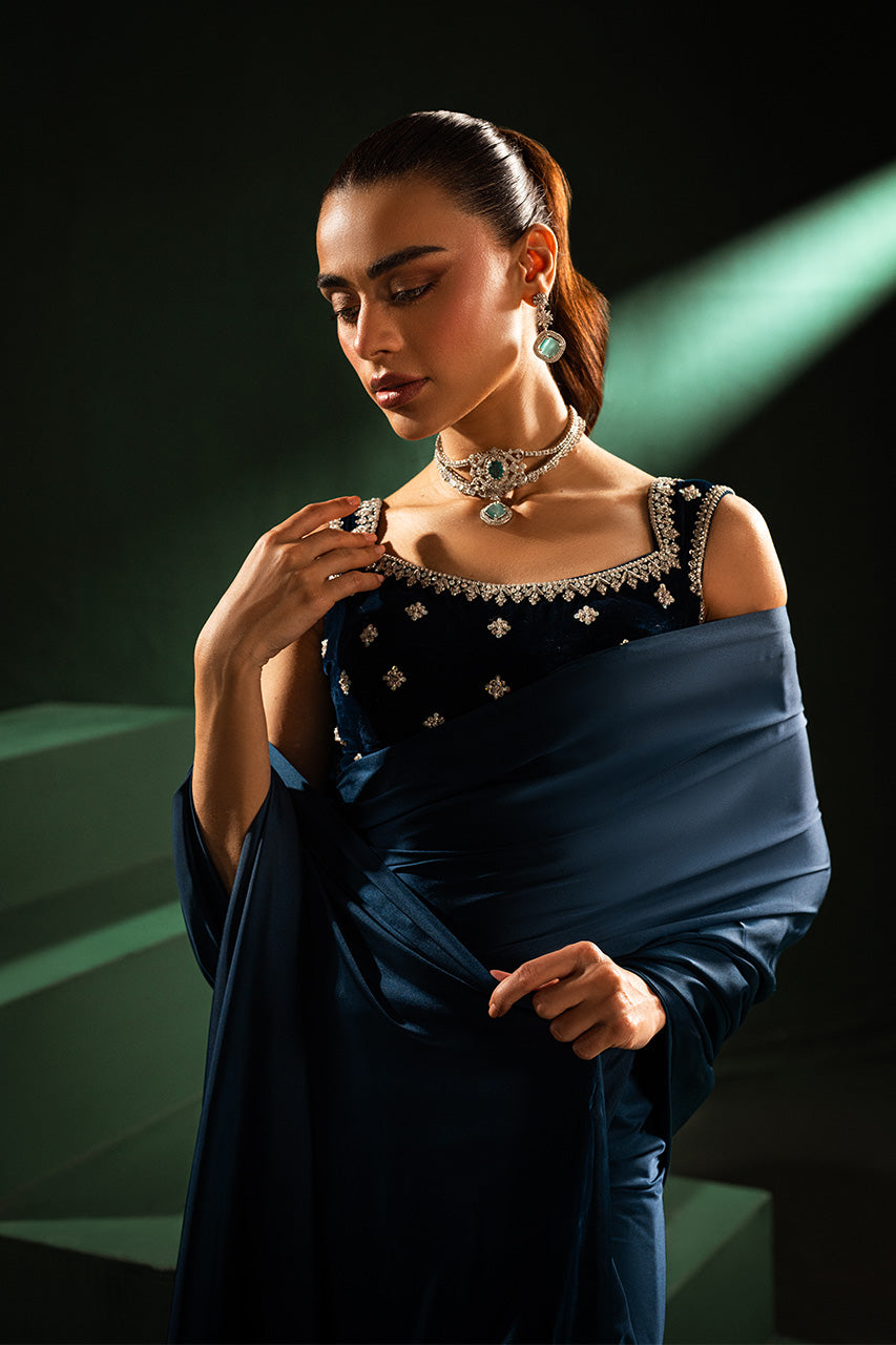 This elegant deep blue Charmeuse silk saree is paired with a luxurious velvet blouse. The blouse boasts an exquisite hand worked neckline finish and intricate botis all over. Made from soft charmeuse silk, the saree drapes beautifully and ensures comfort and style, making it ideal for festive occasions.