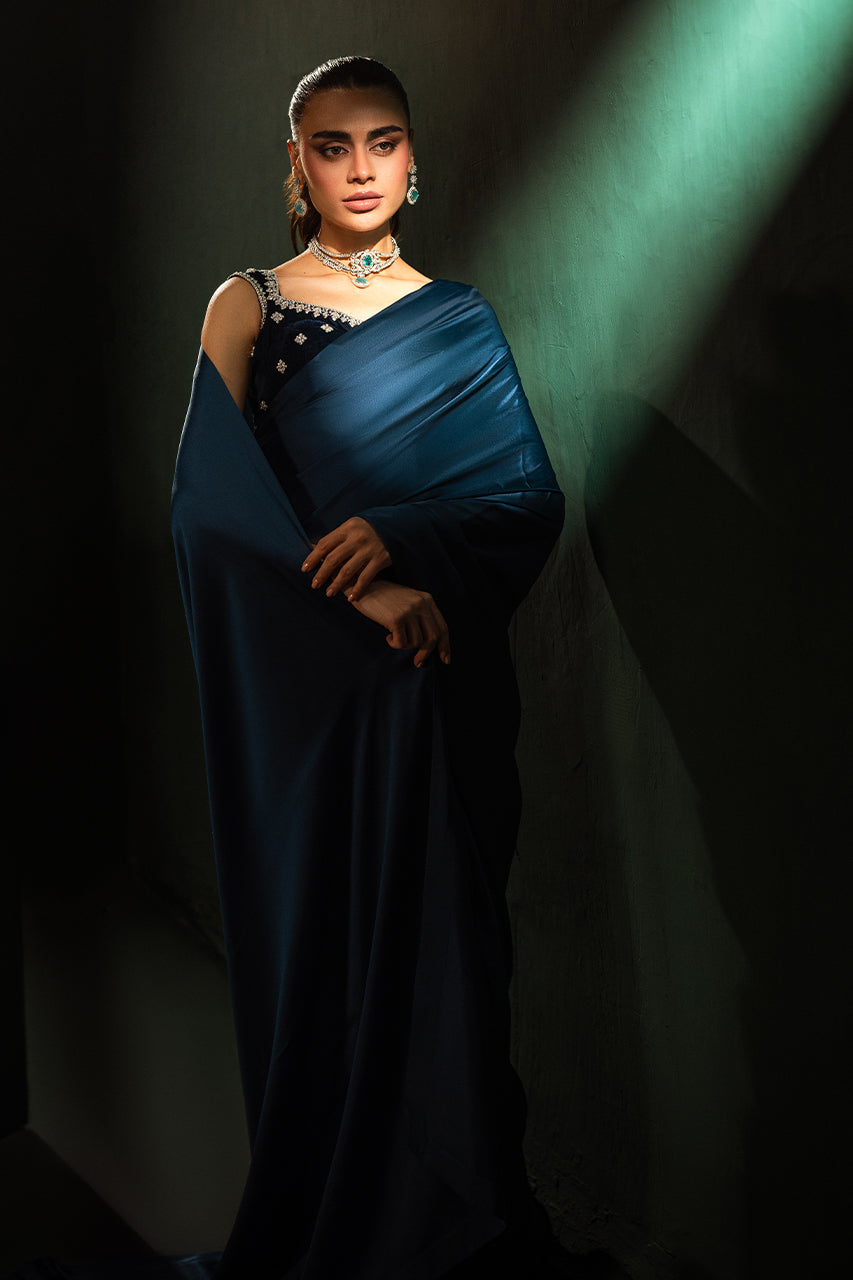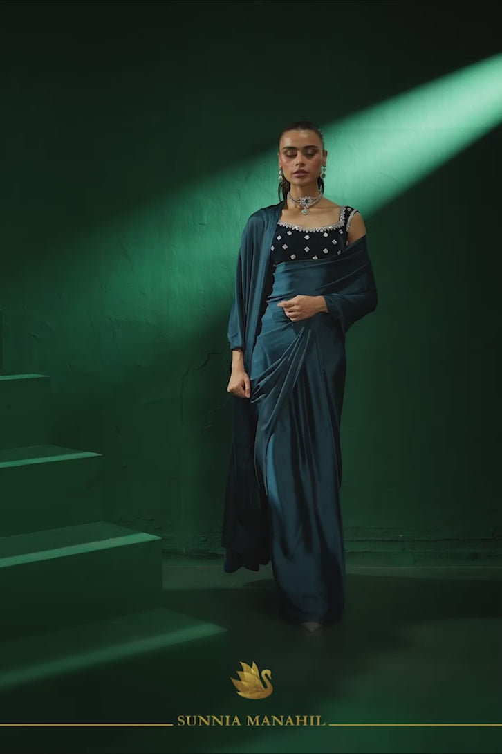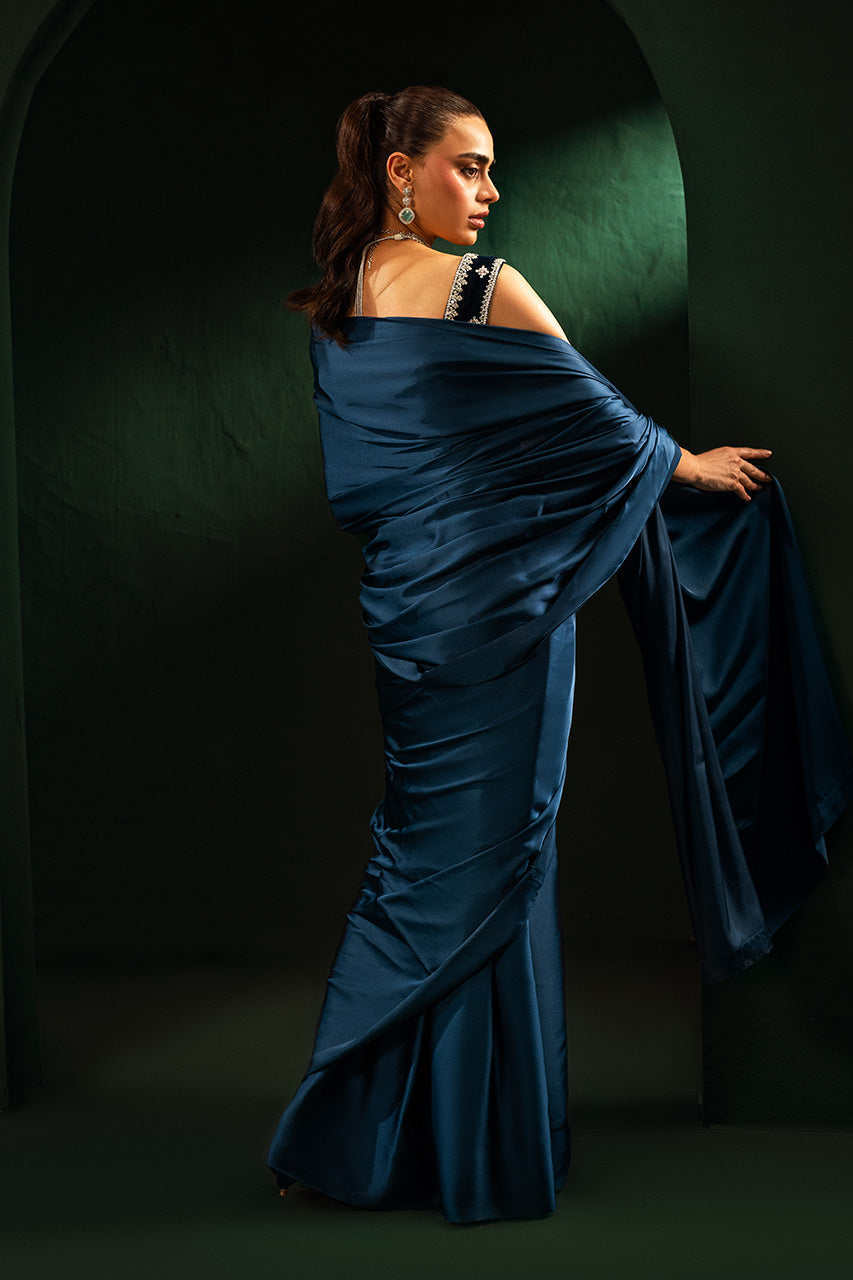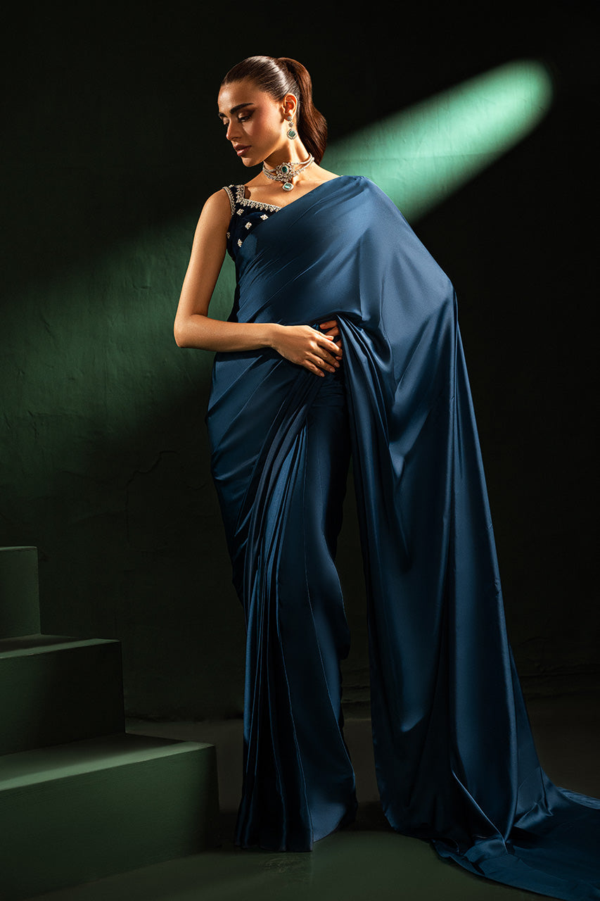 This elegant deep blue Charmeuse silk saree is paired with a luxurious velvet blouse. The blouse boasts an exquisite hand worked neckline finish and intricate botis all over. Made from soft charmeuse silk, the saree drapes beautifully and ensures comfort and style, making it ideal for festive occasions.