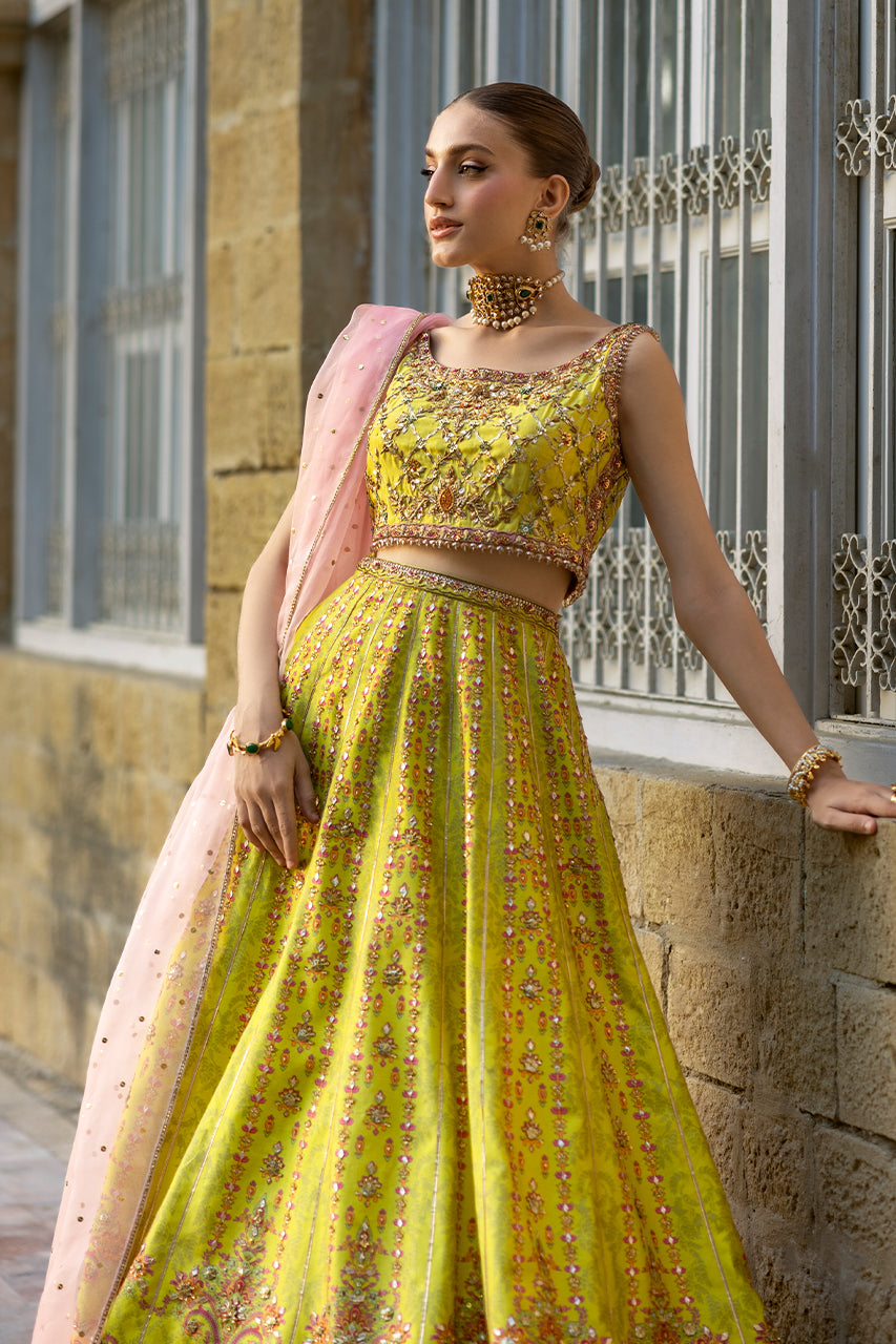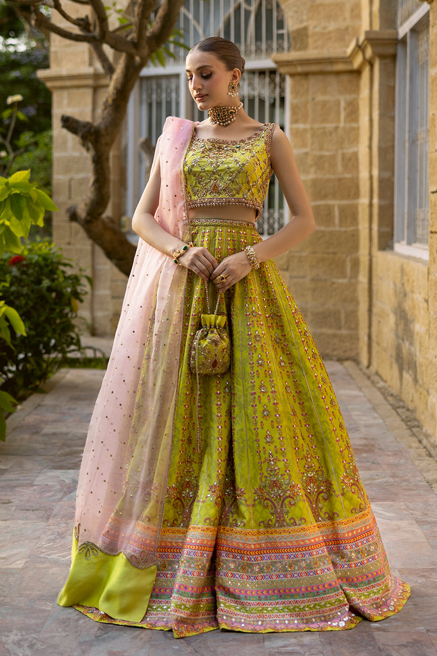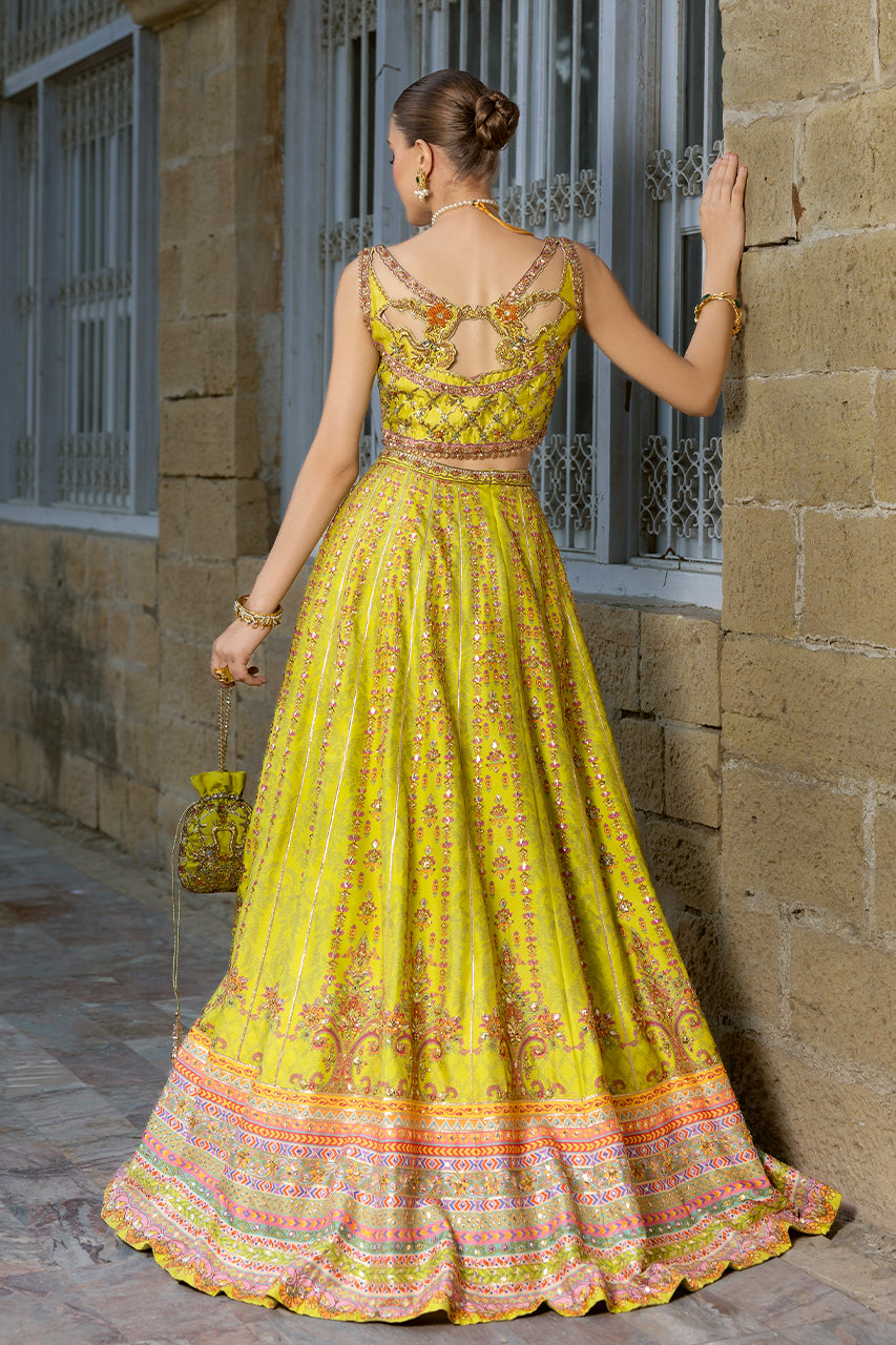 Bold yet beautifully balanced, this neon green digital silk bodice captivates with intricate all-over embroidery, blending modern vibrance with traditional artistry. The back features refined cutwork, accentuated with tassel hangings that lend movement and flair to the silhouette.
