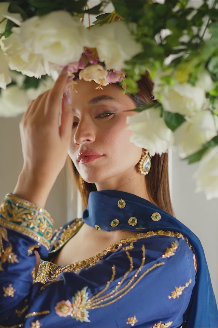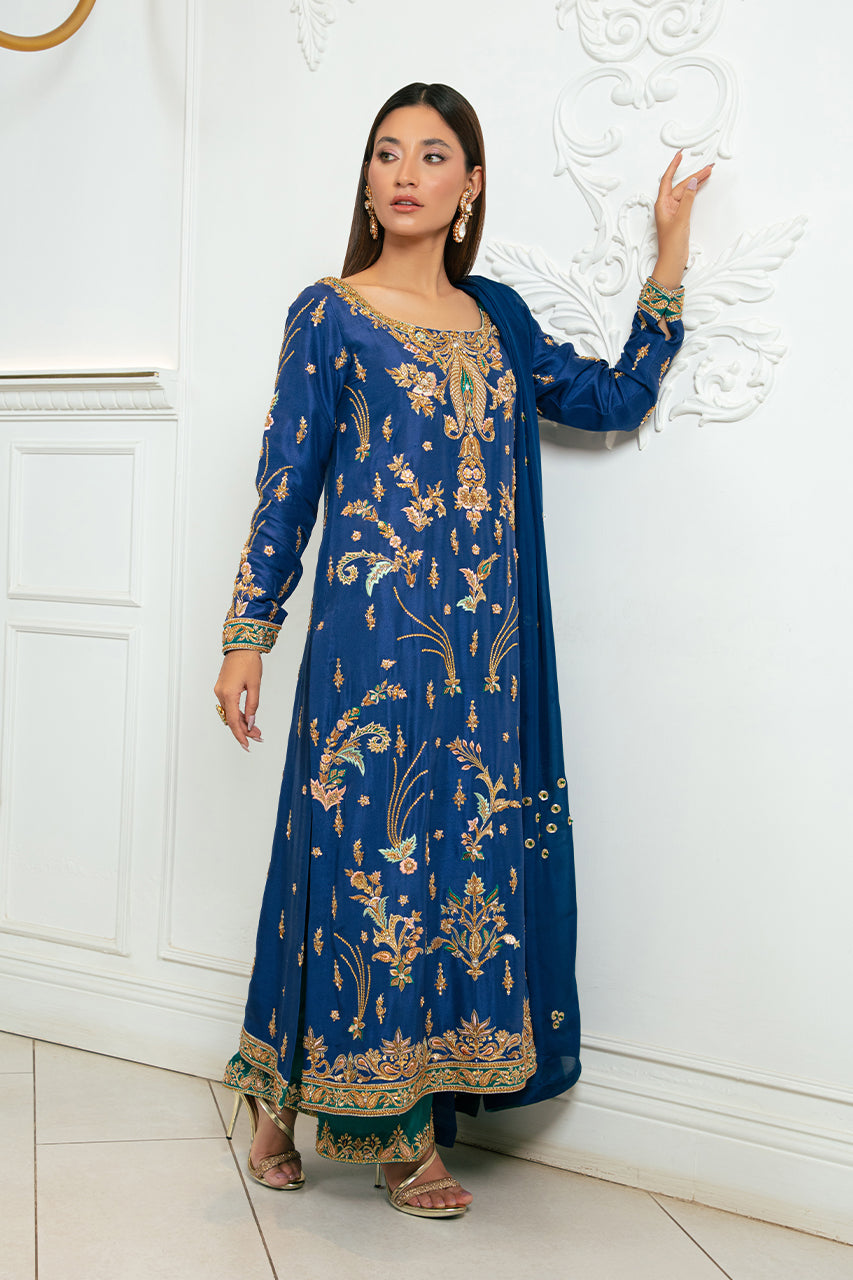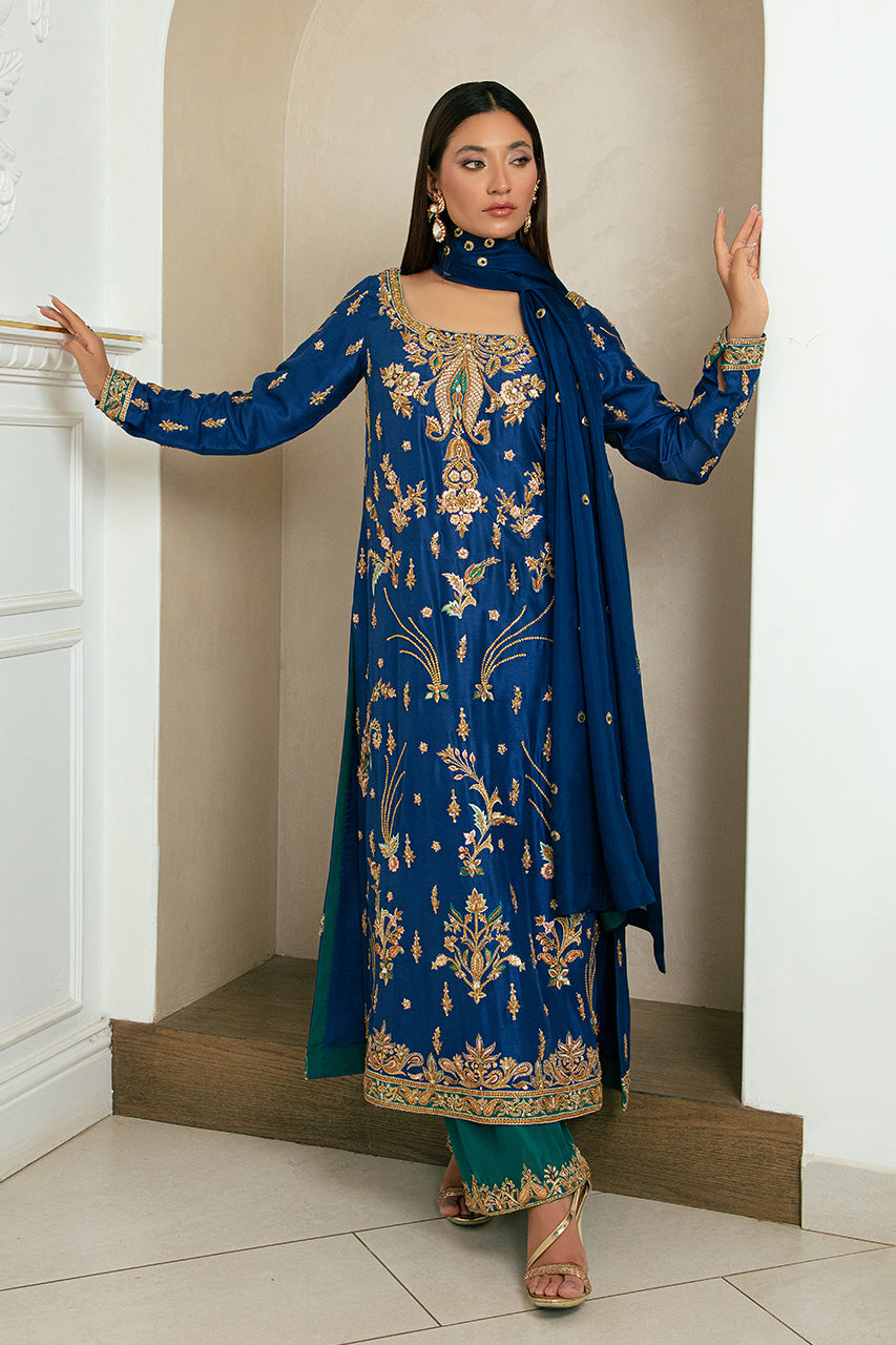 A stunning deep blue Raw Silk long shirt featuring intricate 3D hand embroidery and a thick daman border adorned with floral patterns and contrasting emerald green handwork. Pair it with emerald green Raw Silk Izaar pants, beautifully embellished with a hand-embroidered border. Complete the look with a complimenting blue silk dupatta adorned with delicate 3D spray design.