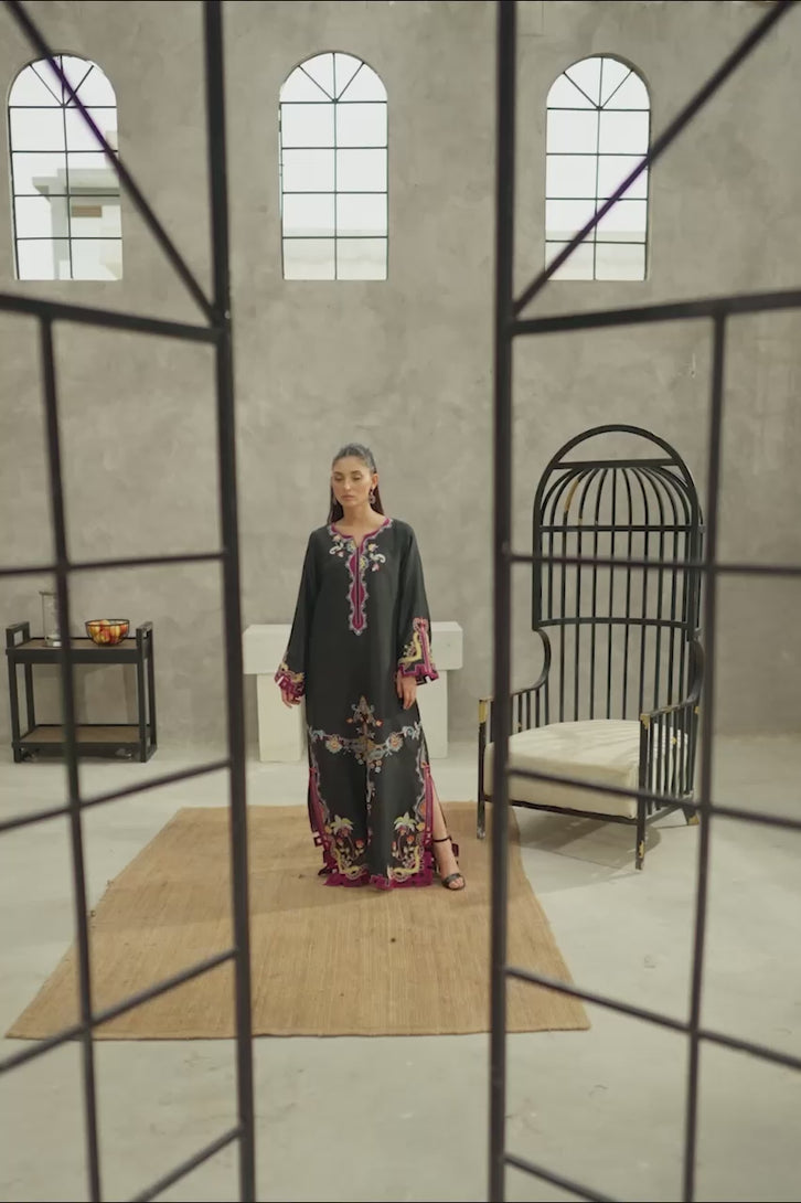 Drenched in the richness of pure black raw silk, this floor length kaftan is a vision of opulence and grace. The sweeping silhouette is anchored by a lavishly embroidered hem, with intricate embroidered and appliqued patterns and delicate cutwork along the sides and billowing sleeves, allowing subtle glimpses of skin while enhancing its ethereal charm. Designed to flow effortlessly with every movement, it embodies timeless glamour — a true statement of luxury and refined craftsmanship.