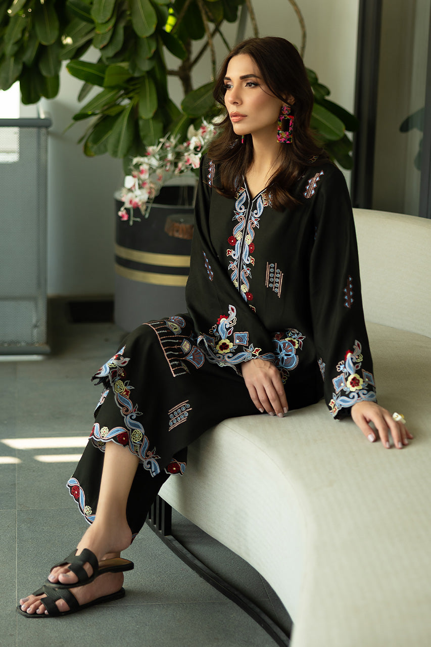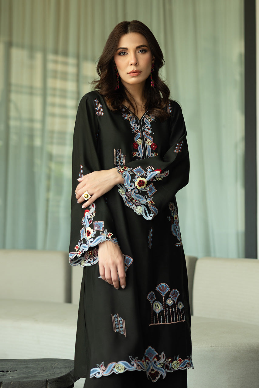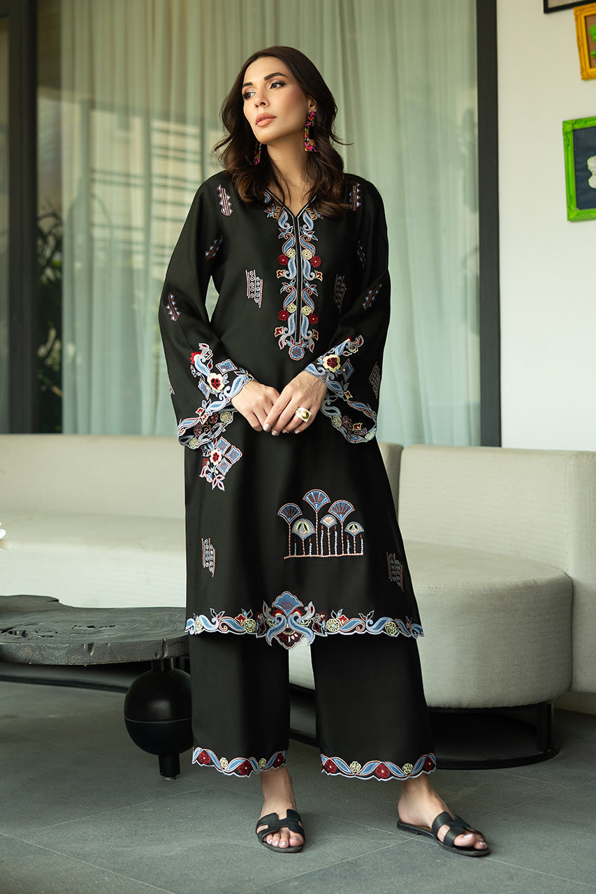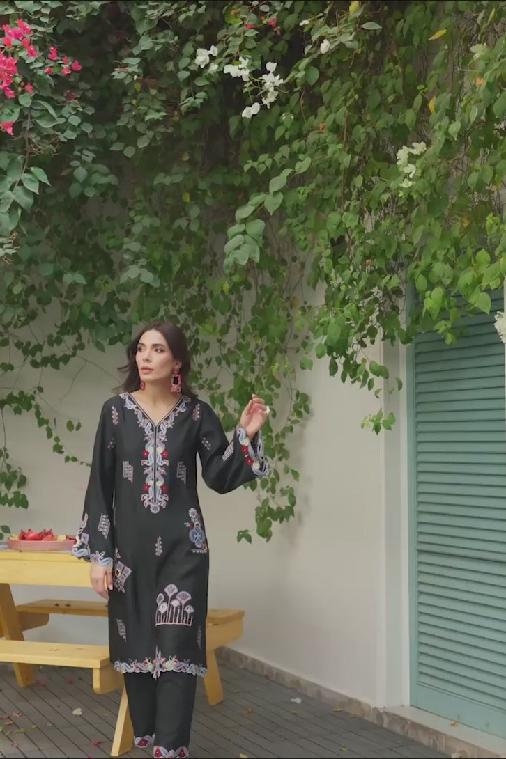 A black khaddi silk shirt featuring intricate embroidery in tones of red, ivory, powder blue, and grey. The design blends stylized florals, fan motifs, and abstract forms, arranged in a rhythm that draws the eye across the neckline, sleeves, and daman. Central vines are paired with geometric blocks and curved accents, offering contrast through both color and shape. Appliqué touches and scalloped sleeve edges bring texture and finish to the look. Paired with black khaddi cotton izaar pants featuring a coordinated embroidered hem, Zairah is a confident expression of bold detailing and feminine edge.
