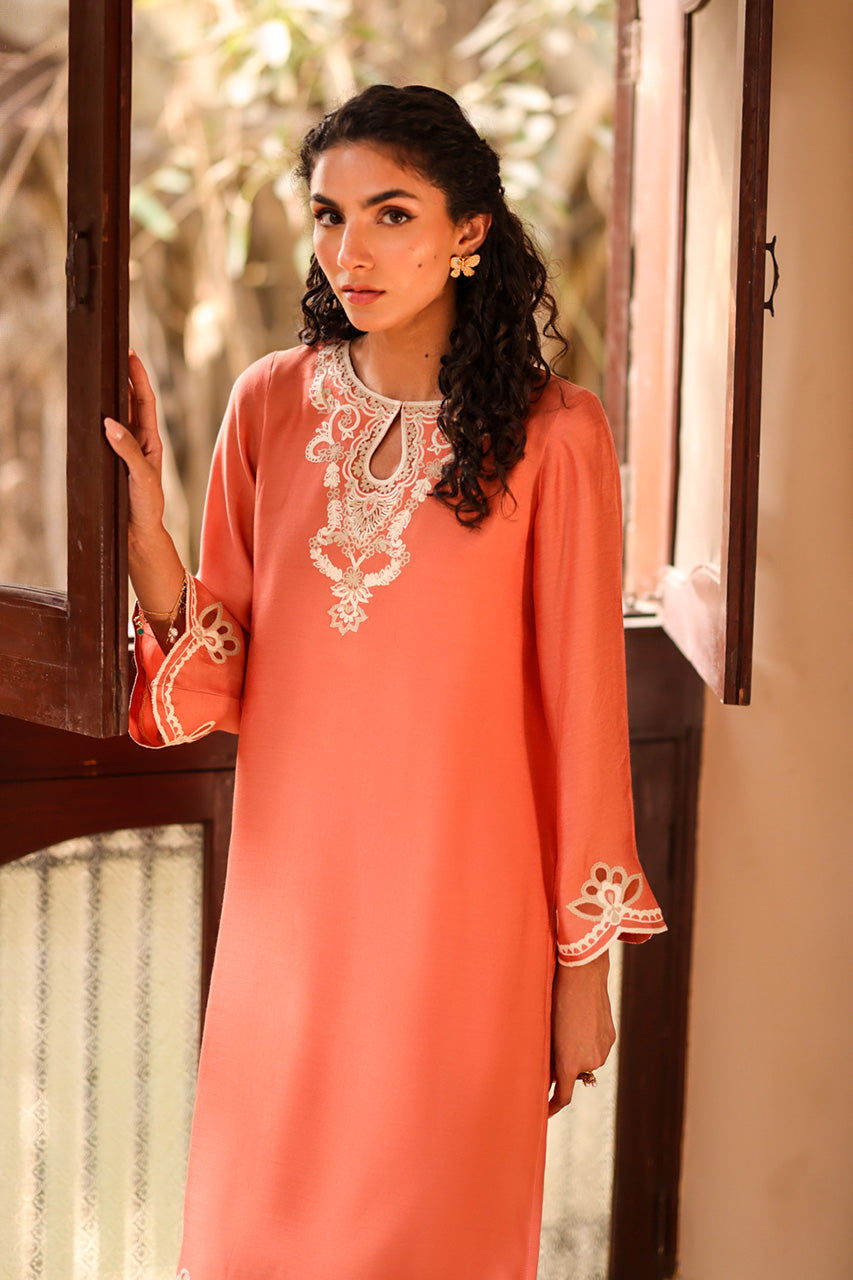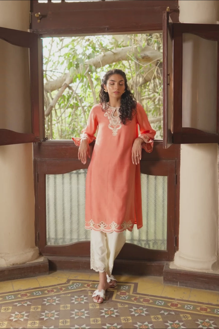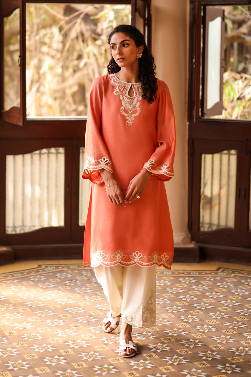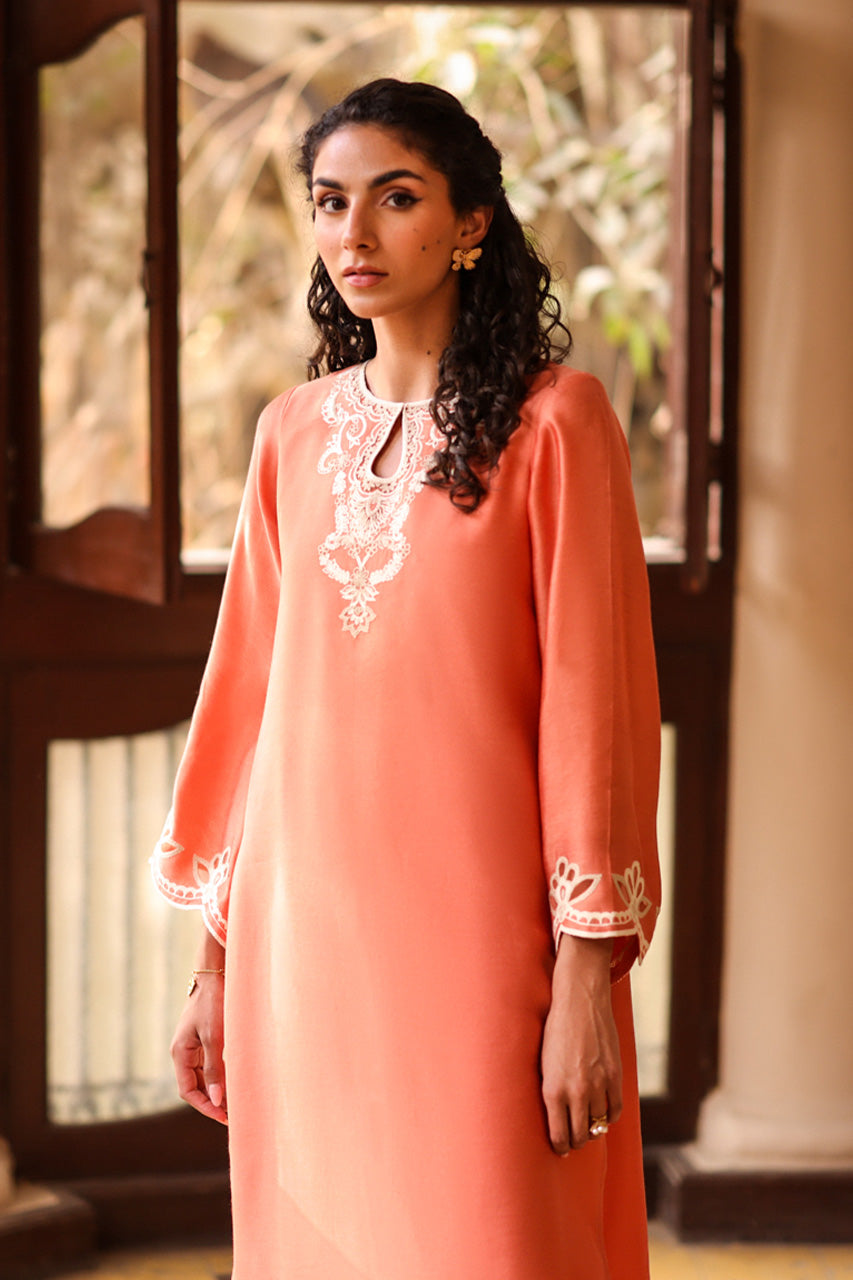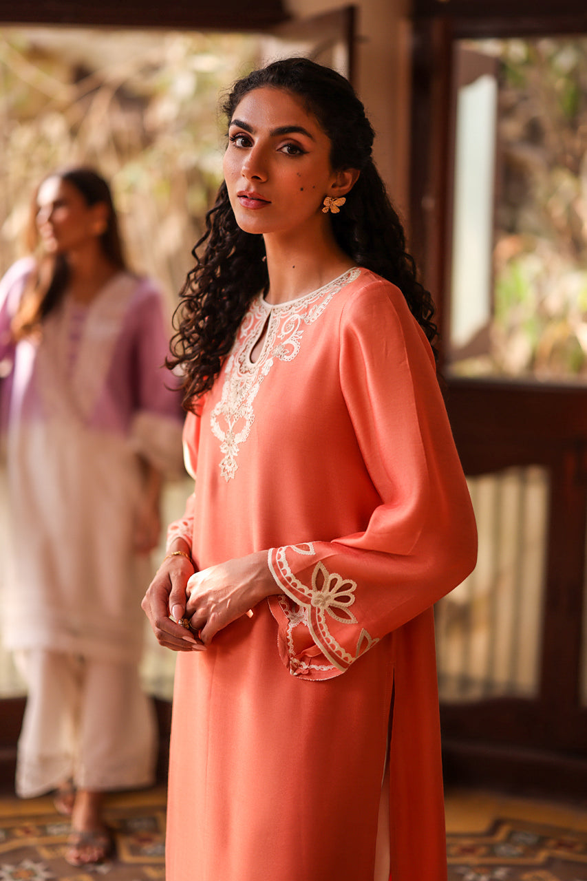 Zane is a summer-perfect comfy fit featuring a knee length orange Khaddi silk shirt with Ari worked neckline, sleeves, and bottom of the shirt. The stunning look is completed with worked cotton pants, making it a chic fit for your daily attire.