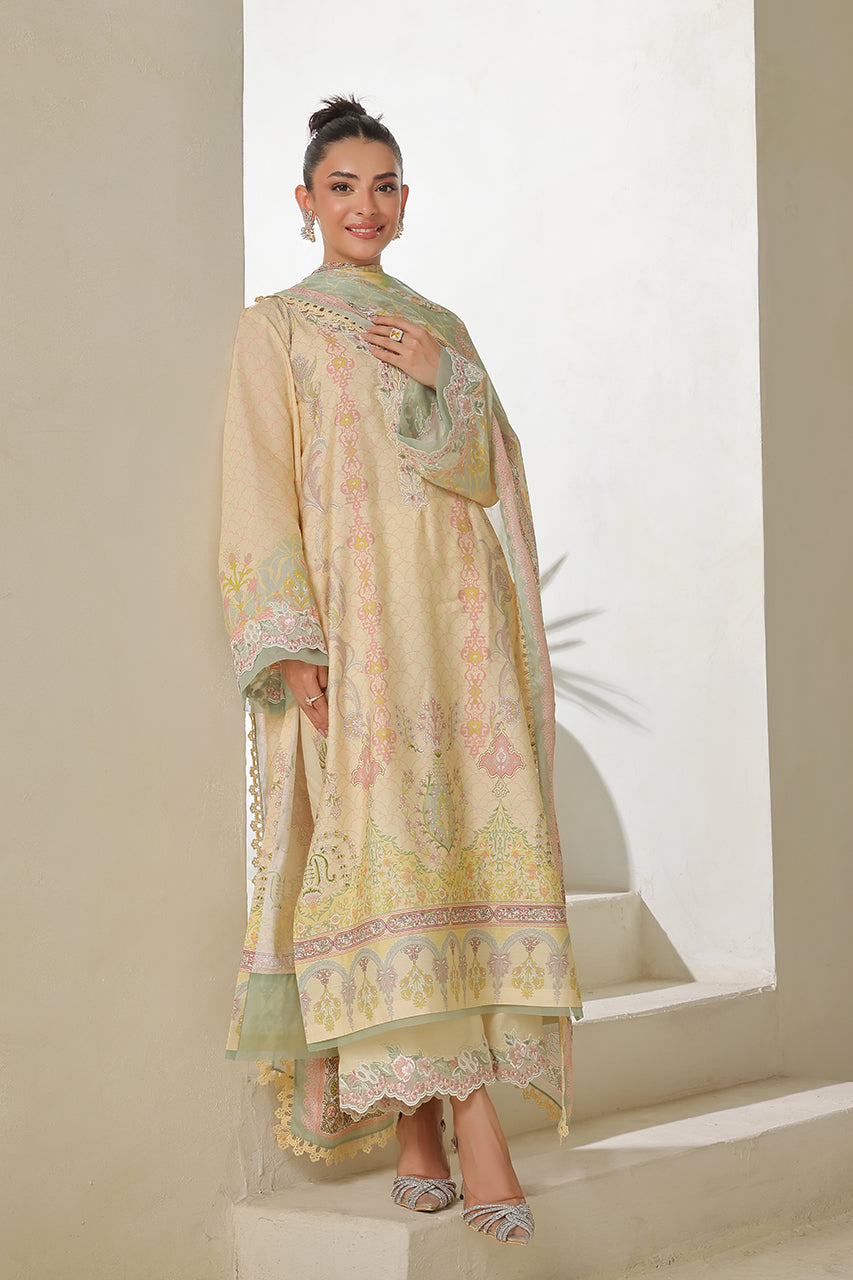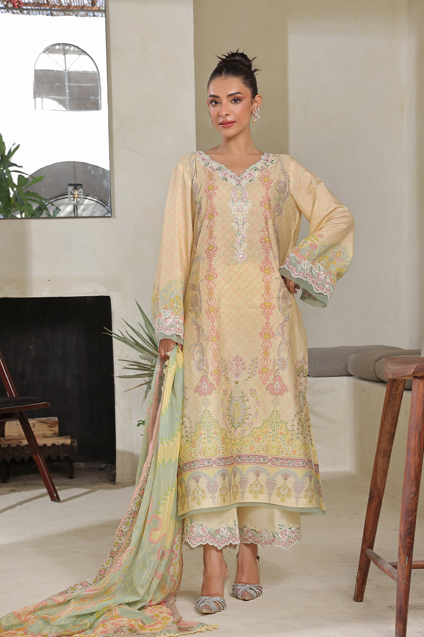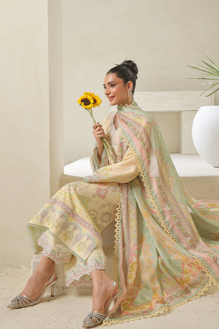 Brighten your wardrobe with this radiant three-piece ensemble, featuring a long yellow kora digital shirt adorned with intricate appliqué thread work on the neckline and sleeves. The shirt showcases beautiful digital prints throughout, creating a vibrant yet graceful aesthetic. Paired with a matching yellow kora digital dupatta, delicately finished with lace work all over, the ensemble exudes effortless sophistication. Completing the look are khaddi cotton izaar pants, beautifully embroidered to add depth and artisanal charm—perfect for festive days or celebratory evenings.