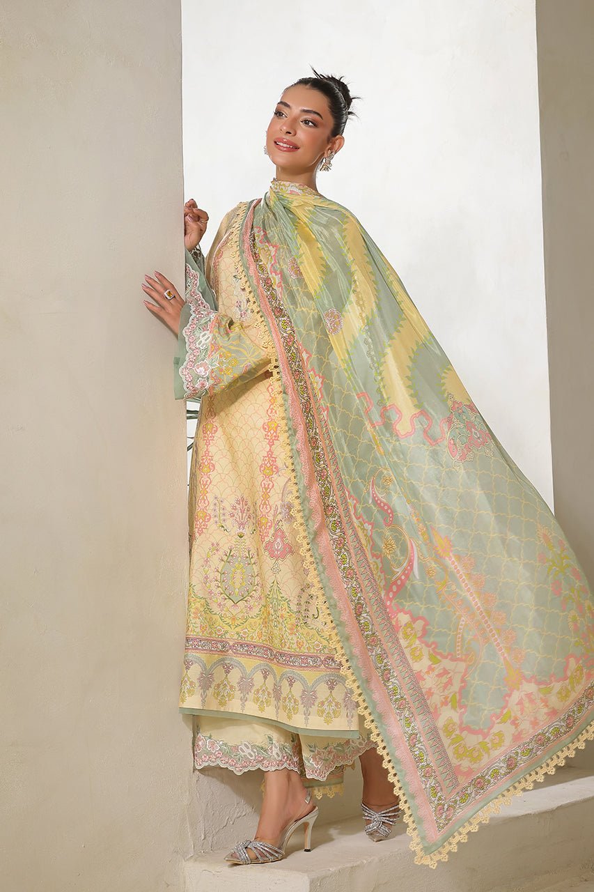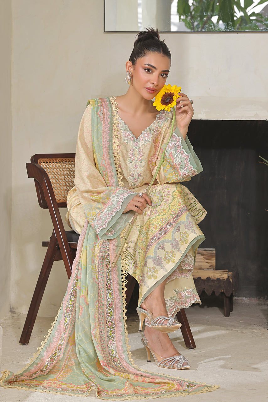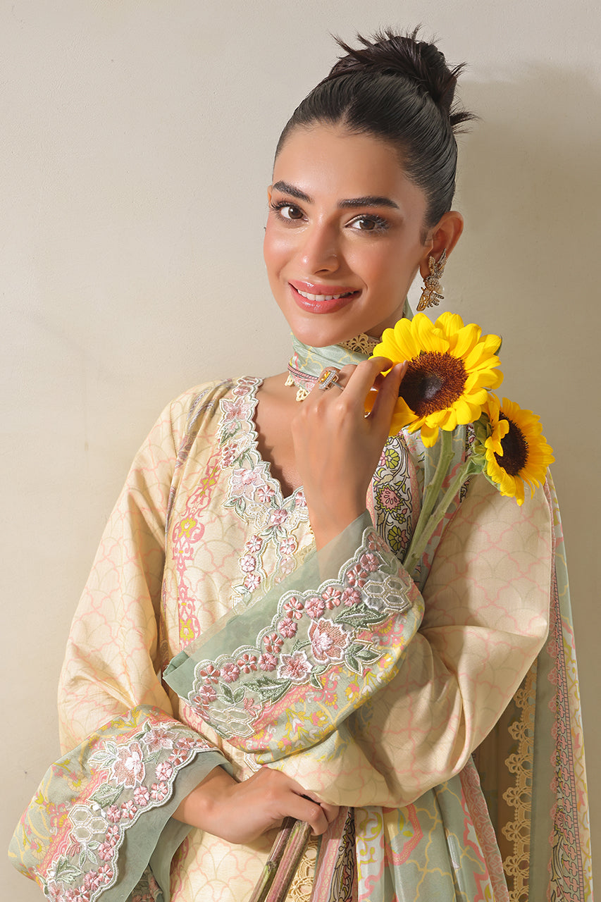 Brighten your wardrobe with this radiant three-piece ensemble, featuring a long yellow kora digital shirt adorned with intricate appliqué thread work on the neckline and sleeves. The shirt showcases beautiful digital prints throughout, creating a vibrant yet graceful aesthetic. Paired with a matching yellow kora digital dupatta, delicately finished with lace work all over, the ensemble exudes effortless sophistication. Completing the look are khaddi cotton izaar pants, beautifully embroidered to add depth and artisanal charm—perfect for festive days or celebratory evenings.